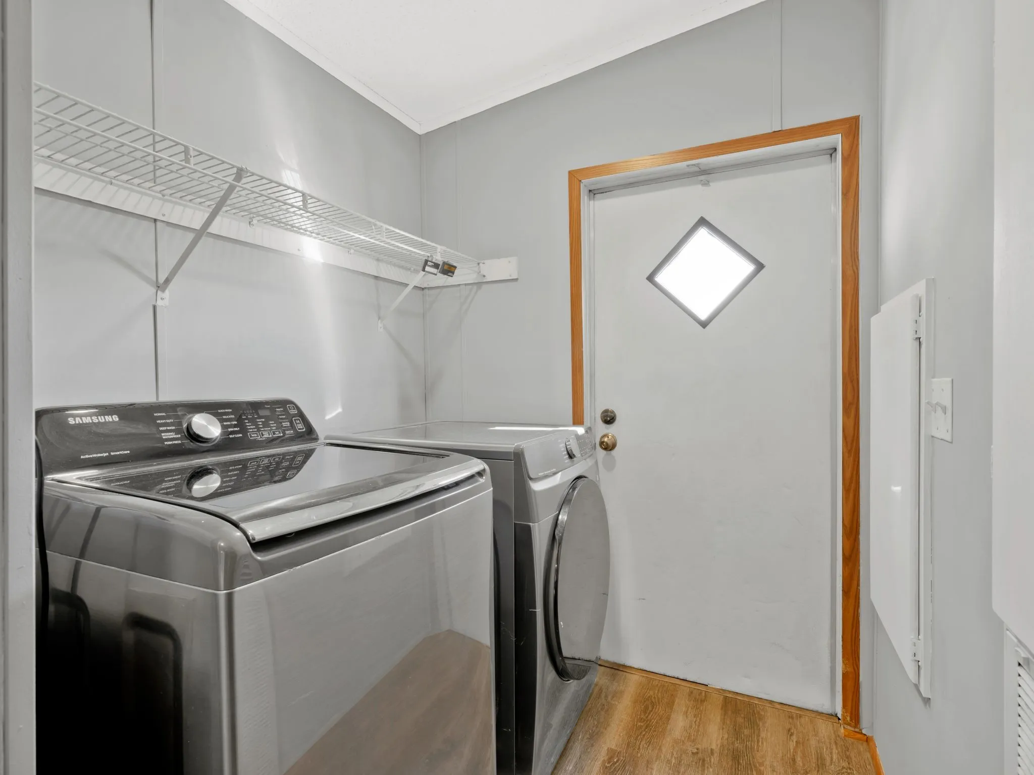 From the front of the home step into the large open living room with vinyl floors that flow into the kitchen and the laundry room equipped with a modern Samsung washer and dryer which convey with the purchase .