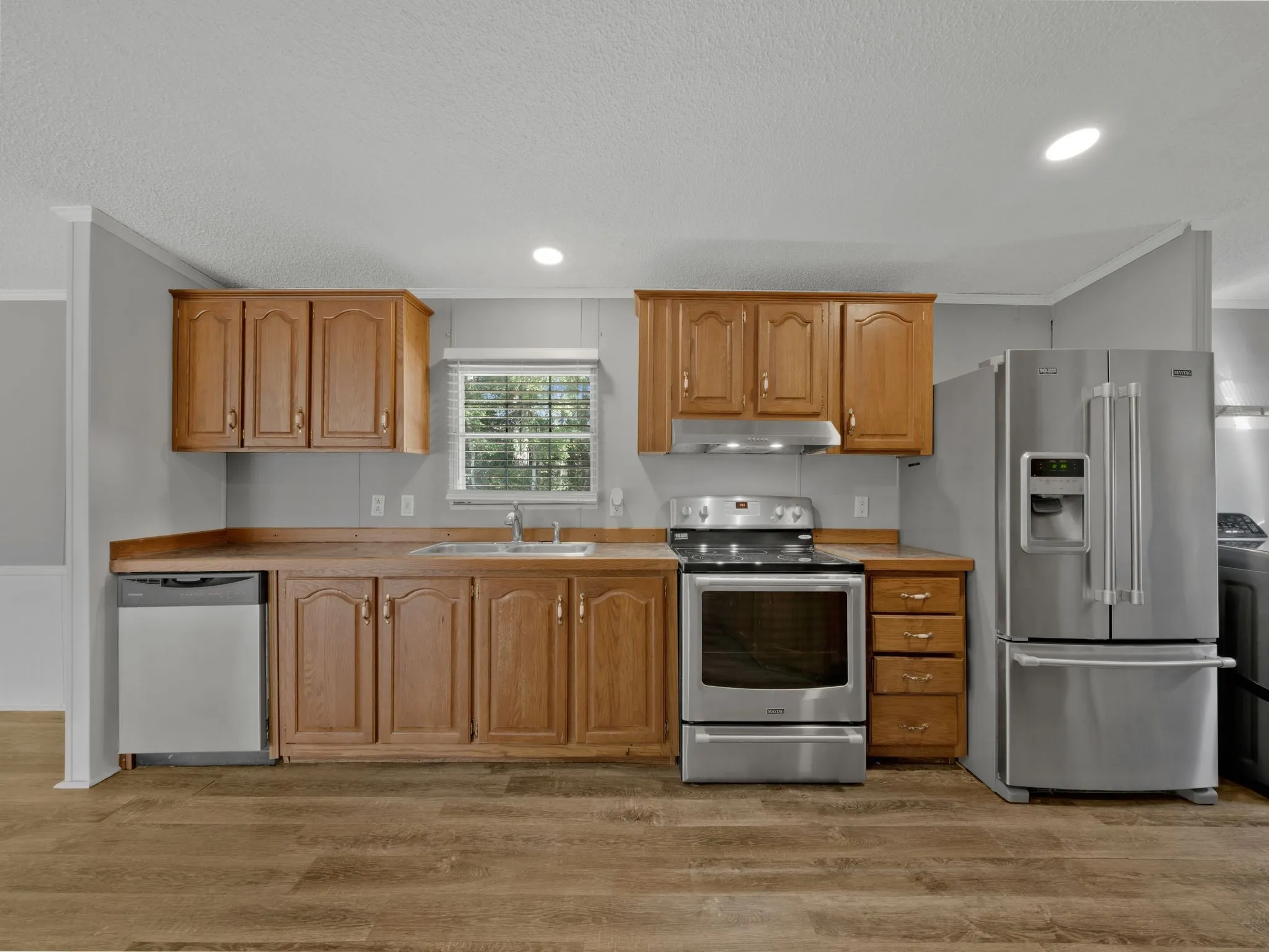 The kitchen has plenty of countertop space, ample cabinets, a pantry and stainless steel Maytag appliances still under manufacturer’s warranty.