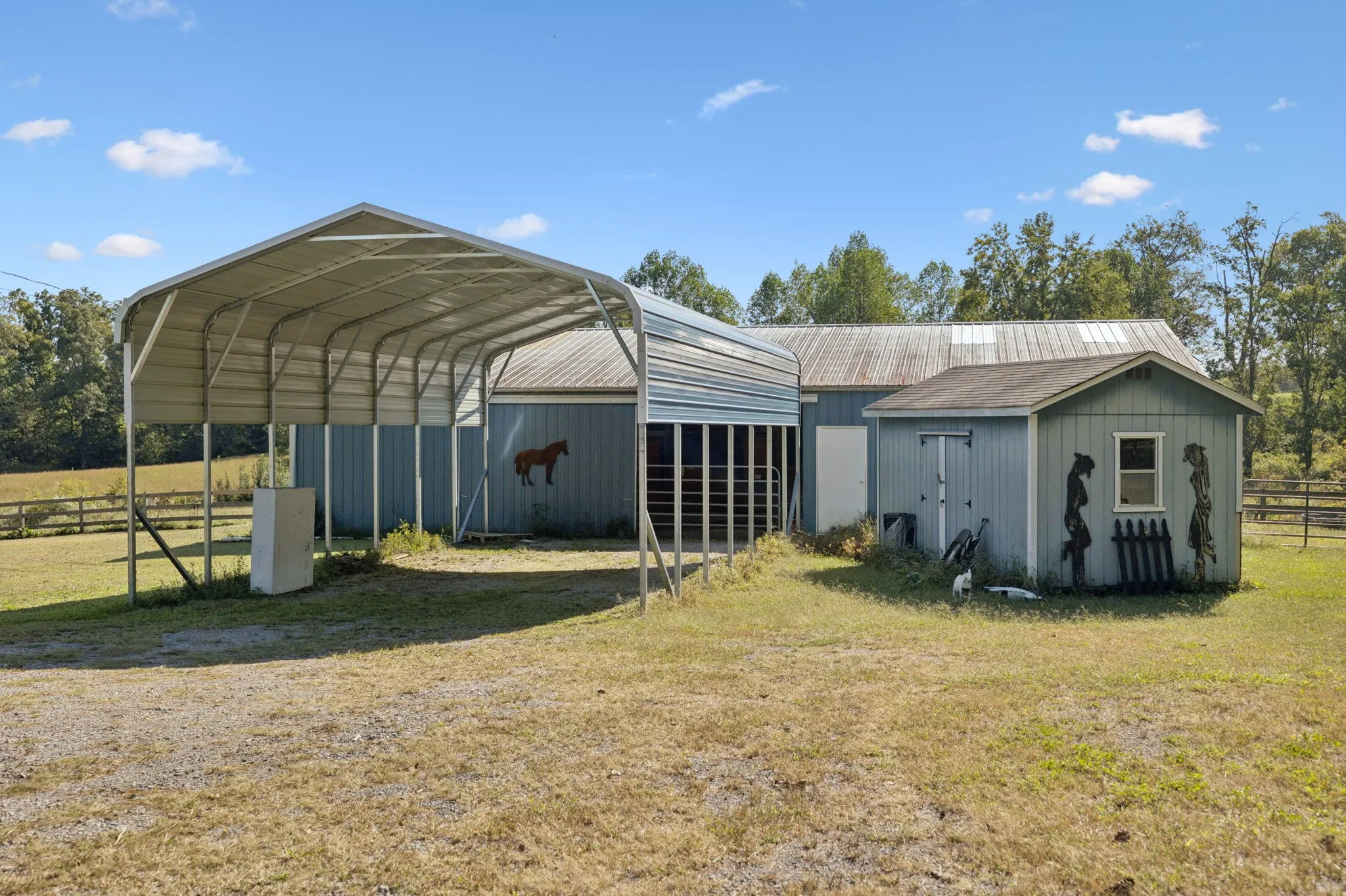 +"PublicRemarks": "Bring your horses and enjoy country living on this 15.73 acre property complete with two barns, fenced pasture, and plenty of room to spread out. The main barn offers 8 stalls, a tack room, hay storage, and full water/electric, while the smaller barn features 4 stalls with water and electric as well. A horse run-in and cross fencing make this property ready for your livestock. The 3 bedroom, 2 bath home includes an office with a private entry and ramp, LVP flooring in the living room, laminate throughout the rest of the home, and updated systems for peace of mind. Recent improvements include a tin roof (2023), HVAC (approx. 2023), new sewer and field lines (2024), and structural reinforcement with flooring by TFS (2018). Other features include a 1-car garage, security cameras, and charming country touches.This property blends comfortable living with fully equipped equestrian facilities—perfect for anyone seeking a hobby farm or working horse setup."