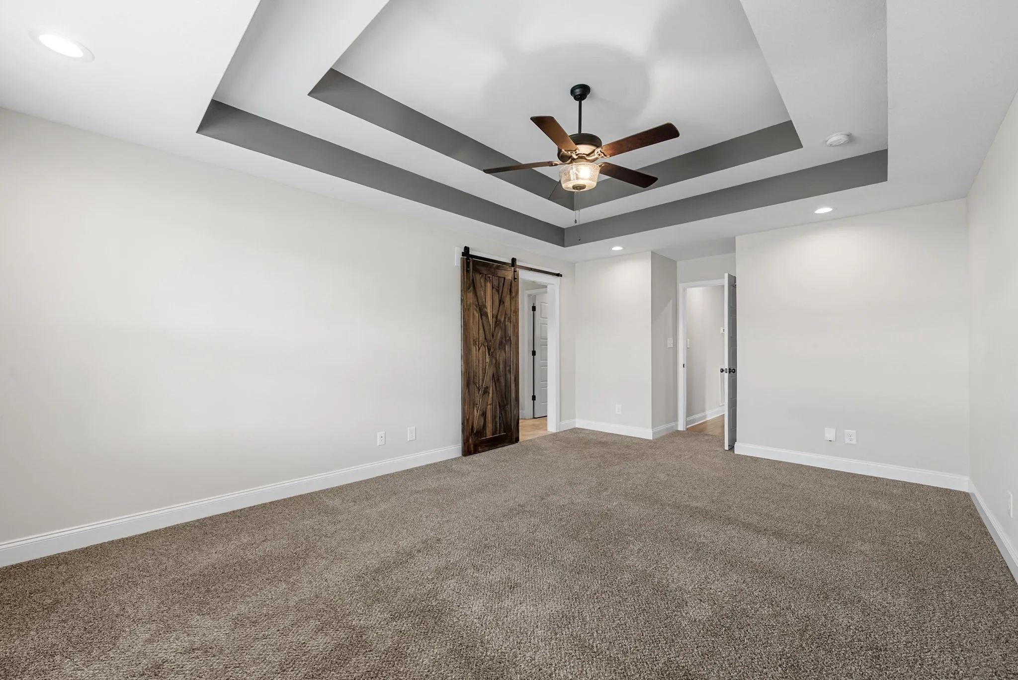 The primary suite offers charming barn-style doors, elegant tray ceilings, and a luxurious ensuite bathroom with dual sinks and a tiled standing shower.