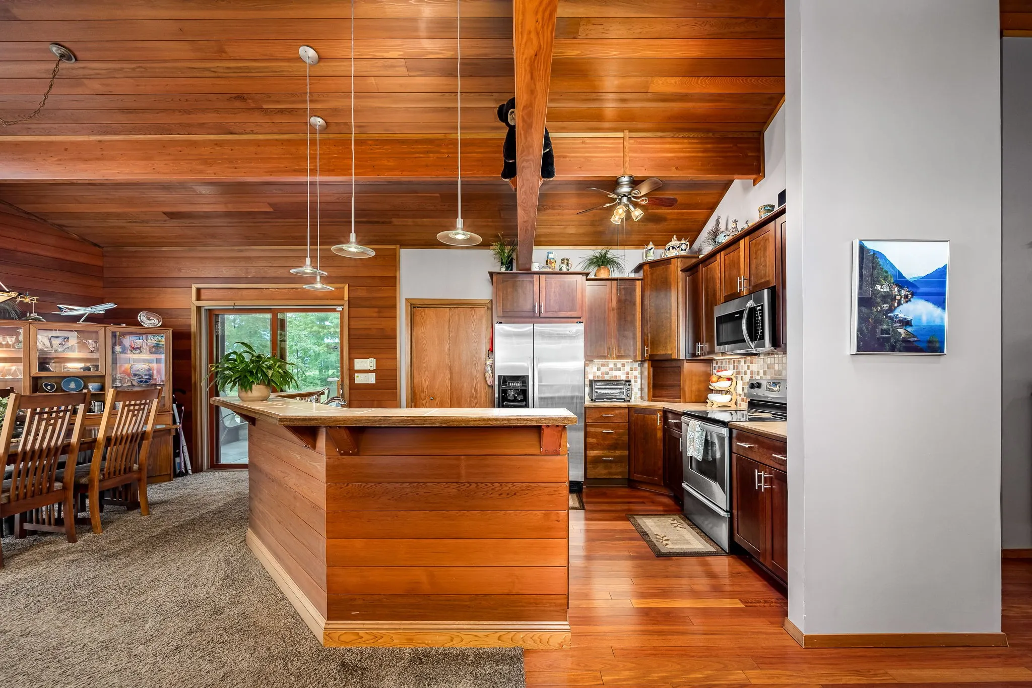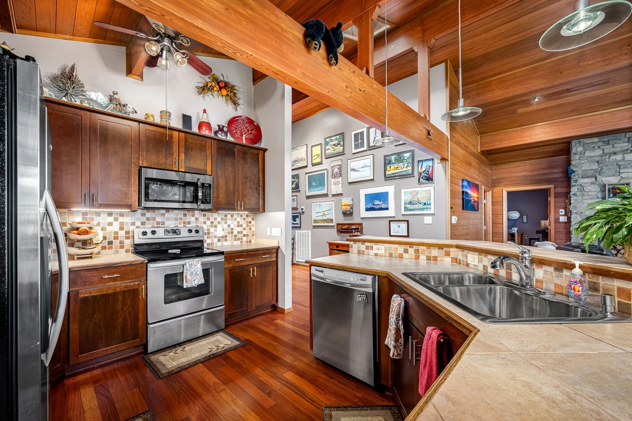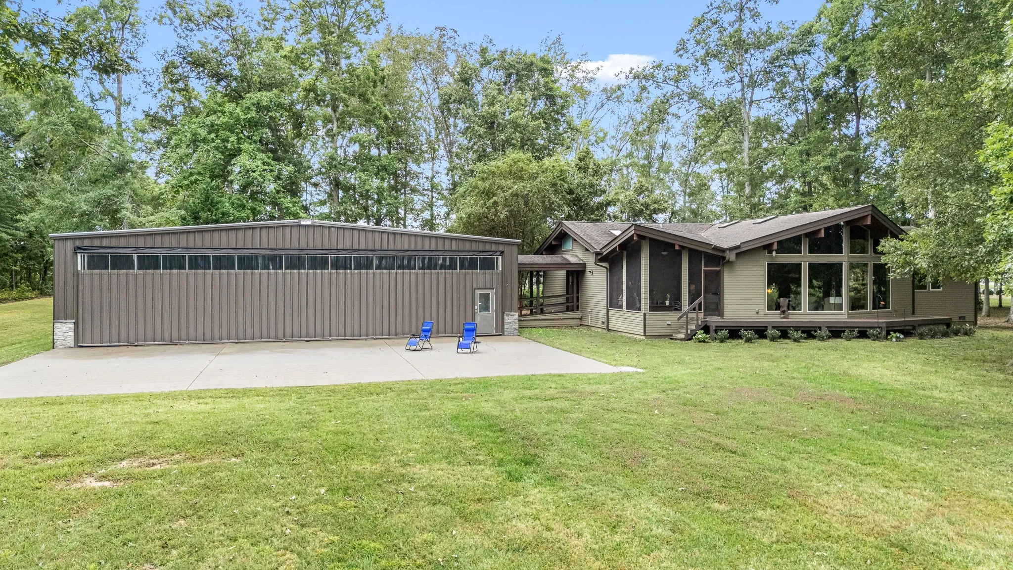 IDEAL FOR AVIATION ENTHUSIASTS, this home sits on 1.34 acres with breathtaking views of the grass strip KHTA 9/27 from all main living areas. Enter the custom built home through a skylighted foyer and into soaring red cedar vaulted ceilings & beams by Lindal Homes. A rugged stone fireplace anchors the open Living Room and Kitchen/Dining area. Kitchen features a wraparound bar, perfect for entertaining. From the Kitchen step onto the covered screened porch overlooking the grass strip and hangar apron which serves as a perfect place for entertaining friends and watching the sunset or an impromptu air show! The primary bedroom suite offers vaulted ceiling w/skylight, while the luxurious bath boasts striking ruby red wash bowls brought from Japan, a soaking tub, tiled shower & heated tiled floors. Home also has a large office with walk-in closet for storage. Two guest bedrooms, each with their own bath ensure comfort and privacy. Outside you’ll find a massive 50′ x 60′ hangar w/12′ clearance. Hangar also serves as a grage for vehicles with front entry garage door.