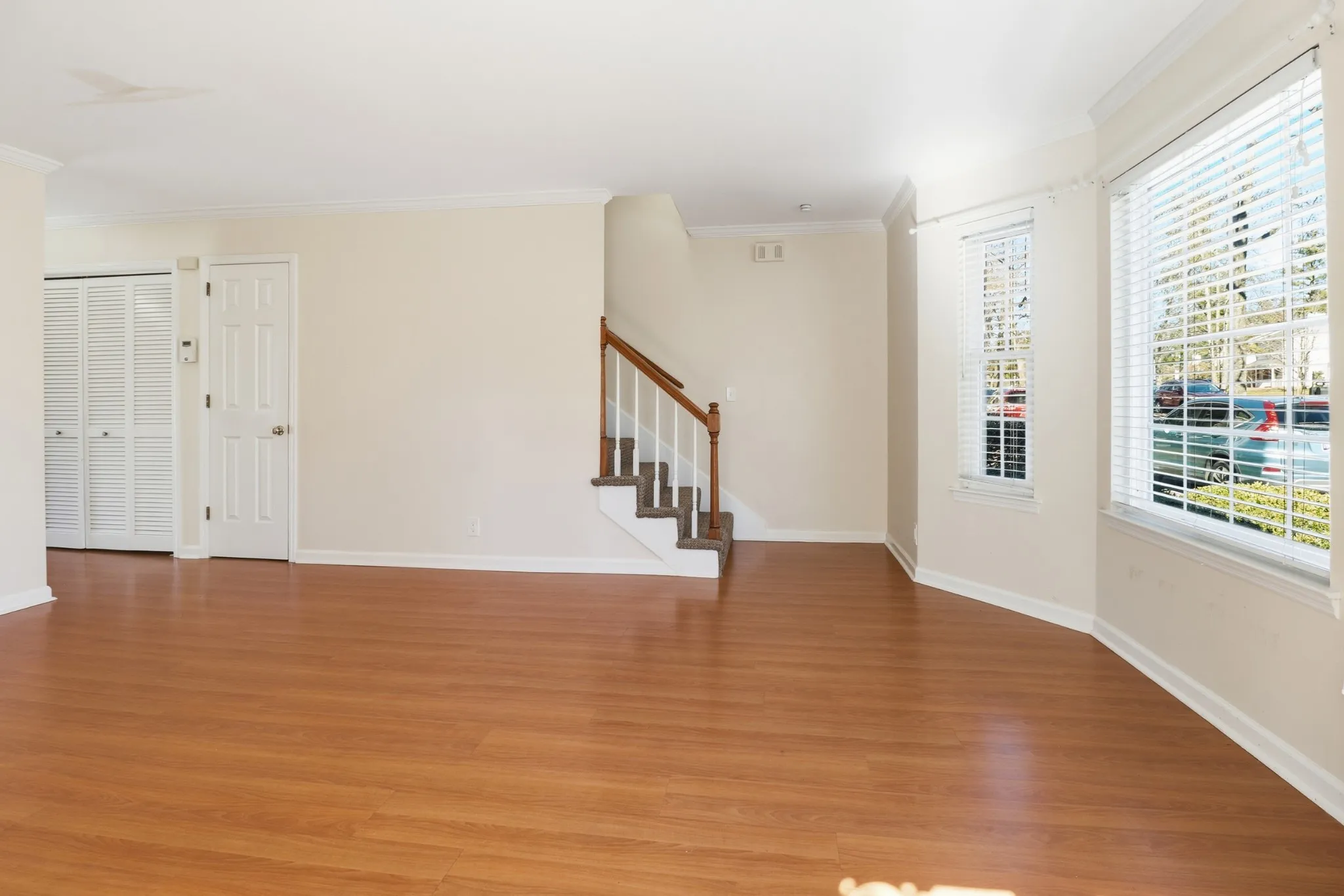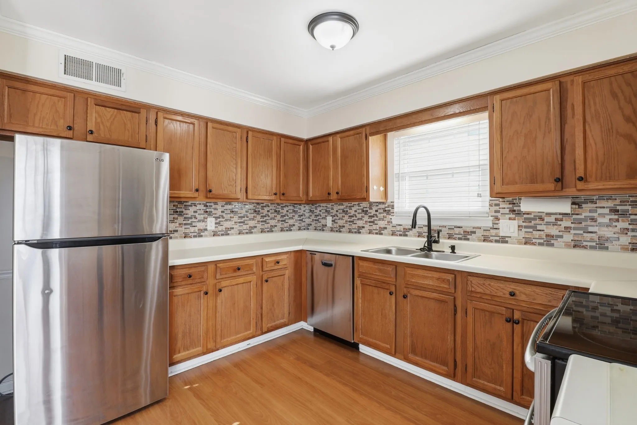 Step inside to an inviting living room featuring hardwood style flooring, crown molding, and a cozy fireplace that anchors the space. Natural light pours in through the bay window, creating a warm and welcoming atmosphere. The spacious kitchen offers plenty of cabinet space, a stylish backsplash, stainless steel appliances, and direct access to the deck, ideal for outdoor dining or relaxing under the trees.