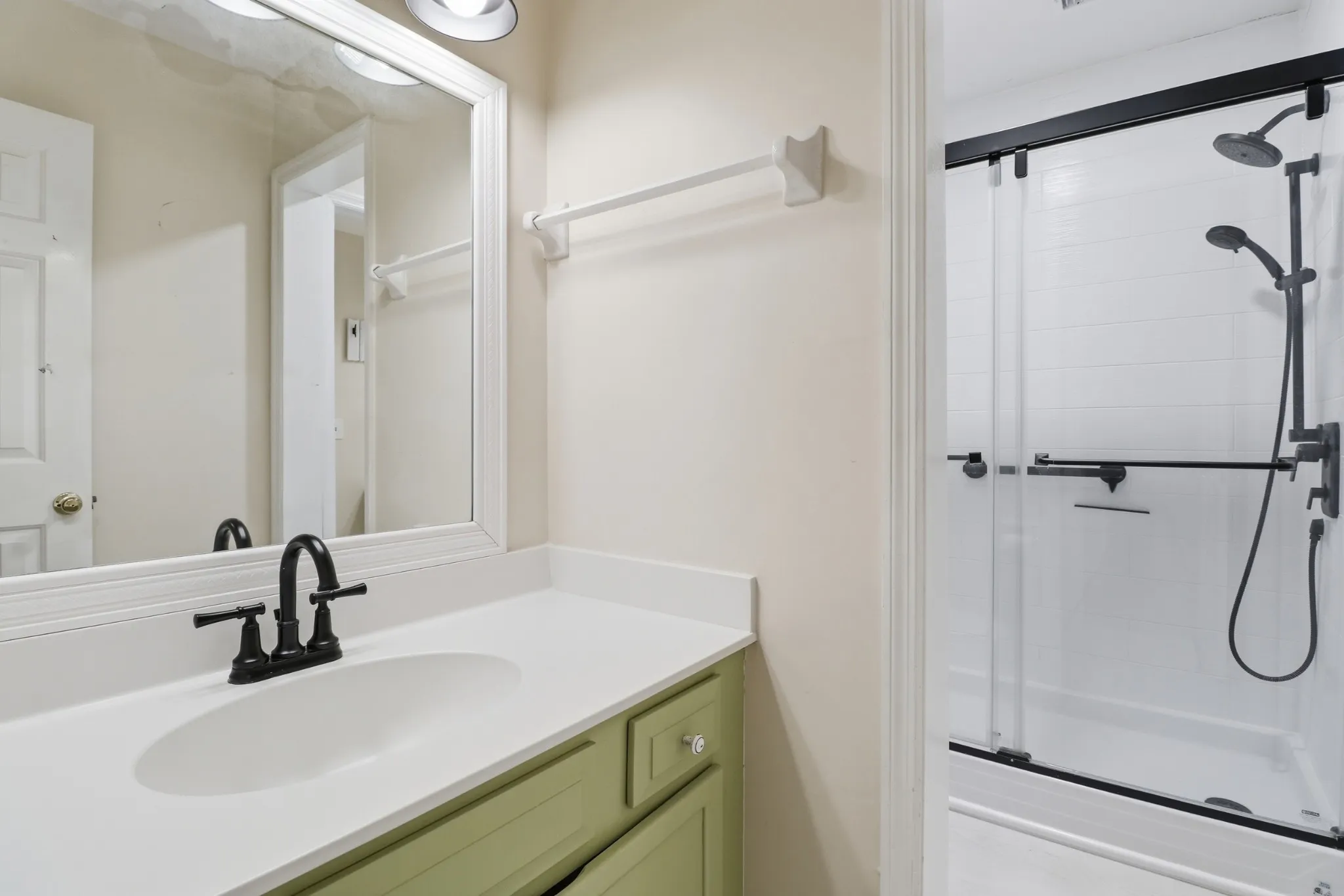 Upstairs, both bedrooms feature ensuite style access to updated baths, including a renovated Jack and Jill bathroom with new fixtures, a modern vanity, and a sleek walk in shower with black accents. The upstairs layout provides comfort and privacy for each room while maintaining a connected feel perfect for families, guests, or roommates.