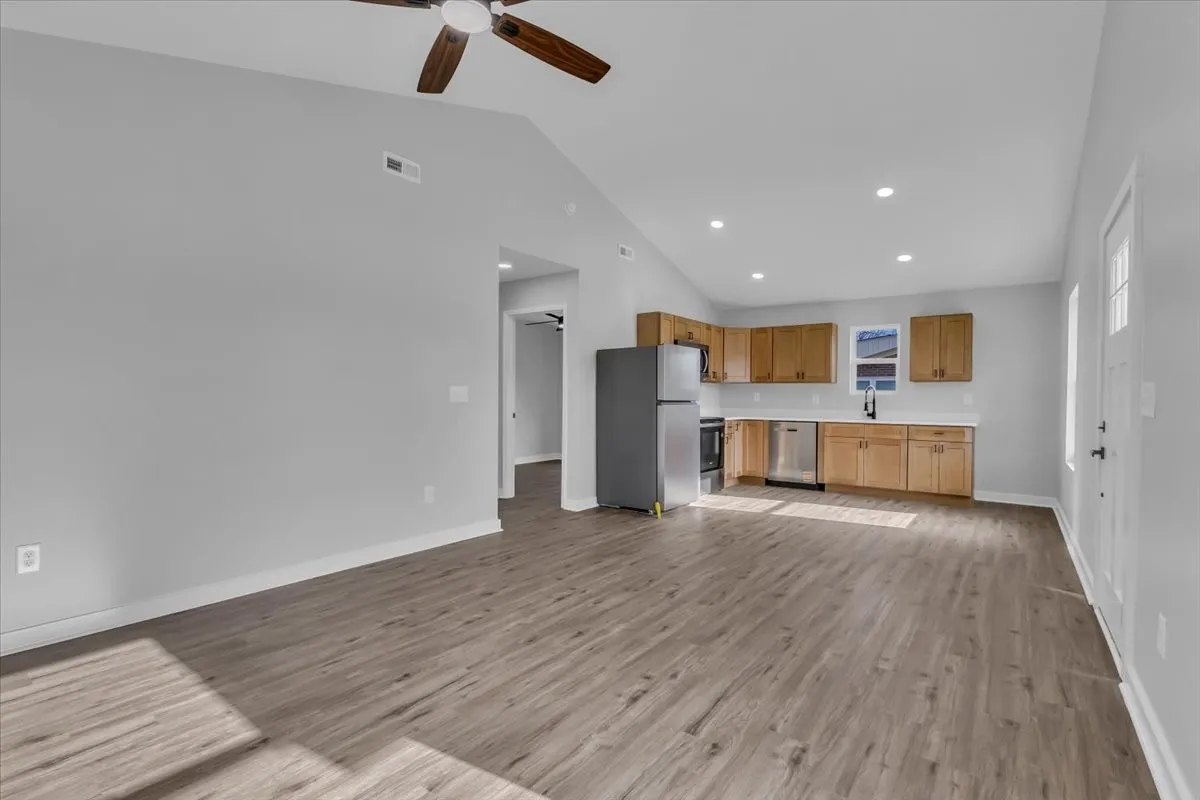 This beautifully designed 1064 sq ft home combines quality craftsmanship with modern comfort. Step inside to an open floor plan featuring quartz countertops, soft close cabinets, and luxury vinyl plank flooring throughout. The vaulted ceilings enhances the spacious feel of the kitchen and living area. The kitchen comes fully equipped with stainless steel appliances- stove, microwave, dishwasher, and refrigerator plus a stackable washer and dryer. Outdoor living is easy with a covered front porch for quiet mornings and a generous back patio perfect for entertaining. Built by: Redwood Construction, LLC, this home offers a seamless blend of style, functionality, and quality.