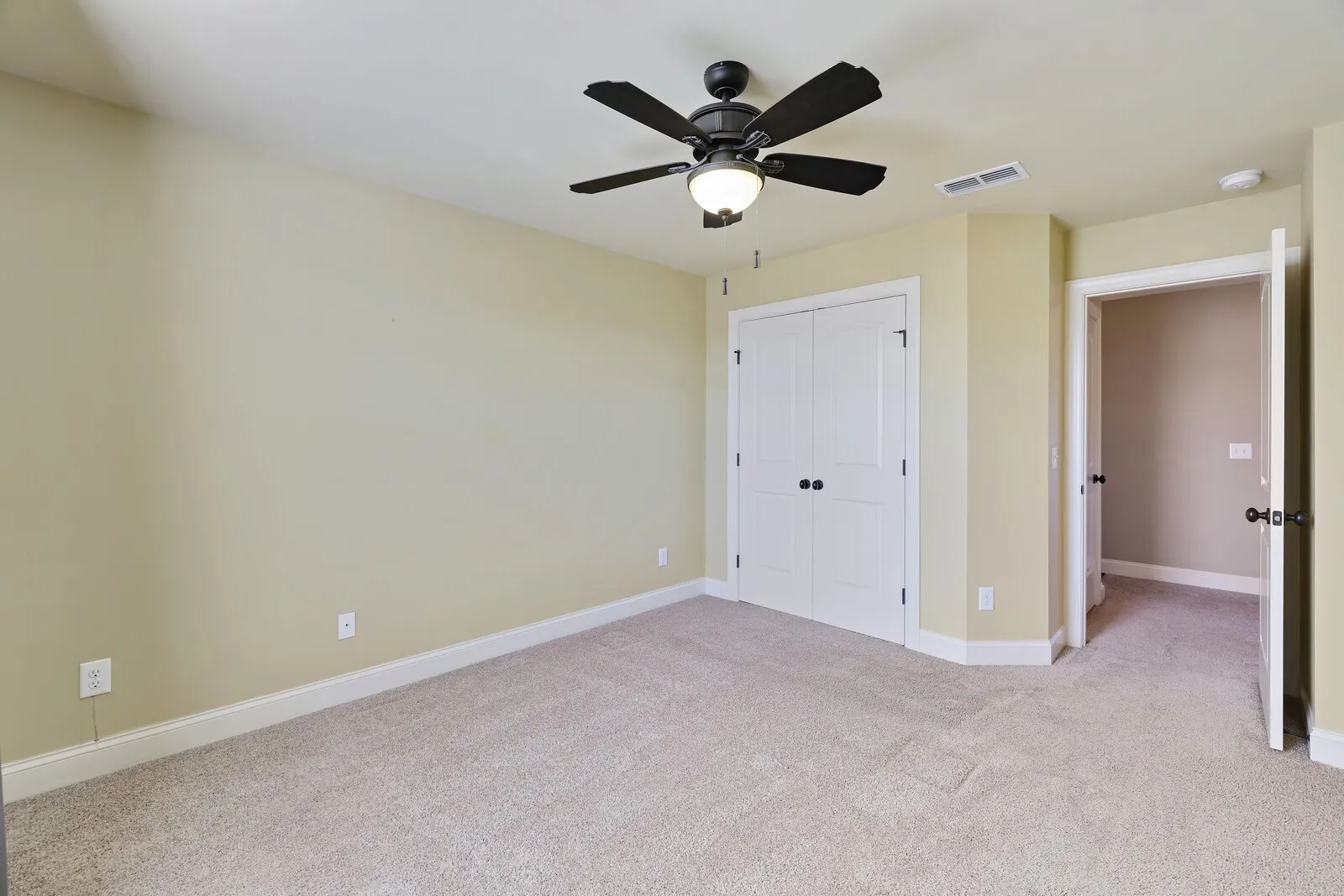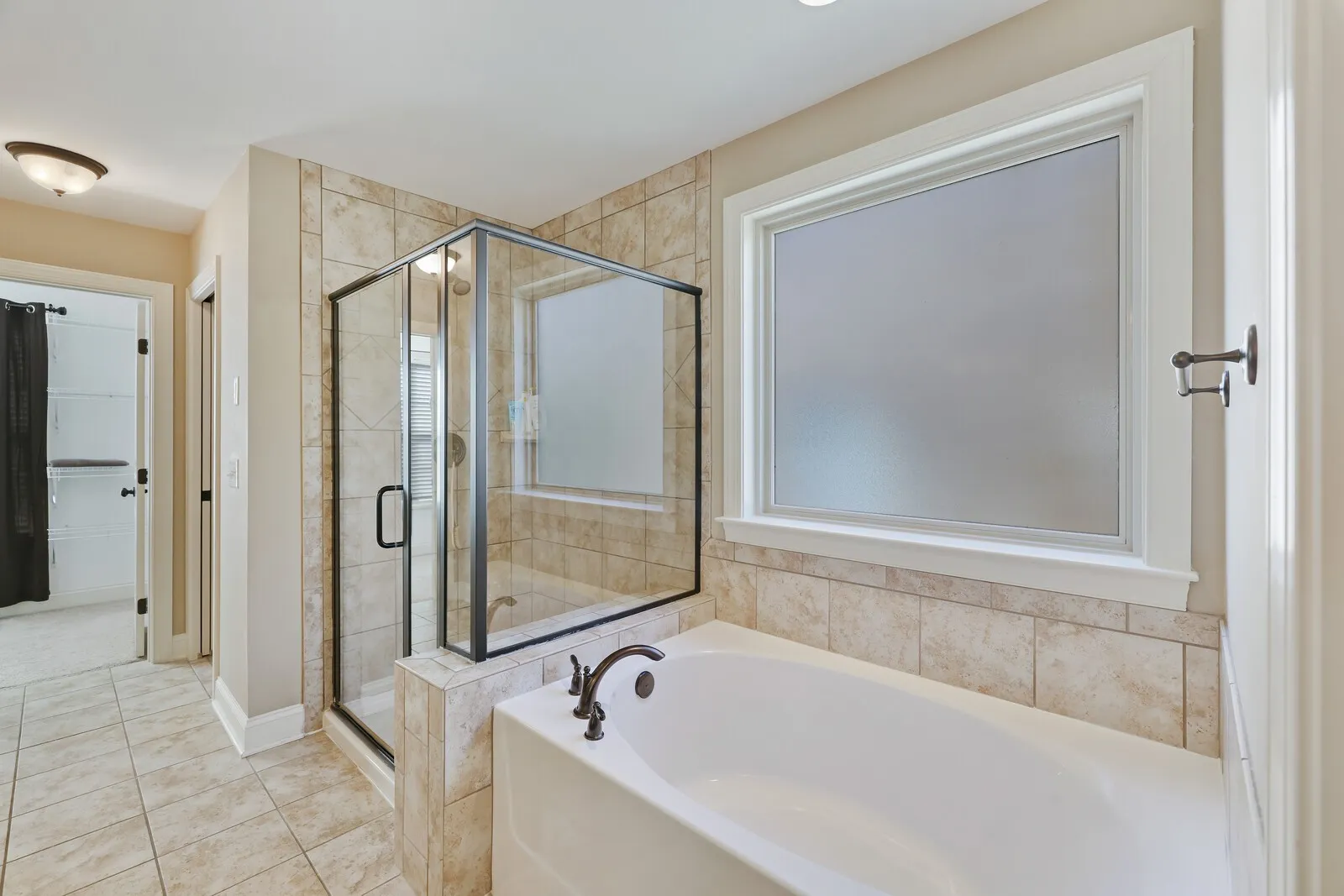 Private mid-level primary suite with oversized bathroom and two walk-in closets, separate from the other three bedrooms upstairs.
