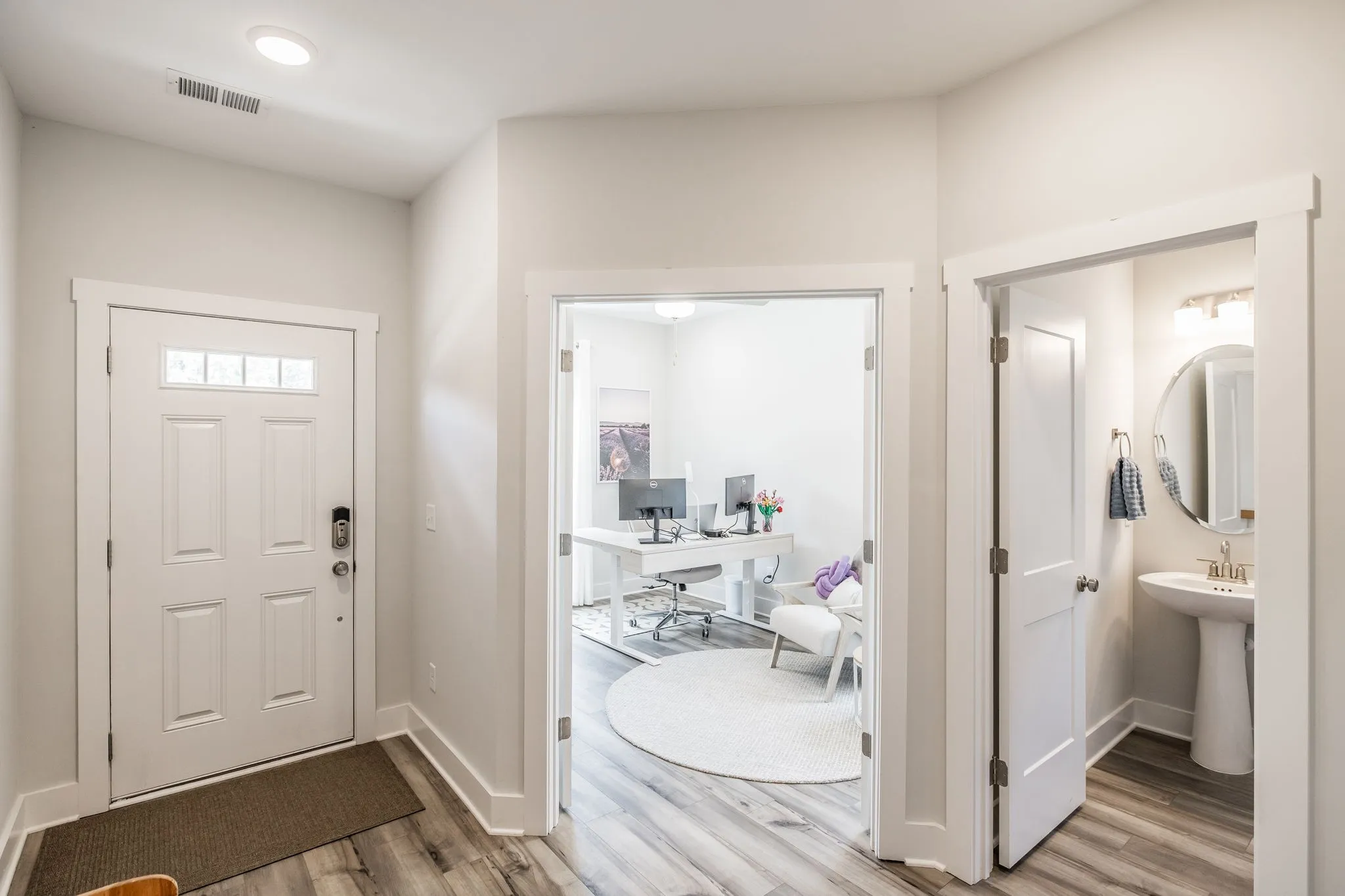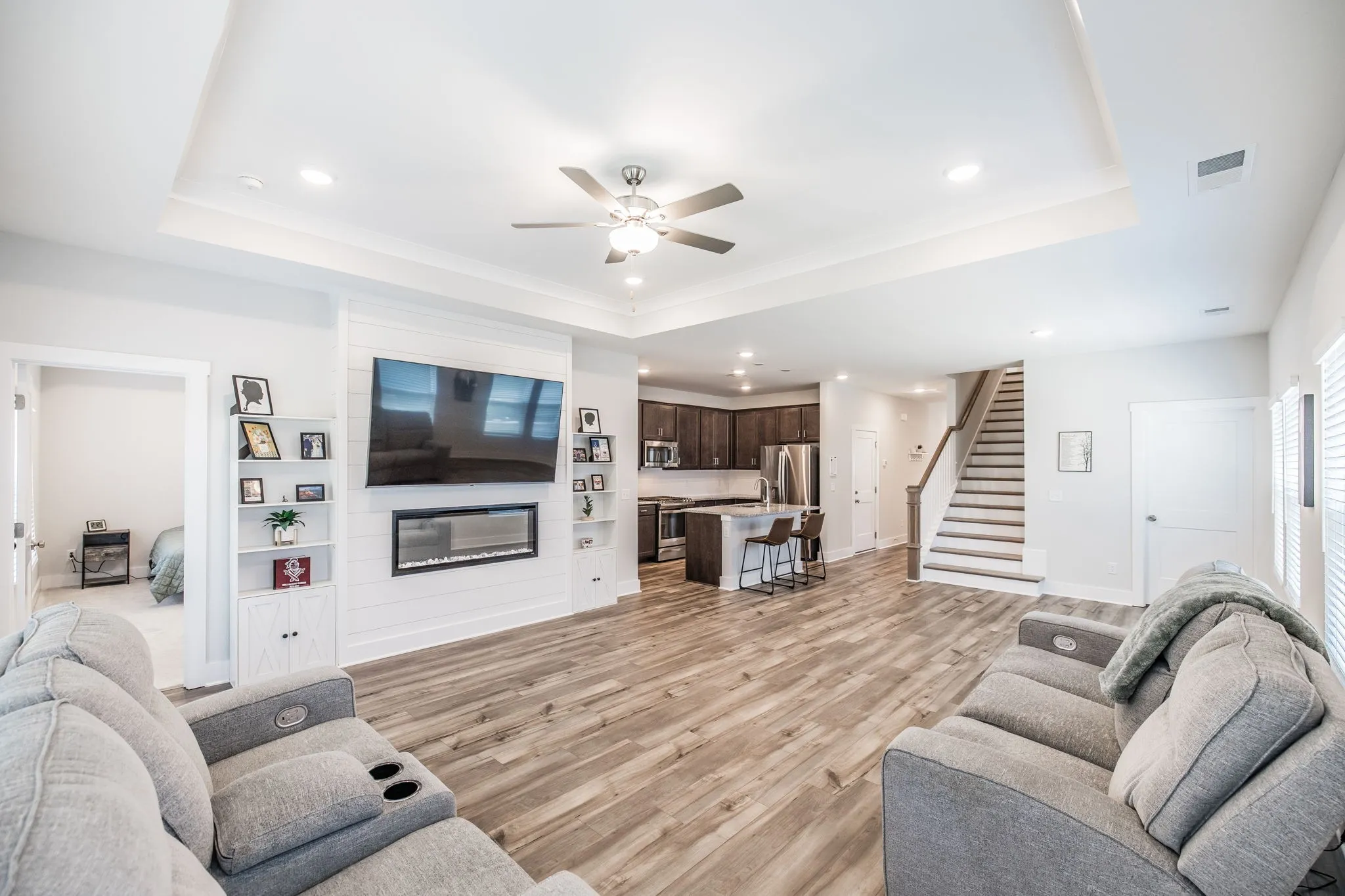 Step inside to a bright, open floor plan featuring a spacious living area with a custom electric fireplace and a dedicated front office—perfect for working from home. The gourmet kitchen is built for entertaining, complete with a large island, gas range, and generous pantry.