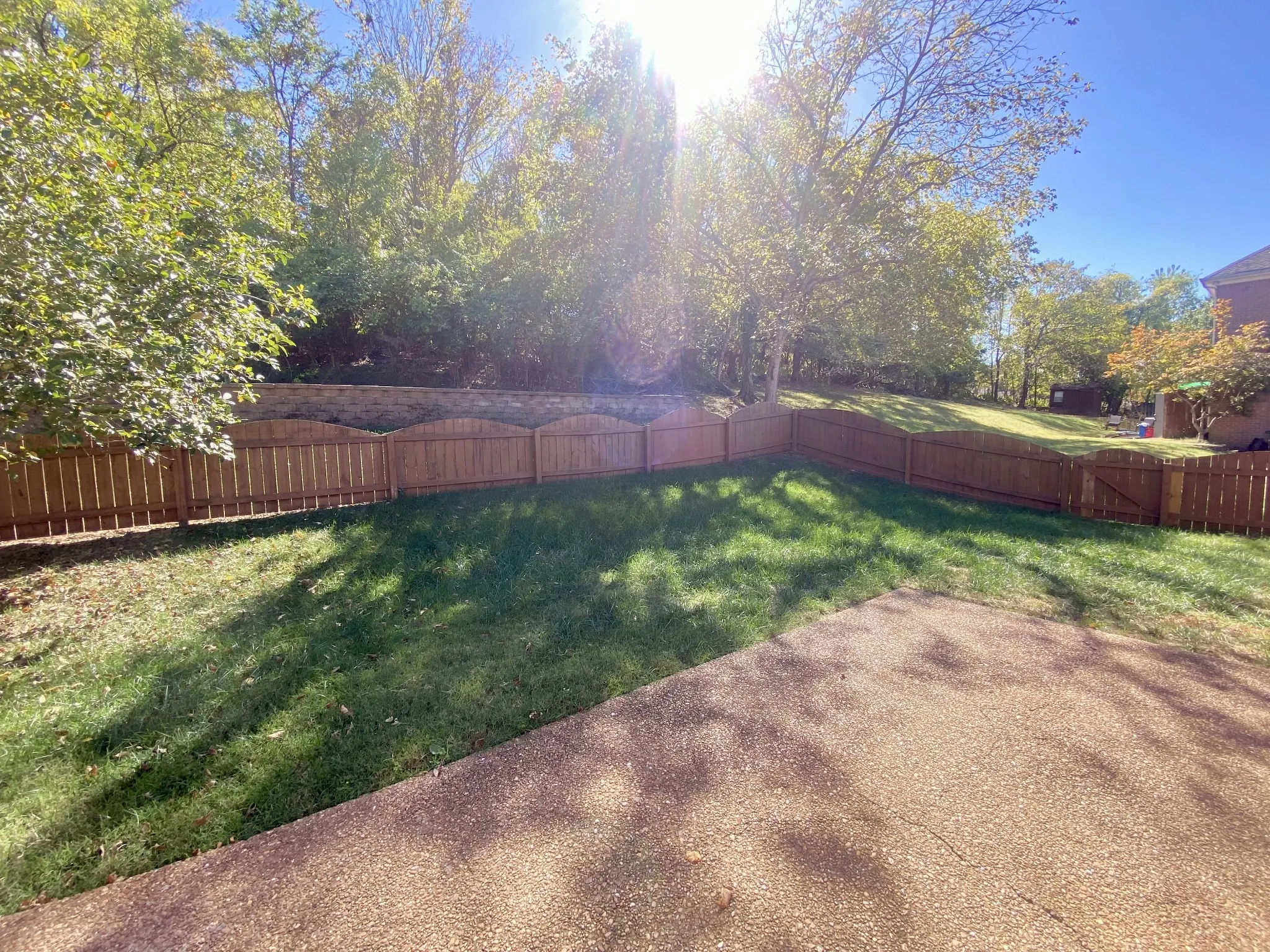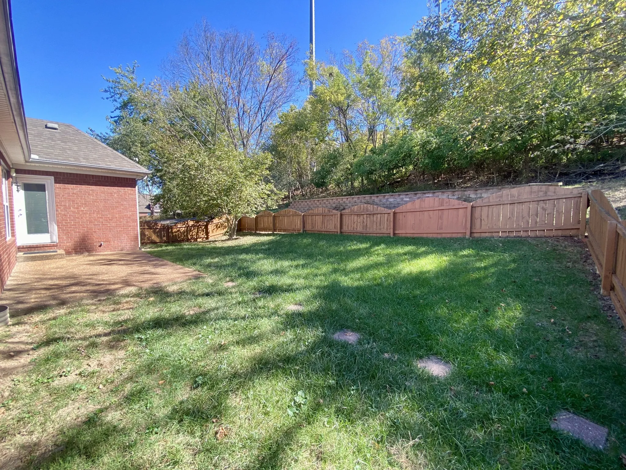 Private fenced backyard with a tree line for added privacy