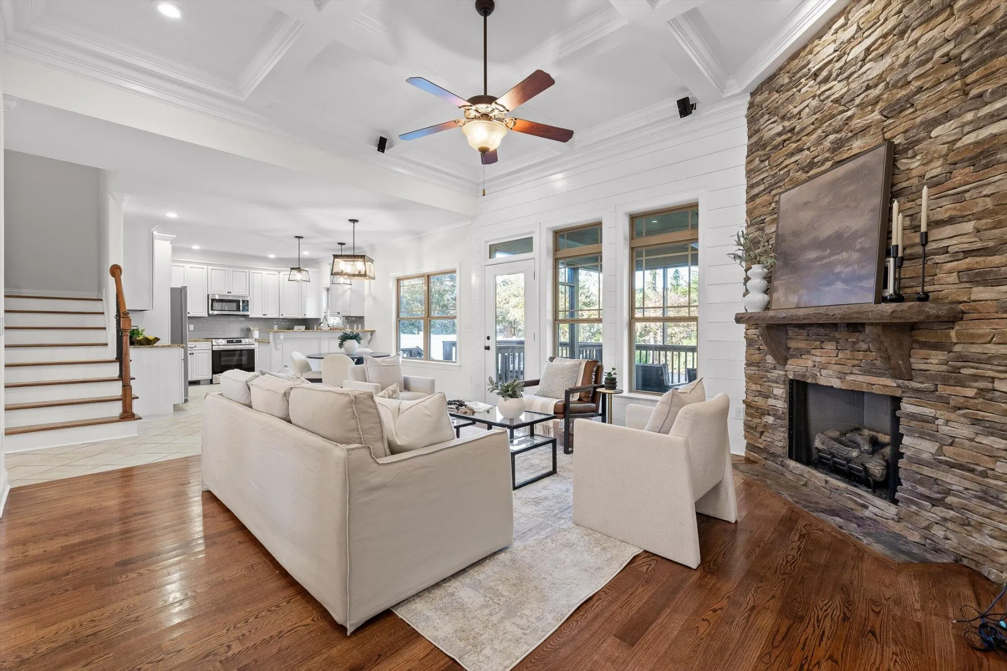 Upstairs, three additional bedrooms share a full bath and offer plenty of closet space and excellent storage throughout. Step outside from the living area to a screened porch and adjoining deck, ideal for morning coffee or relaxing evenings.