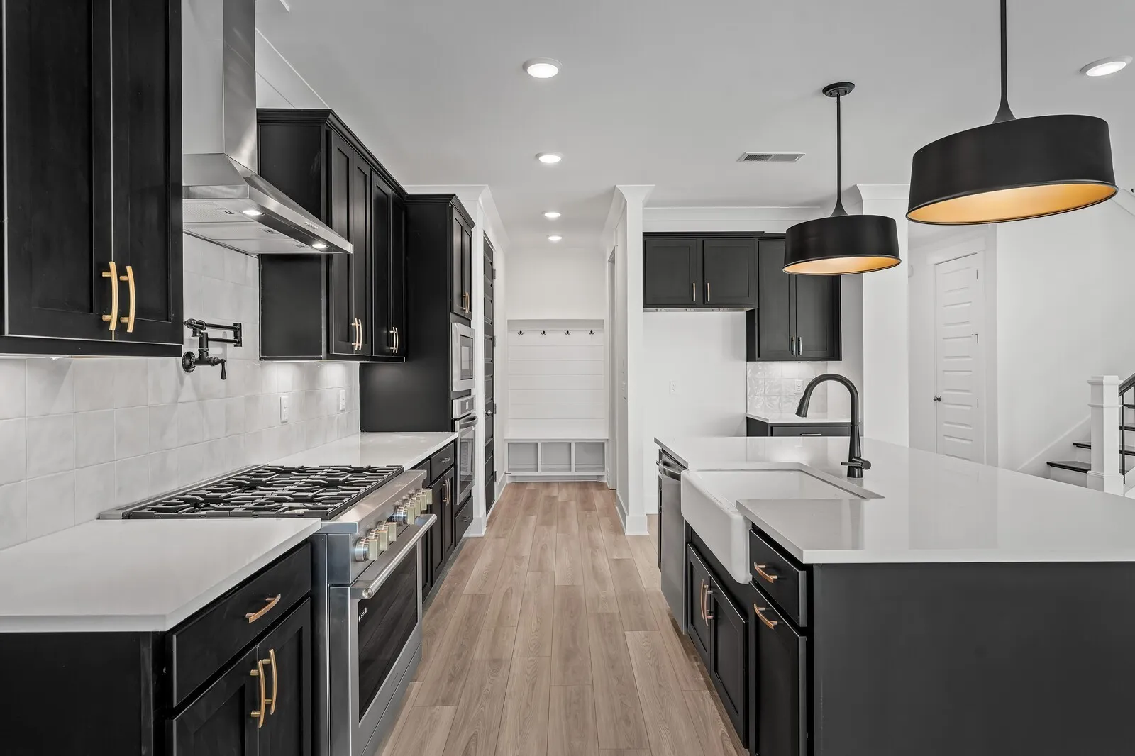 The Hathaway A features an open kitchen/family room, complete with 10′ first floor ceilings. The plan’s glamorous Master Suite features a custom-tile shower, garden tub and dual closets. Elsewhere, discover a spare downstairs bedroom, a bonus room and a three-car garage. From its covered porches to its spacious Gourmet kitchen, the Hathaway is perfect for your needs. This Home is Move-in Ready.
