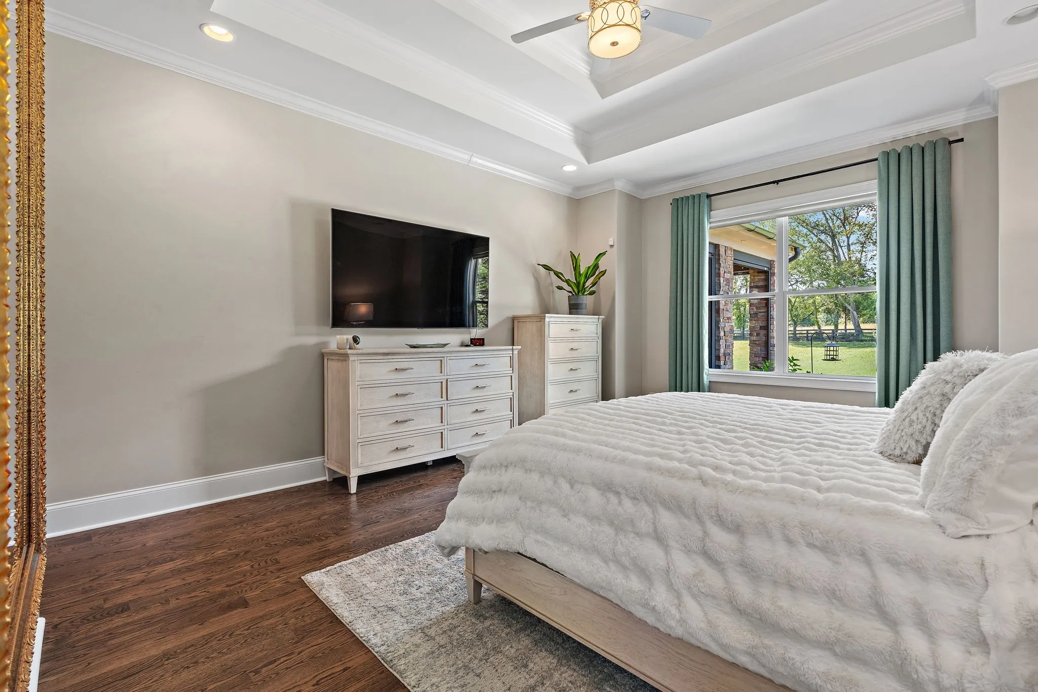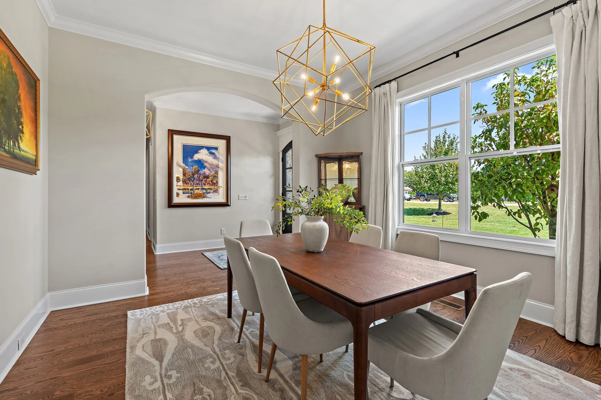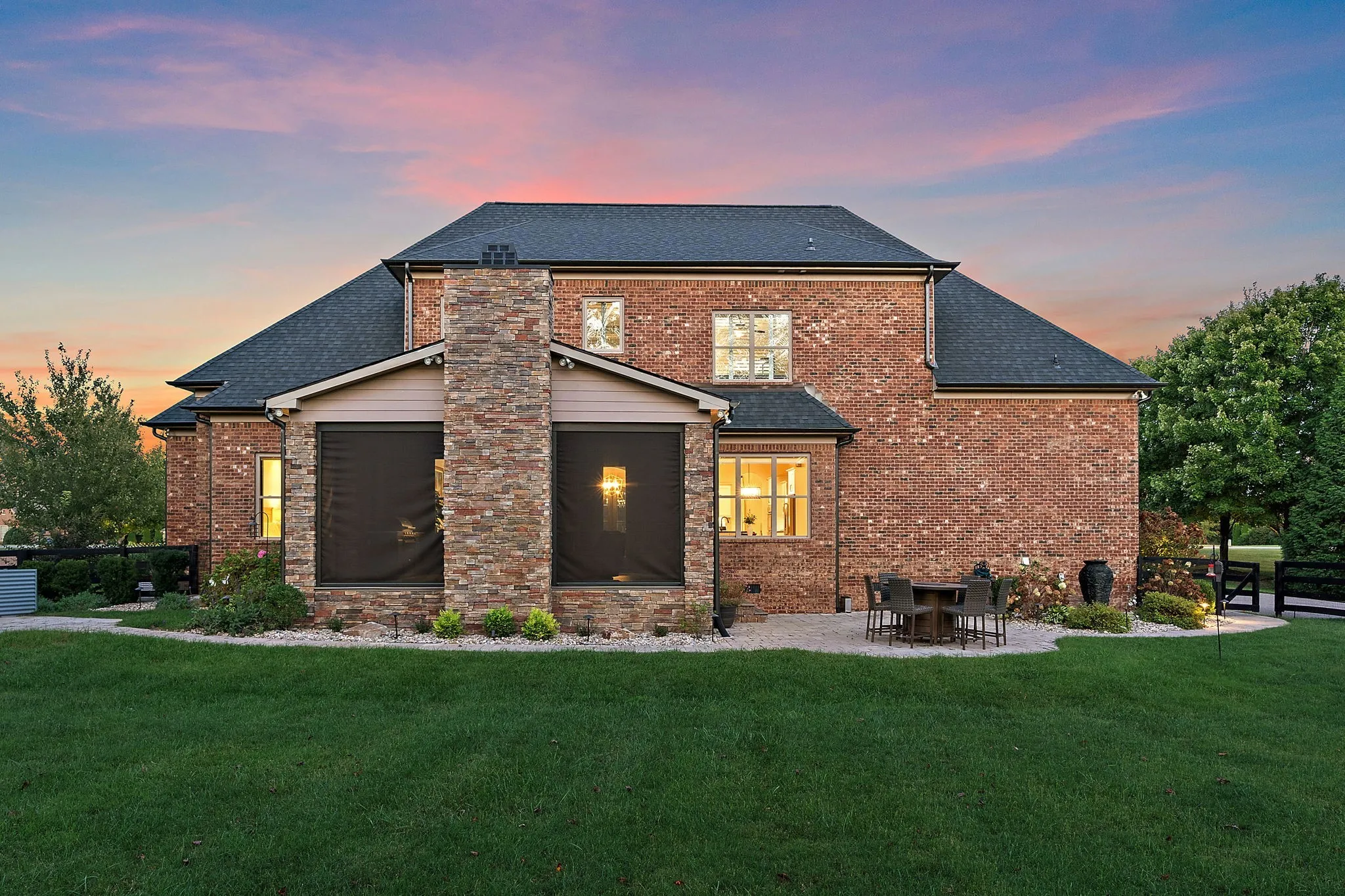 Nestled on over an acre in an exclusive neighborhood (only 28 homes on luxury lots), this elegant all-brick estate blends timeless style with modern upgrades. Step inside to find hardwood floors throughout the main level and exquisite natural light filling spacious living and dining areas—ideal for entertaining. The living room features coffered ceilings, a built-in fireplace, and a custom inset big-screen TV.\n