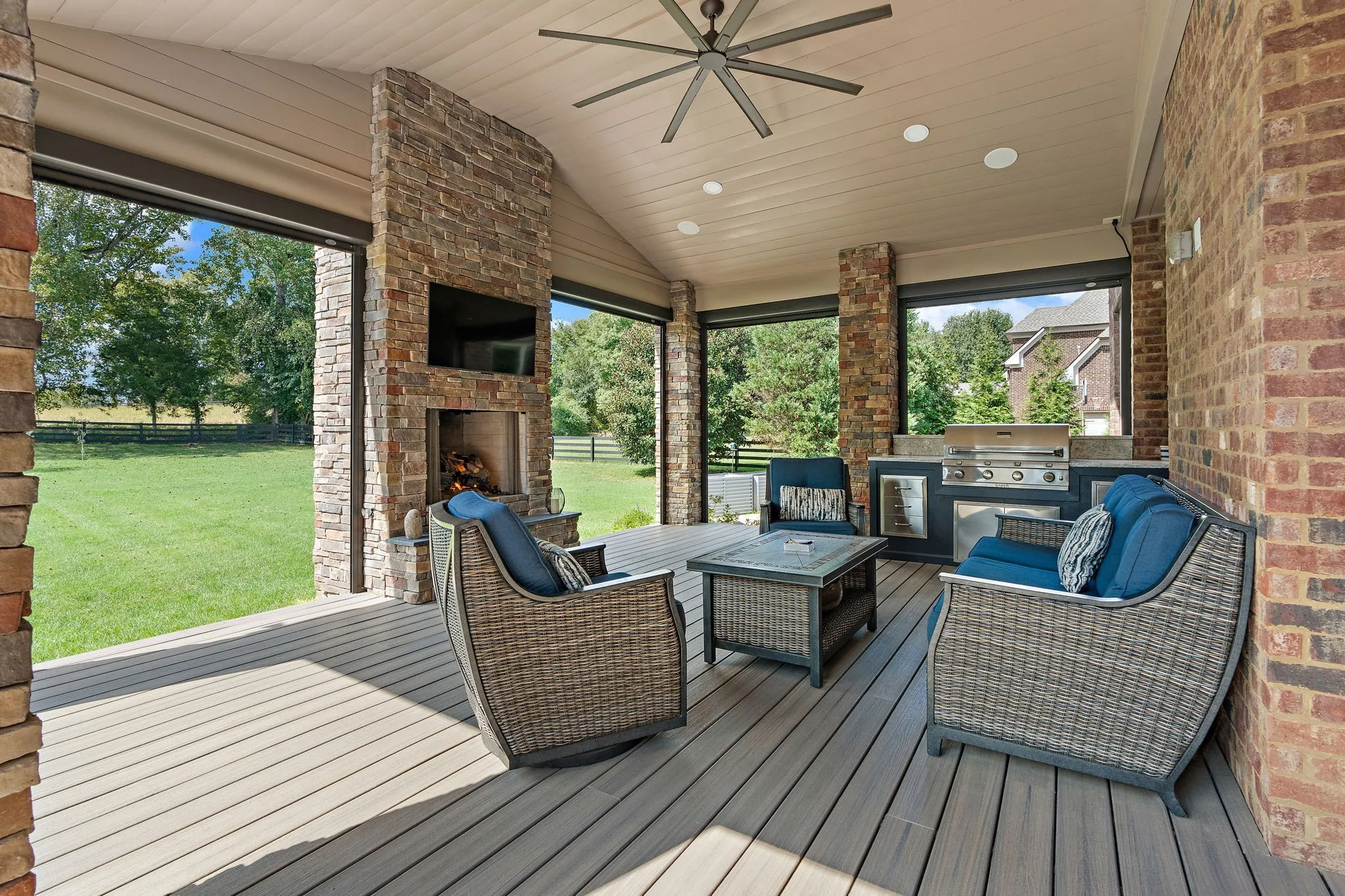 Outdoor living is elevated with a luxurious back porch featuring retractable screens, a gas fireplace, a TV, and a built-in grill, all overlooking a large, private lot that backs up to an undeveloped field. The extended patio is surrounded by lush landscaping and a water feature. A three-car garage with Swiss tile flooring provides ample parking.\n