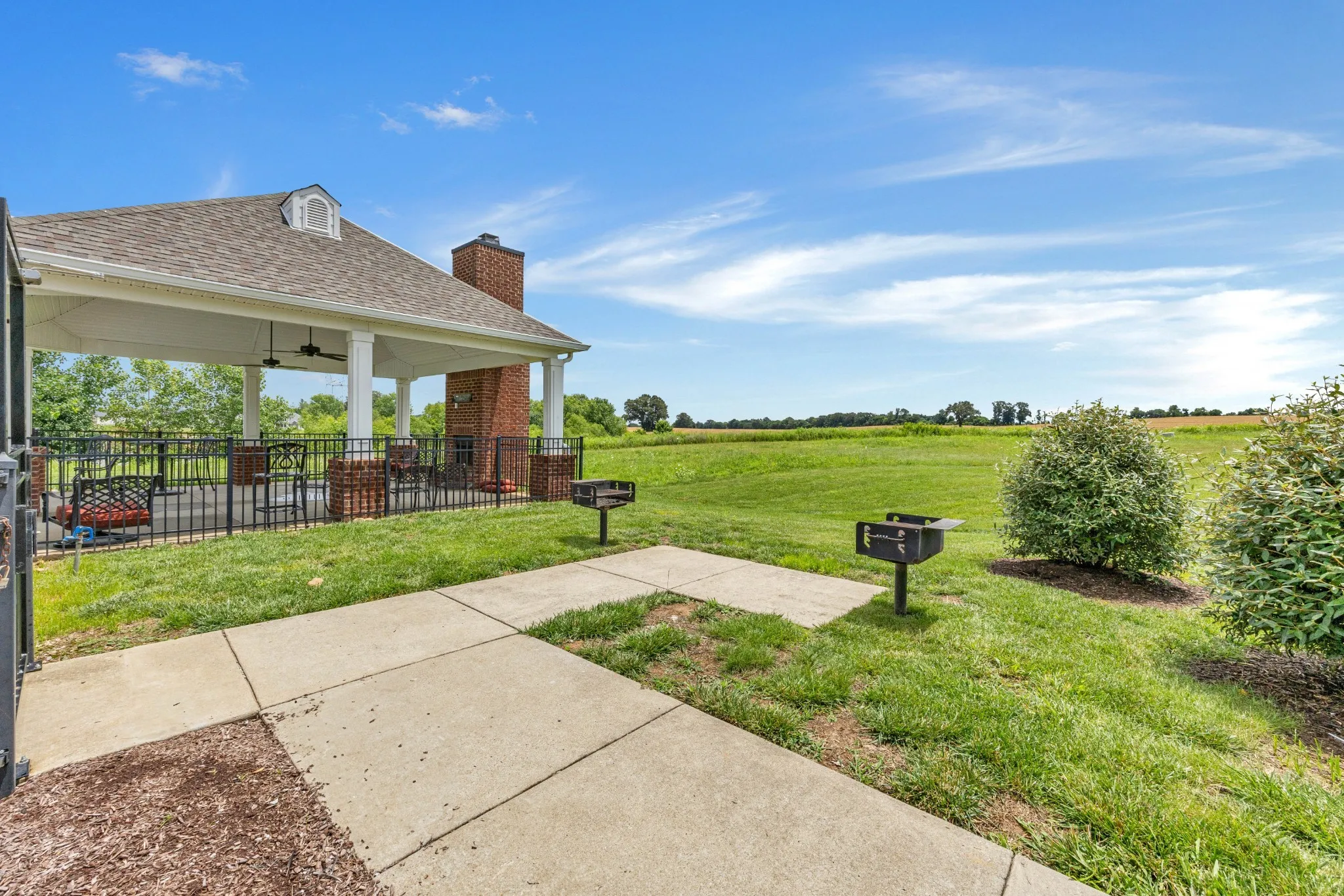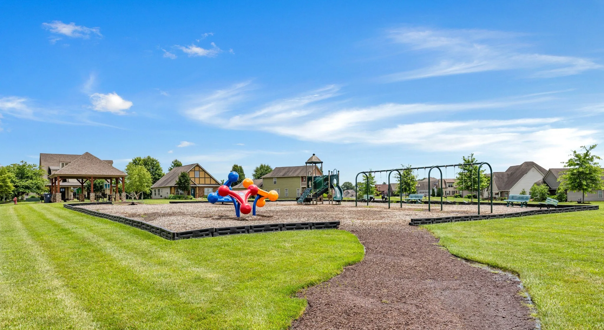 The private community playground with covered pavilions and grills is right across
