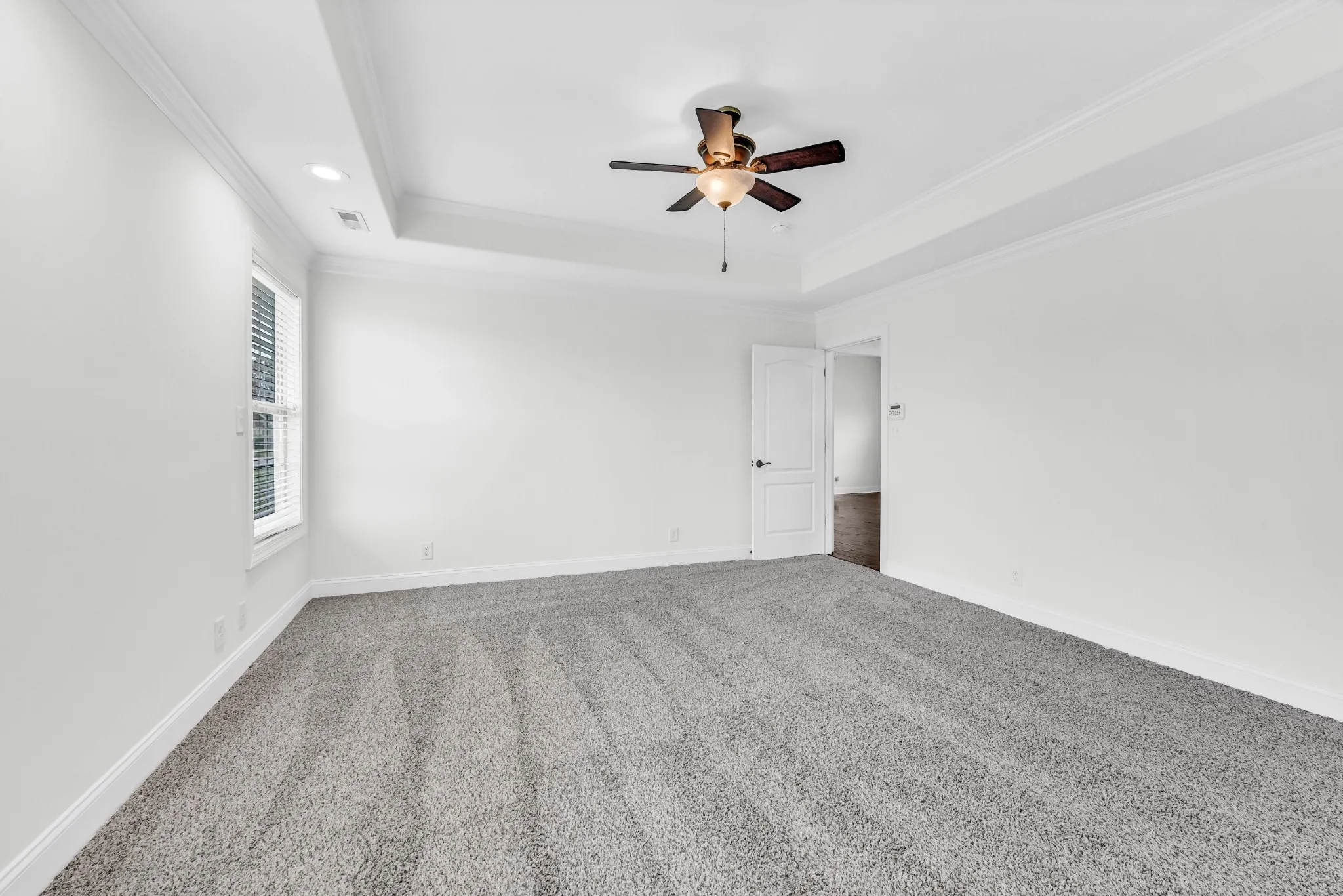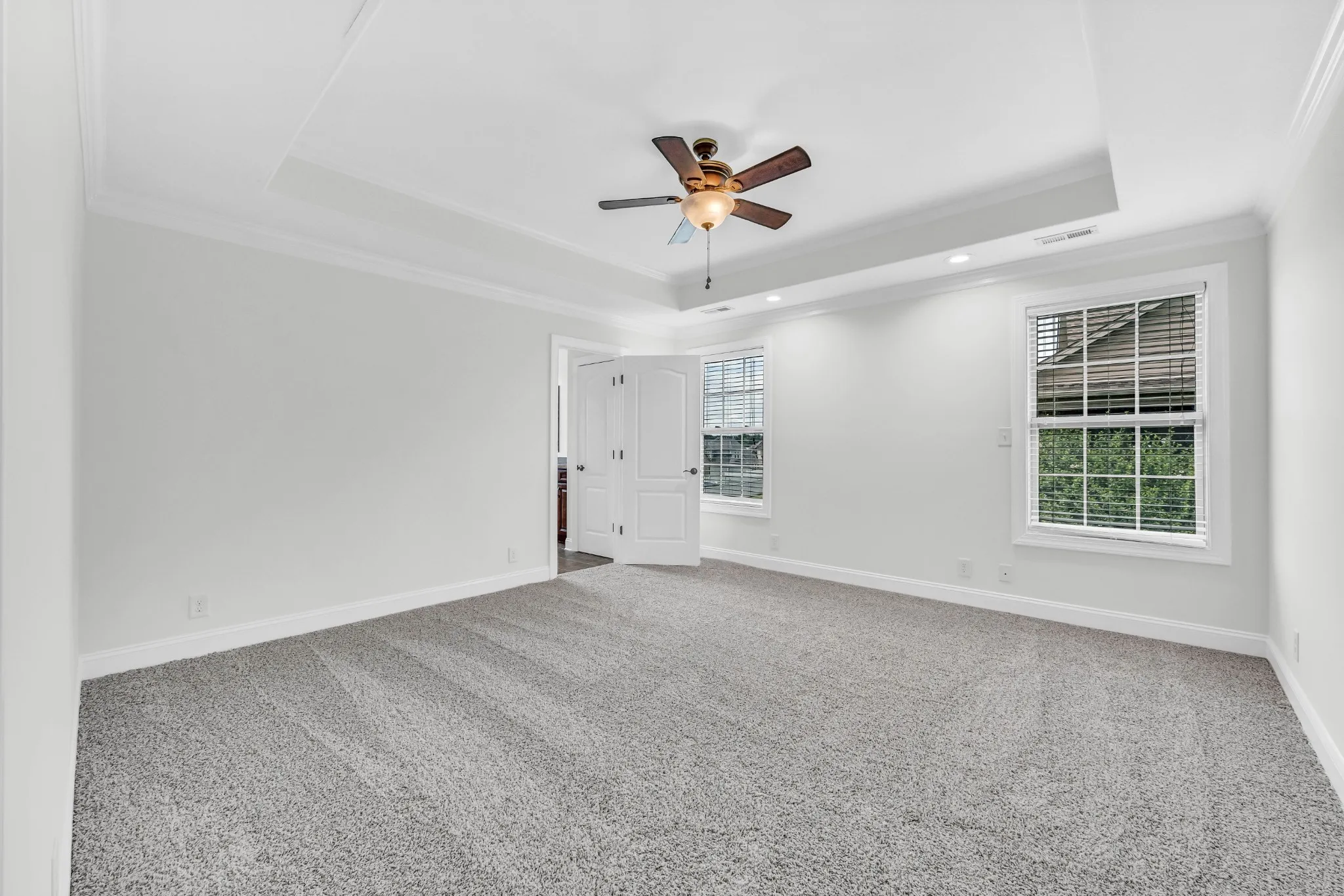 closet, private toilet area and walk-in shower. The bedroom has a romantic tray ceiling.