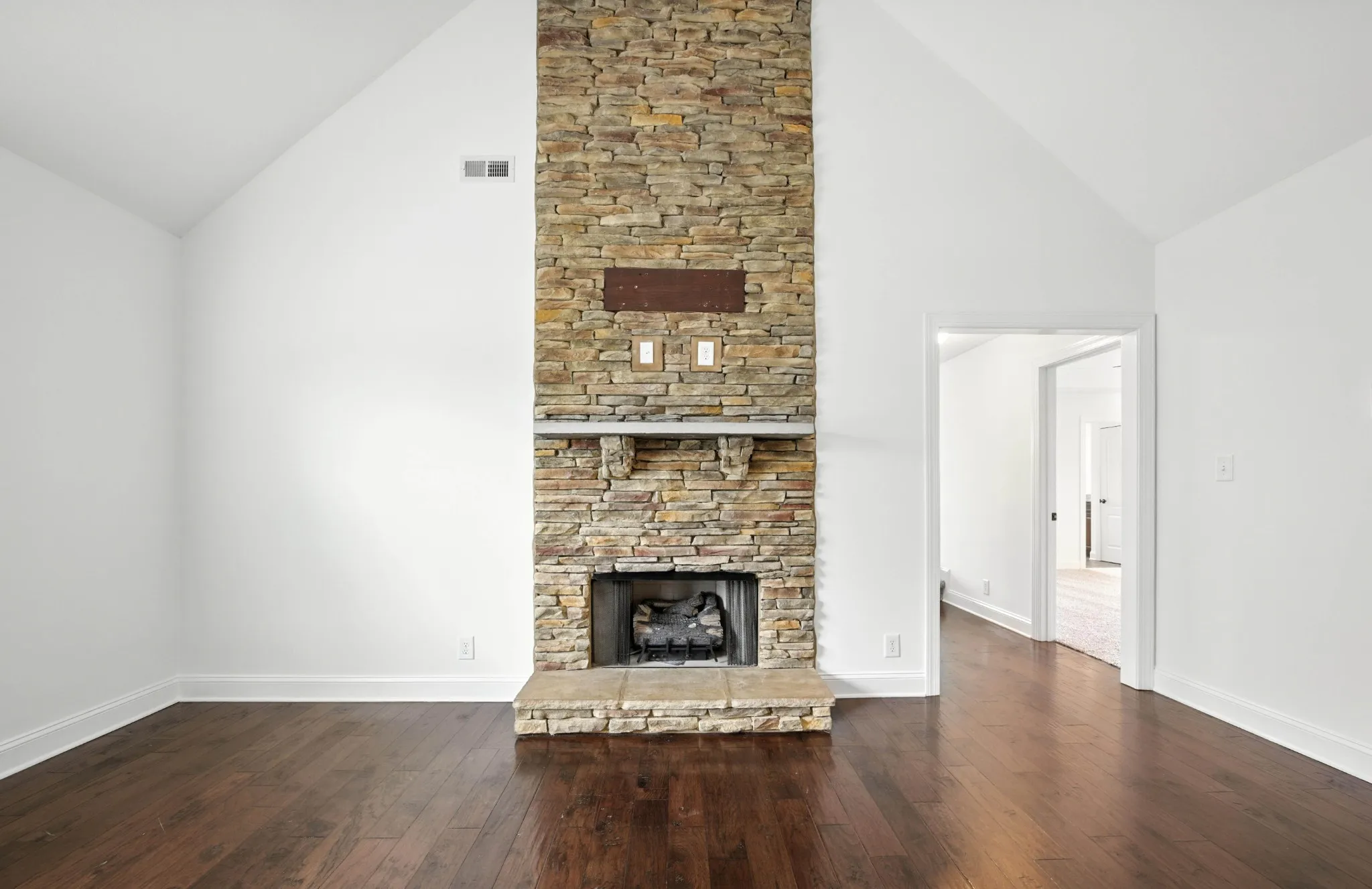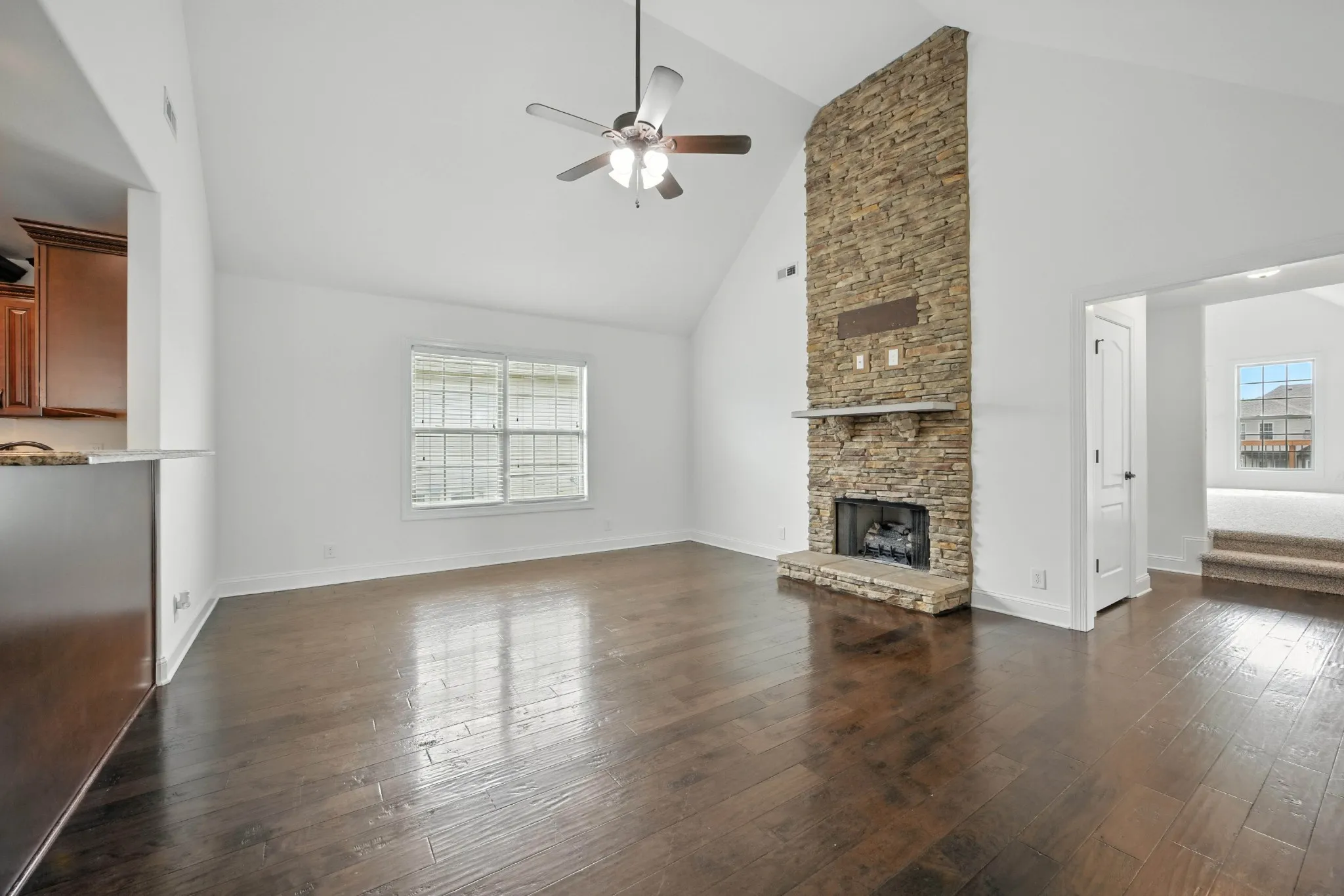 Living Room features a high ceiling with a floor to ceiling stacked stone fireplace.