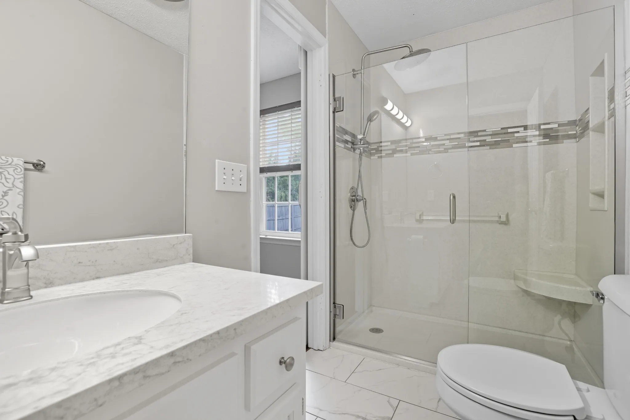 When you walk in to the front door you will find a large open room with wood floors that will make you feel at home immediately. If you look to your left you will see the entrance to two bedrooms and a bathroom all centrally located for convenience. The Main bathroom is a shower/tub combo. If you go straight from the entrance you will find the kitchen and a hallway leading to the master bedroom. The master bedroom is large and has a newly remodeled master bathroom and a walk in closet. The kitchen has lots of recent updates including quartz counter tops! The Kitchen is situated behind the living room and beside the dining room. It has lots of cabinet space and everything is easy to get to. The dining room is a wonderful space for meals or could be used in a variety of ways to meet your needs. There is access to the backyard/deck and the garage from the dining room. The garage is large enough for 2 vehicles, the washer and dryer hookups are in the garage and the access to the large attic with lots of floored storage space can be found there also.