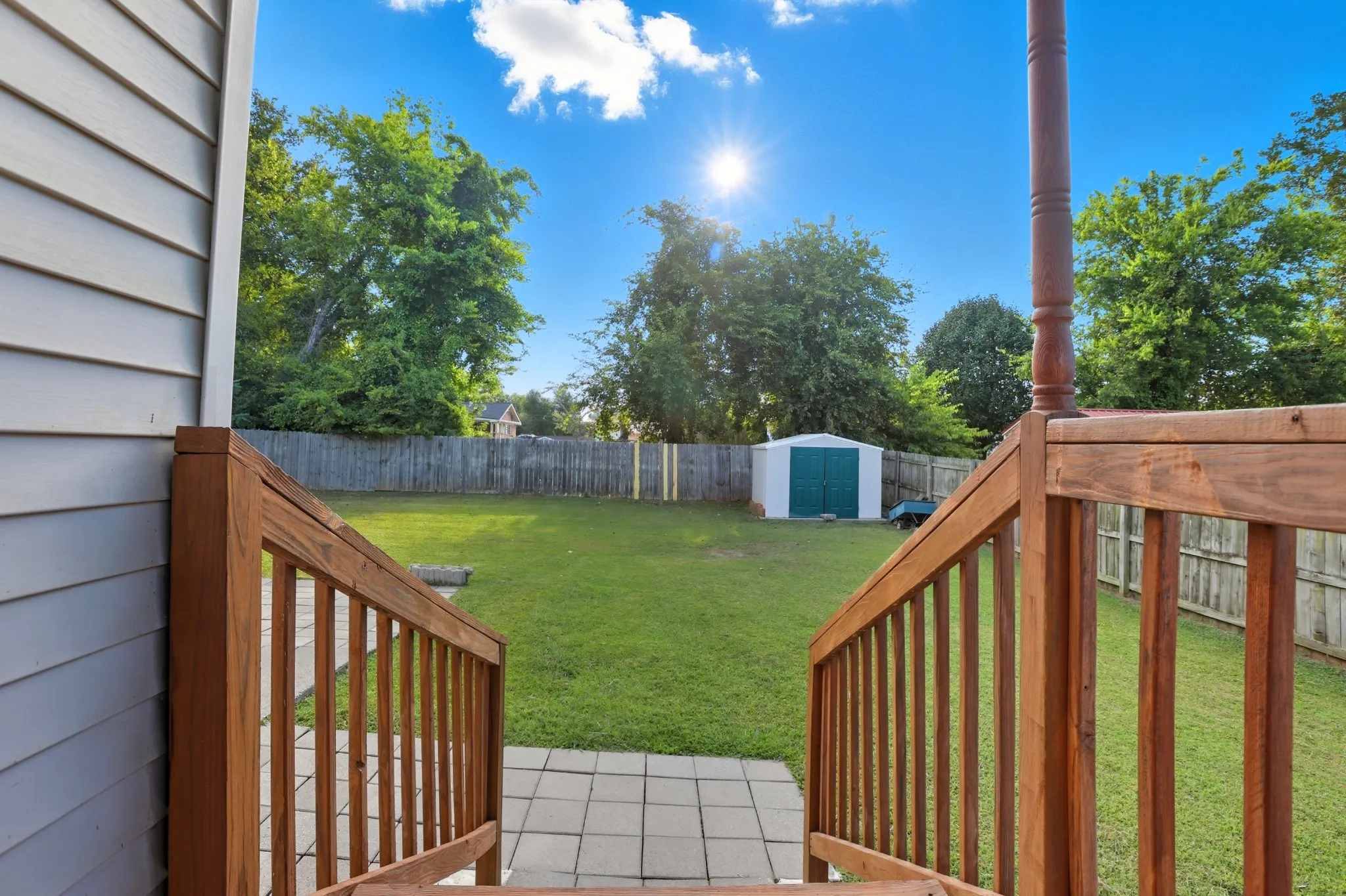 The back door leads to a covered deck that has a few steps leading down to the back yard. You will come out to a concrete pad and a nice open, fenced in back yard that included a storage building for lawn mowers, etc.