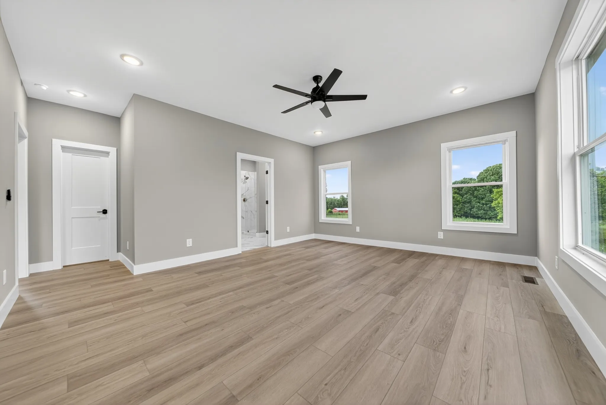 The luxurious primary suite on the main level features a spa-inspired bath with dual vanities, a double custom tile shower, and a large walk-in closet, offering comfort and style. Additional rooms on the main floor provide great options for a home office, study, or flexible living spaces to fit your needs. Upstairs, the large rec room with a full bath is perfect for a bonus living area or can easily serve as a 5th bedroom. A second versatile room offers endless possibilities—whether you envision a playroom, theater, home gym, or additional office space, it’s ready to be customized to your lifestyle. Enjoy the peaceful country setting from the spacious covered back deck, ideal for outdoor entertaining, morning coffee, or simply unwinding while taking in the surrounding landscape. The 2-car attached garage provides secure parking and additional storage space. Walk in partial basement has a dehumidifier system for lots of extra storage, storm shelter or finish it off for extra room. (enter from side of home.)\n