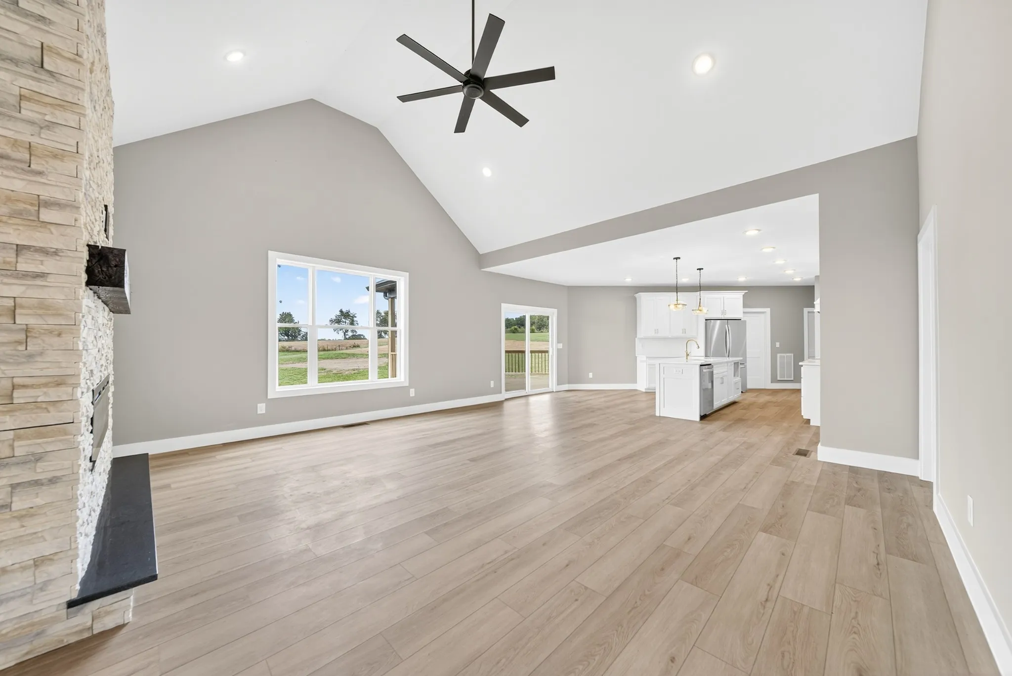 Step into a stunning open floor plan with soaring ceilings and a spacious great room highlighted by a floor-to-ceiling stone fireplace, creating the perfect gathering space for family and friends. The gourmet kitchen is a showstopper, boasting custom tile work, quartz countertops and backsplash, modern fixtures, and an ideal layout for both everyday living and entertaining.\n