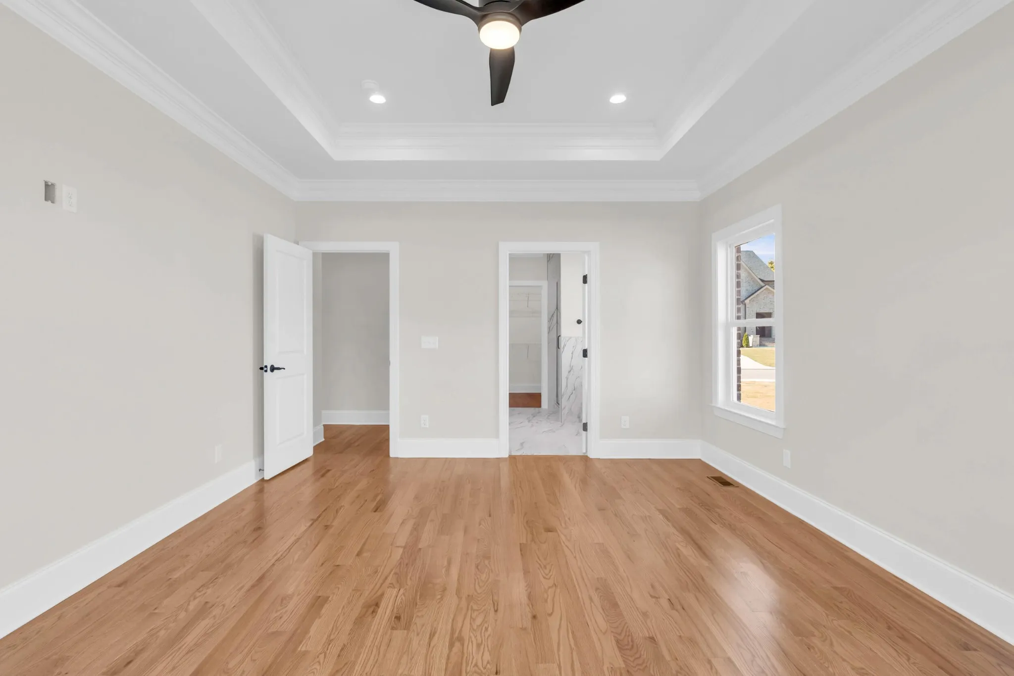 The main-level primary suite is a true retreat, offering a specialty ceiling, spa-like bath with soaking tub, walk-in tiled shower with bench, and dual vanities. A second main-level bedroom with its own en suite bath makes a perfect guest space. Upstairs, you'll find three additional bedrooms, a bonus room, and two full baths, giving everyone room to spread out.\r\n