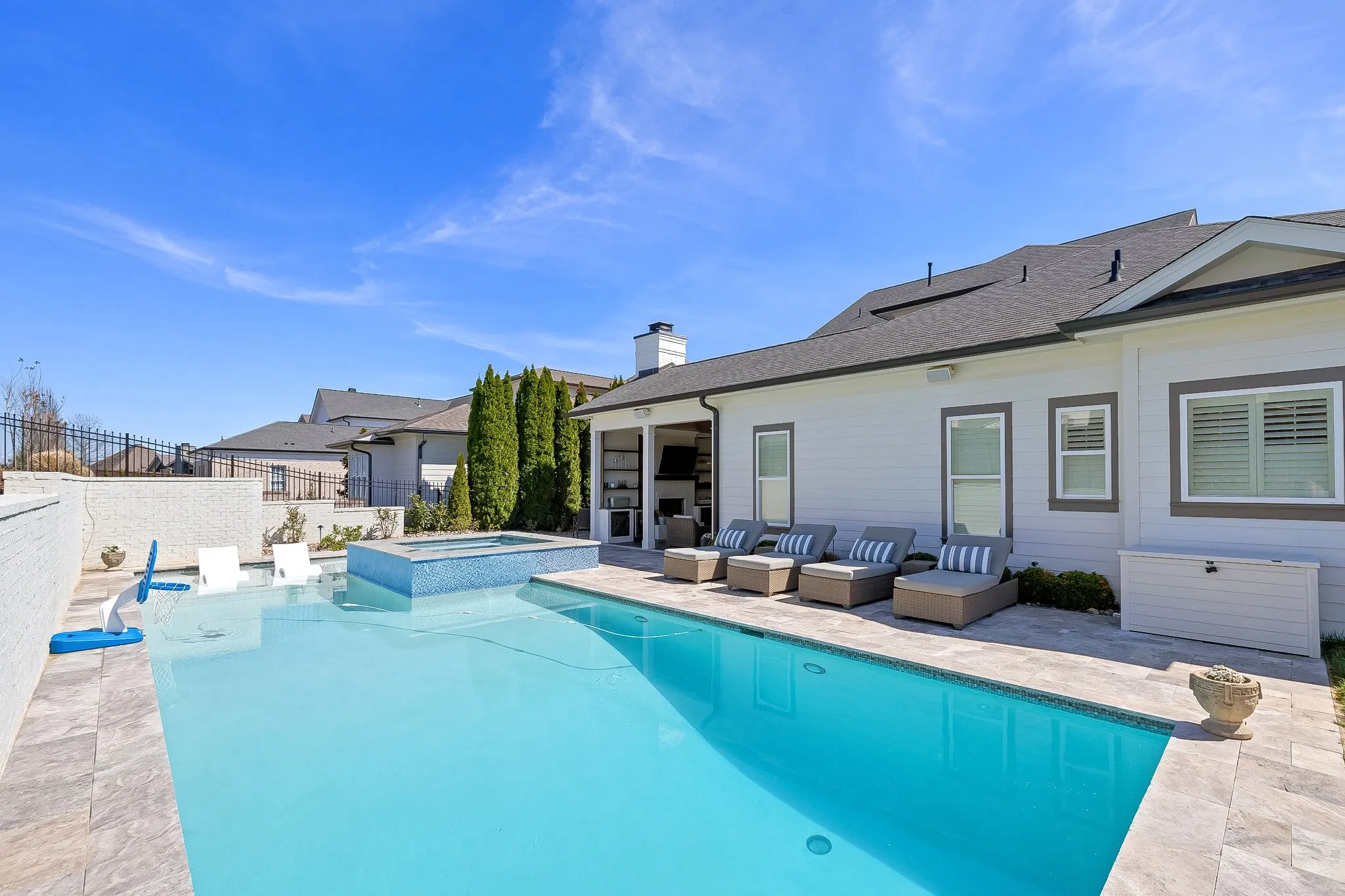 Pool home in Westhaven w/southern design double porches built by Zurich Custom Hms. Built for indoor & outdoor entertaining Outdoor Oasis including ~Heated gunite Pool & Spa~Outdoor Fireplace~Buitl-ins w Fridge~Built-in Grill~Putting Green~Landscape Lighting~Lush Landscaping~Surround Sound. Warm hardwoods+plantation shutters throughout home. Up Front you find an Office or main fl Guest Suite opposite Formal Dining which connects to Butler’s Pantry complete w wine fridge. Open-concept Floorplan offers an inviting & spacious Family Rm that flows into the Kitchen & Eat-In. Kitchen boasts marble countertops~KitchenAid Appl~Sub Zero Fridge. Primary Suite sits in rear of home overlooking pool. Spa-like Bath w soaker tub~Double Vanities~Toto Toilet~His/Hers Closets. Mud Rm+ Huge Laundry. Upstairs you will find 4 large bedrooms all w walk-in closets. Bonus Rm w Wet Bar~Surround Sound~noise canceling wall. BR#6 could be 2nd Bonus RM offering huge walk in closet+storage. See photos for details