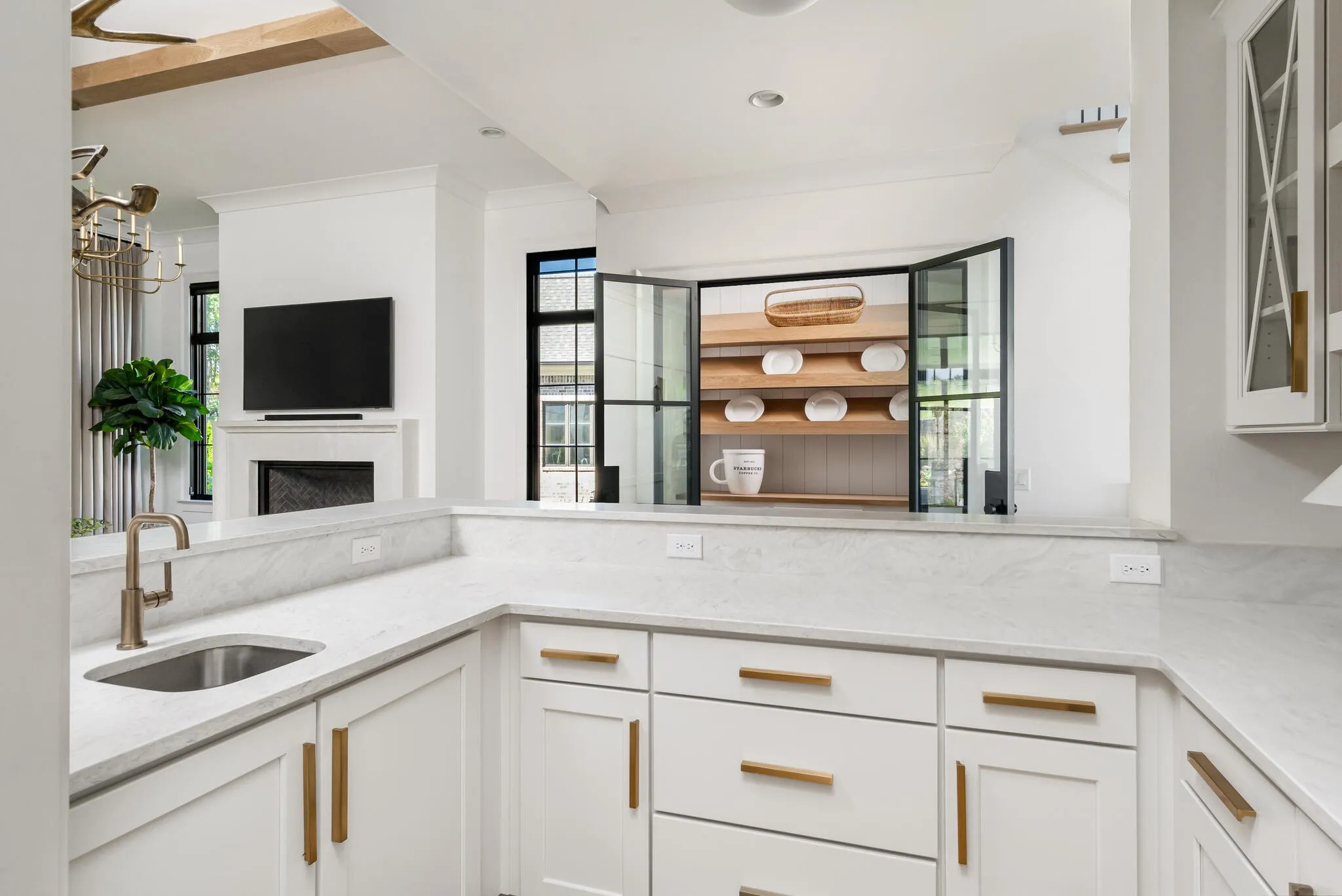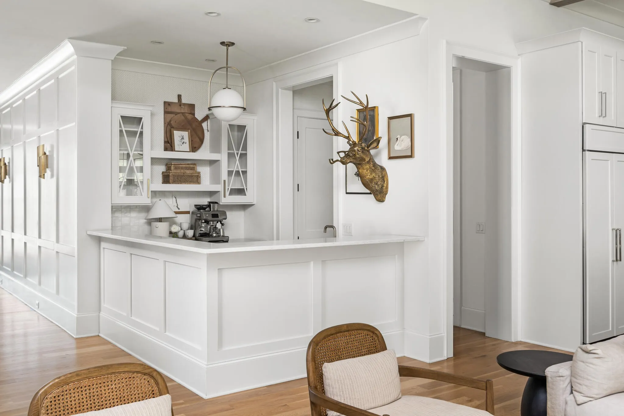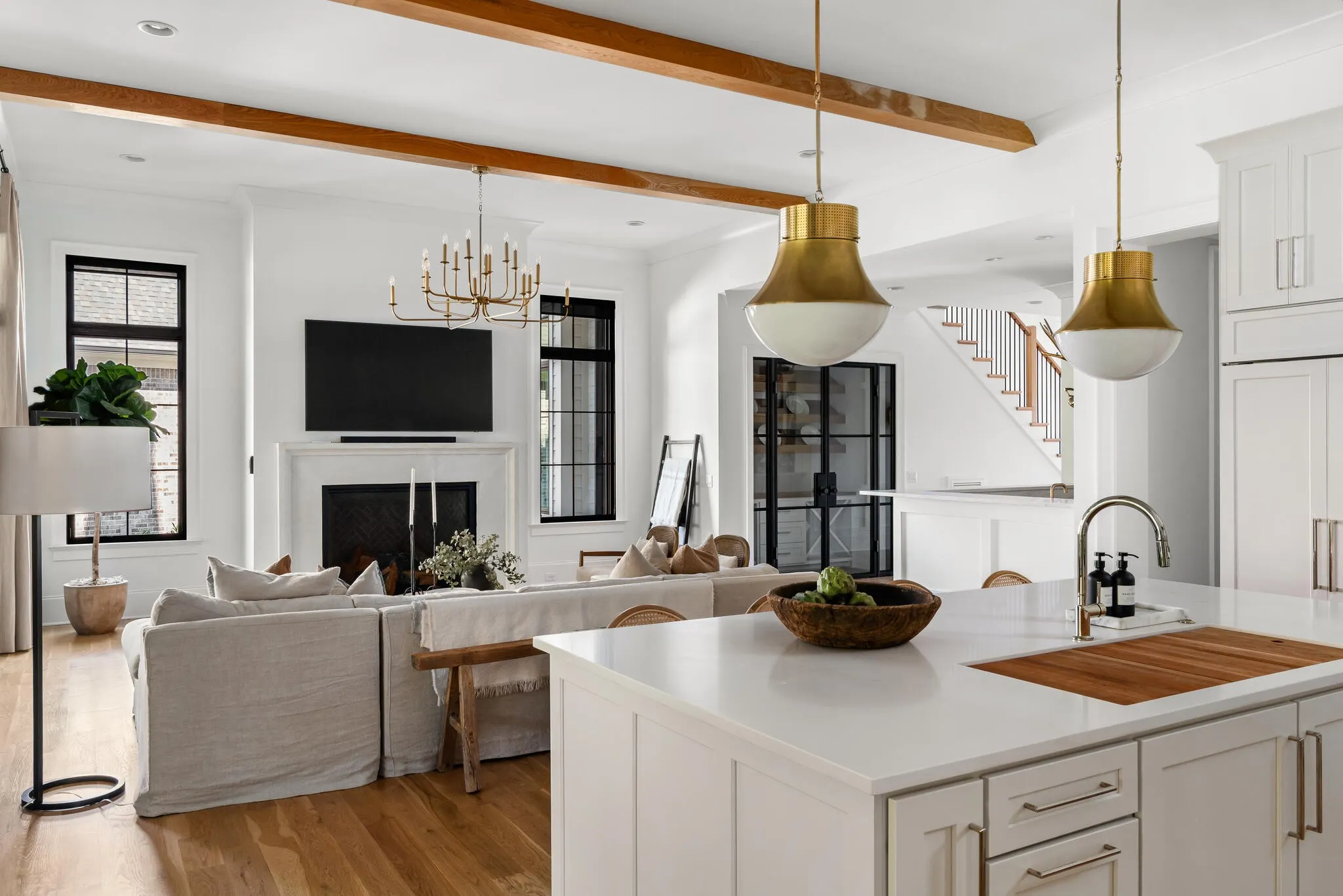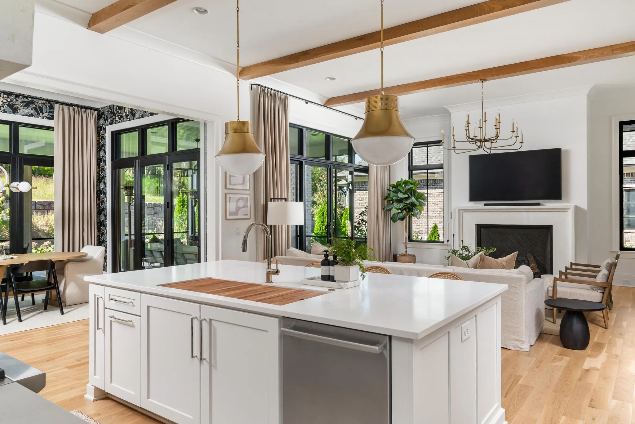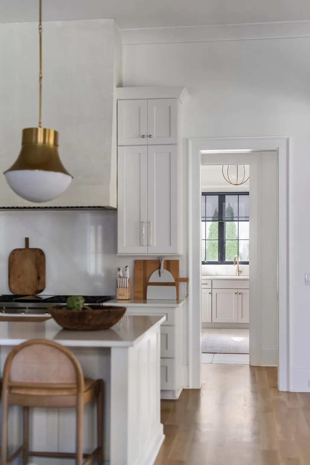 The bright white brick exterior sets the tone, while inside you’ll find open, light-filled spaces, warm hardwood floors, and sleek black-framed windows that give the home a clean, modern feel. The main level was designed with entertaining in mind—featuring a large chef’s kitchen with an oversized island, a full bar, and a wine closet that’s both stylish and practical. The primary suite feels like a private getaway, with a spa-like bathroom, soaking tub, double vanities, and even its own wet bar.\n