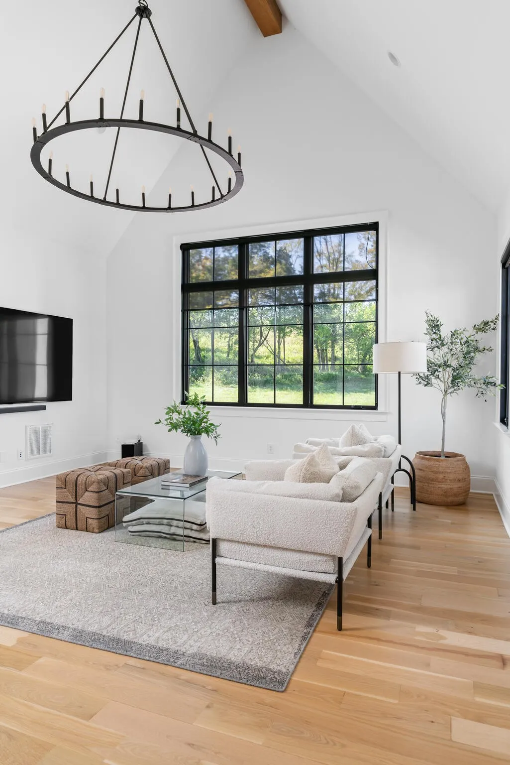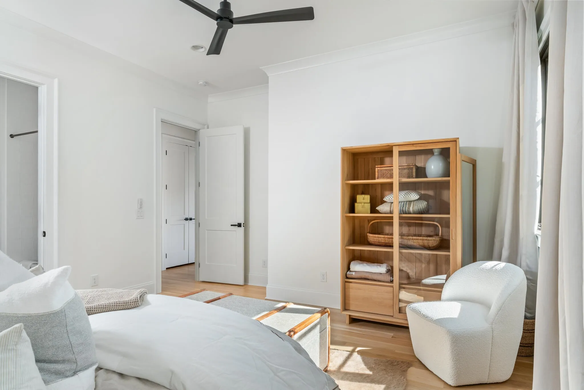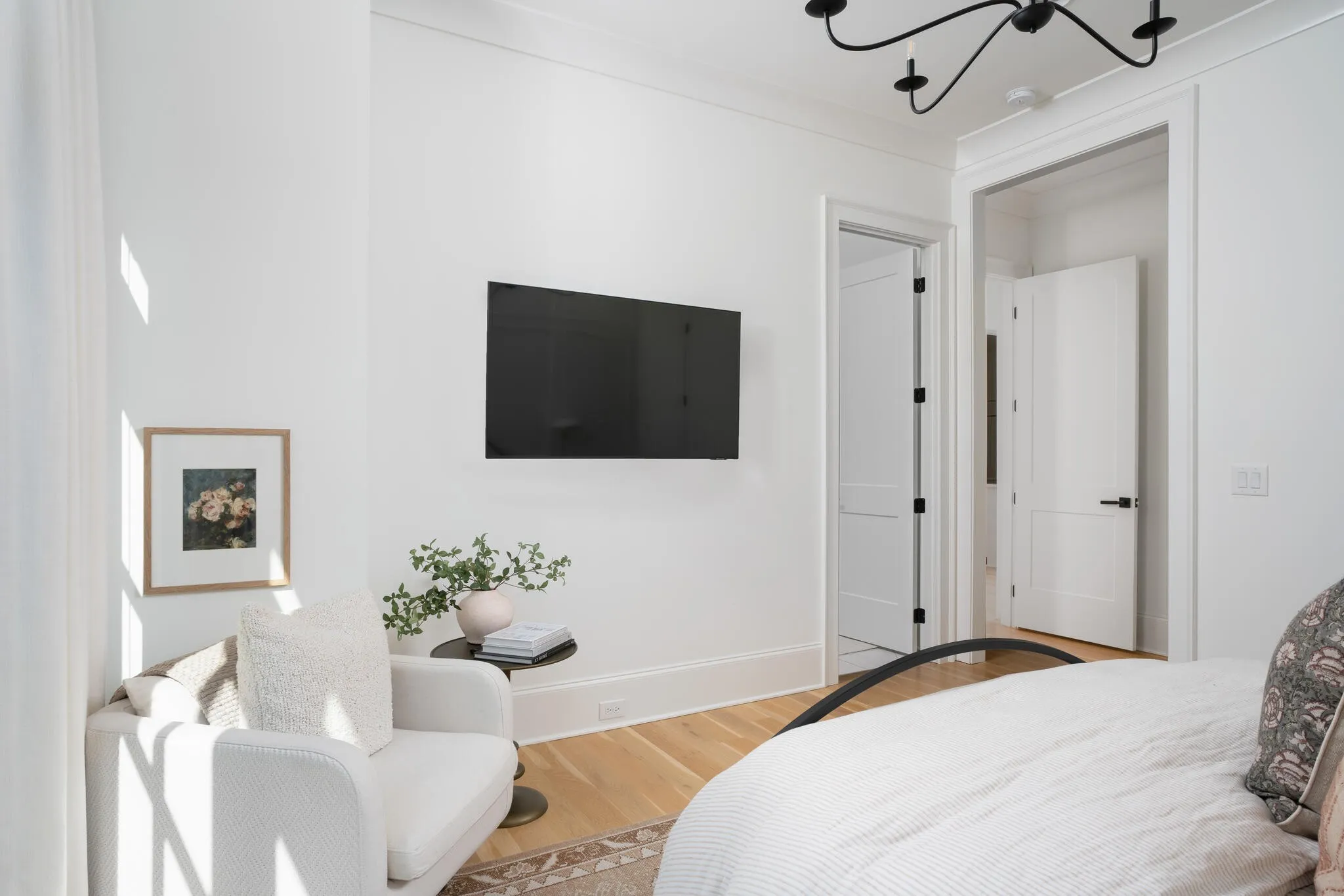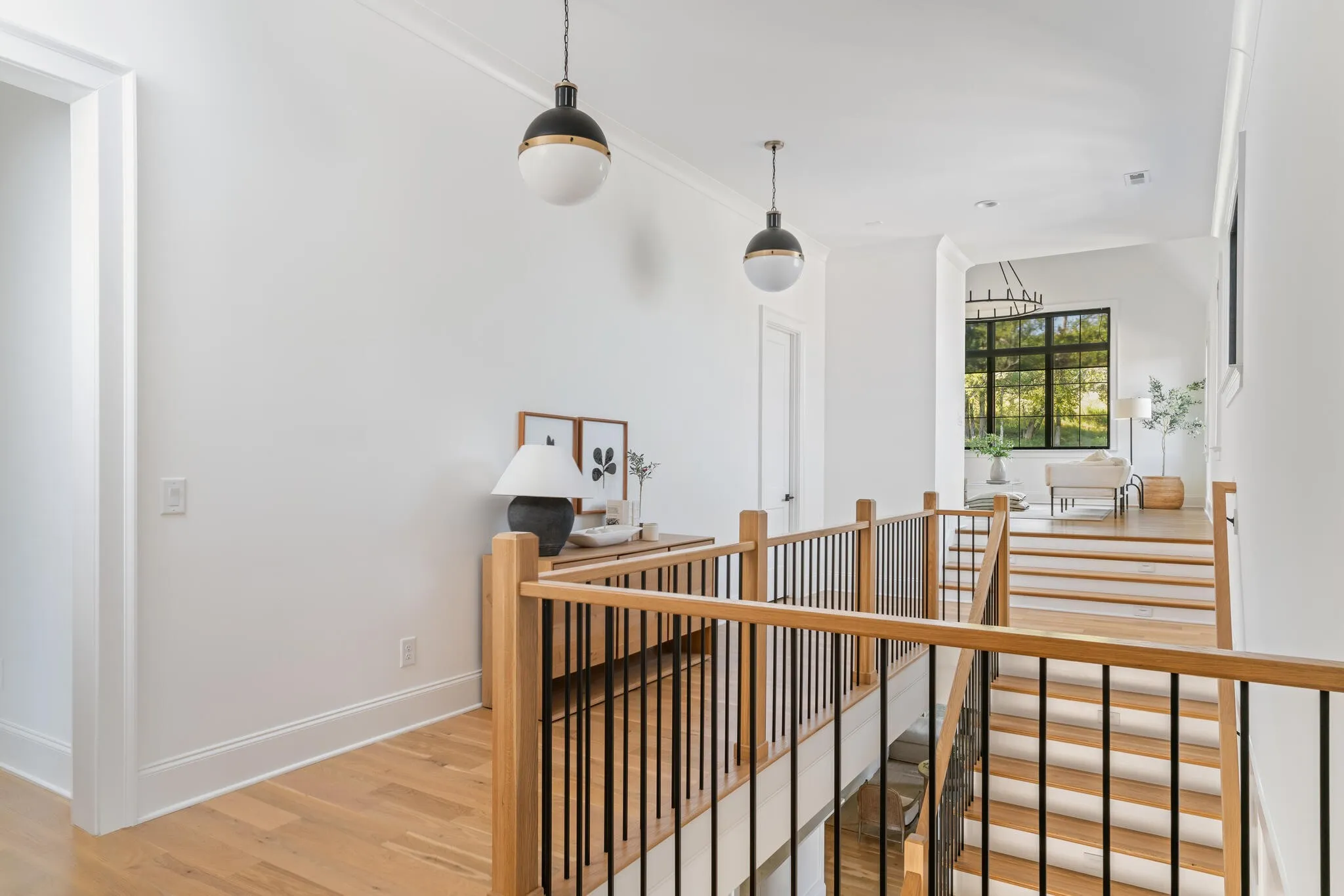 The bright white brick exterior sets the tone, while inside you’ll find open, light-filled spaces, warm hardwood floors, and sleek black-framed windows that give the home a clean, modern feel. The main level was designed with entertaining in mind—featuring a large chef’s kitchen with an oversized island, a full bar, and a wine closet that’s both stylish and practical. The primary suite feels like a private getaway, with a spa-like bathroom, soaking tub, double vanities, and even its own wet bar.\n