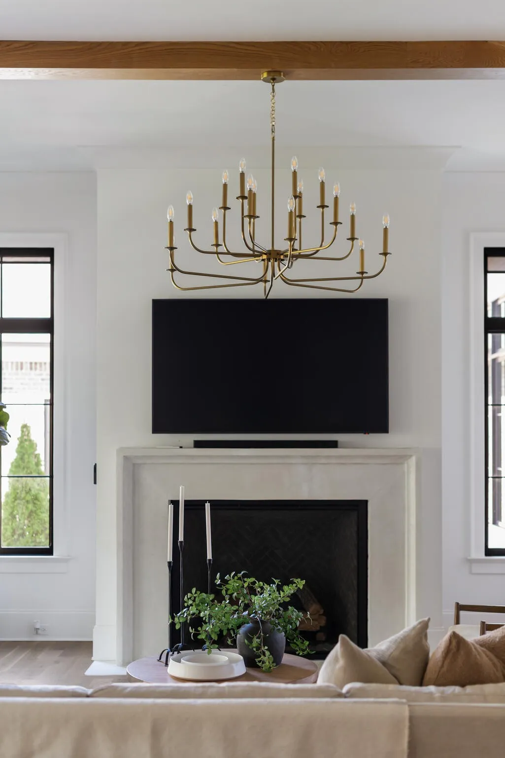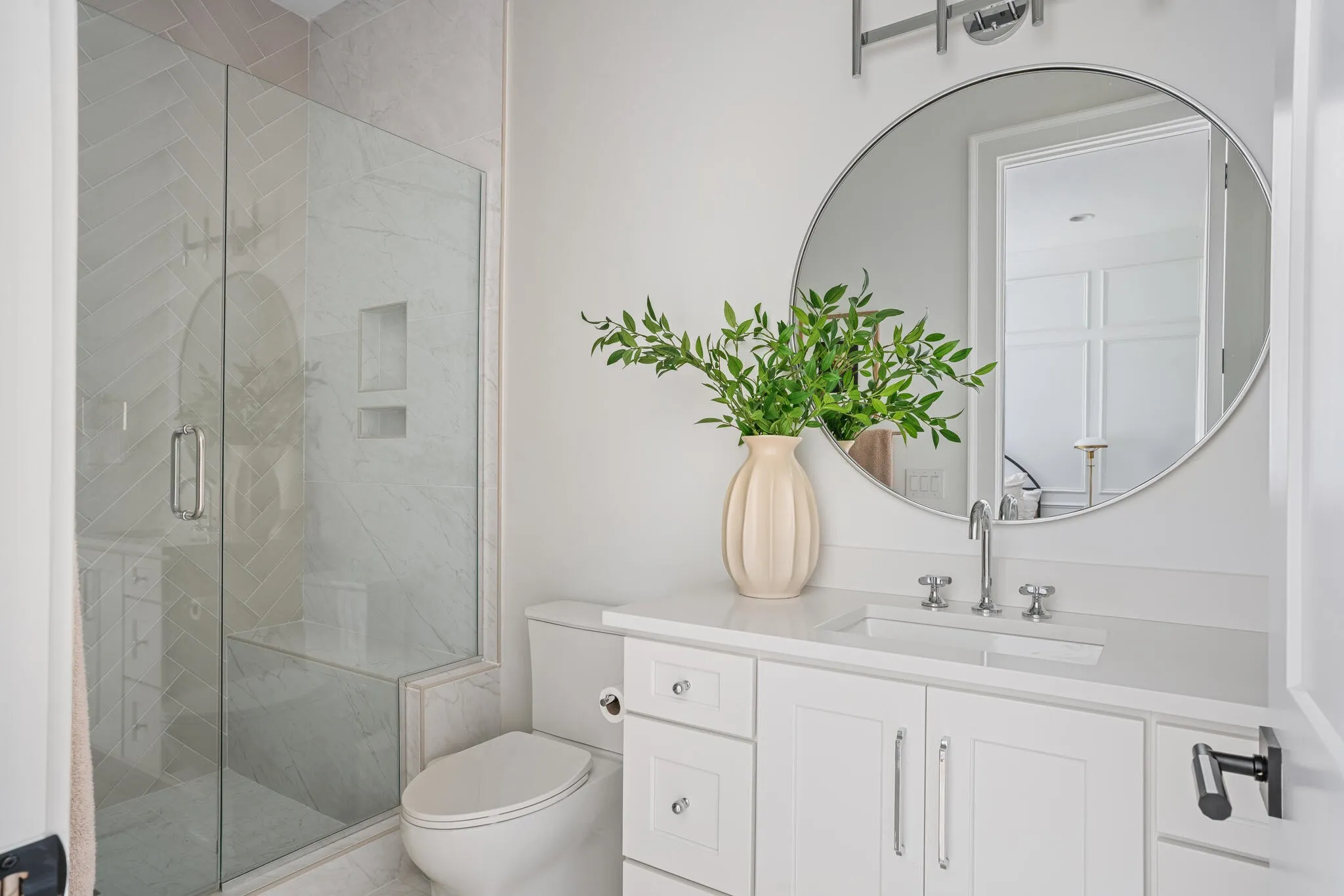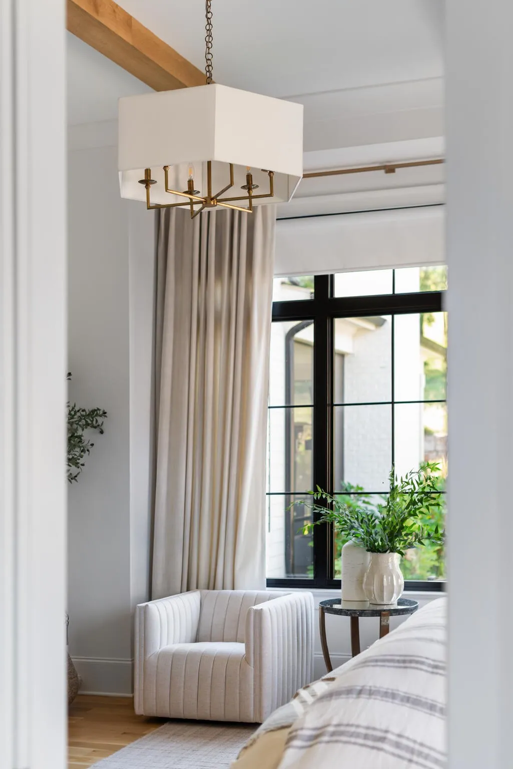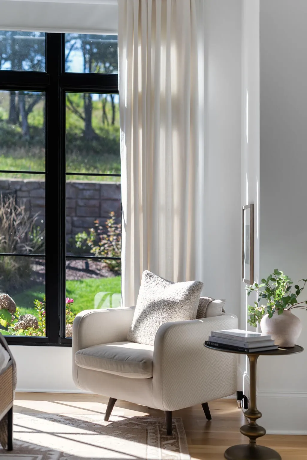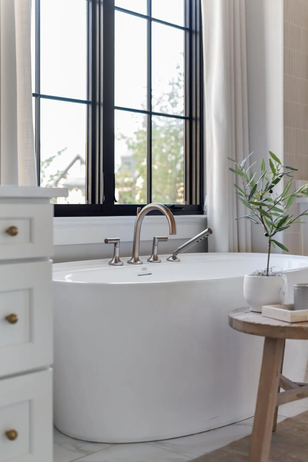 The bright white brick exterior sets the tone, while inside you’ll find open, light-filled spaces, warm hardwood floors, and sleek black-framed windows that give the home a clean, modern feel. The main level was designed with entertaining in mind—featuring a large chef’s kitchen with an oversized island, a full bar, and a wine closet that’s both stylish and practical. The primary suite feels like a private getaway, with a spa-like bathroom, soaking tub, double vanities, and even its own wet bar.\n