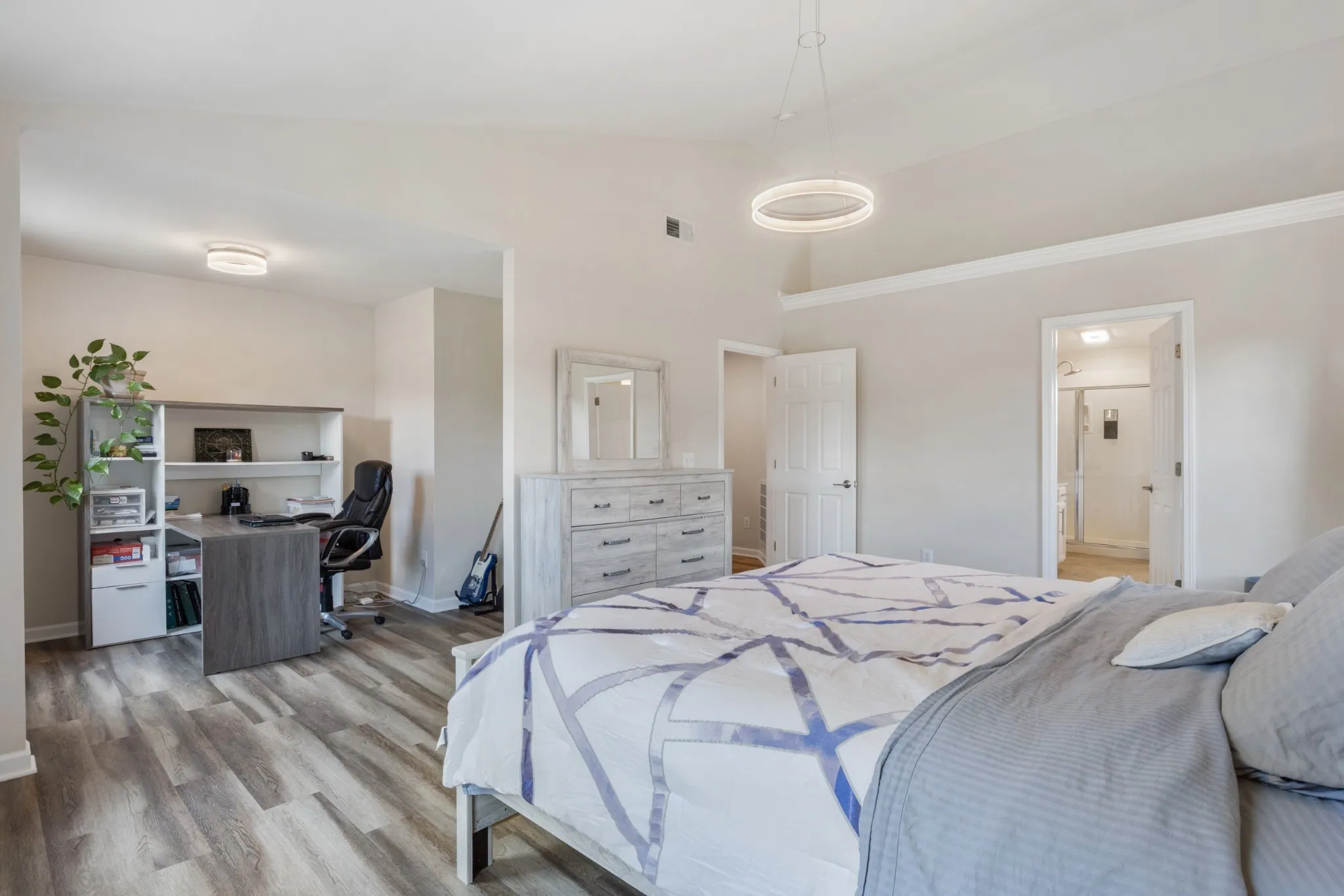 Fantastic Location close to Amenities and wonderful schools. Tucked at the end of a peaceful cul-de-sac, 3018 Langston Place delivers elegance, comfort, and function with thoughtful touches and top-of-the-line finishes throughout. This exceptional home features 4 spacious bedrooms, 4 full bathrooms, a flex room/5th bedroom option, and a layout designed to embrace both everyday living and stylish entertaining. From the moment you arrive, you’re greeted by the charm of a rocking chair front porch, the perfect place to sip morning coffee or greet neighbors with a smile. Situated on a meticulously landscaped lot, the home offers an incredible covered back deck that overlooks a lush, park-like backyard enclosed by a privacy fence—your own private oasis for relaxation, play, or hosting unforgettable gatherings. Step inside to be wowed by the seamless flow of luxury LVP flooring that runs throughout the home, blending durability with the timeless elegance of hardwood aesthetics. Every corner of this home reflects thoughtful design and high-end craftsmanship.Whether you’re preparing weeknight meals or entertaining a crowd, this designer kitchen is sure to impress: Double ovens for effortless multitasking An oversized refrigerator that keeps everything organized and within reach 6-burner gas cooktop for professional-grade performance. Stylish farmhouse sink with a bold touch of modern farmhouse charm. Stunning quartz countertops with ample prep space. A generously sized walk-in pantry to keep everything tucked away yet accessible.Open to the living and dining areas, this kitchen serves as the heart of the home, inviting connection and conversation. Escape to the tranquility of the primary bedroom, thoughtfully designed for rest and renewal. You’ll love the:Spacious layout with a cozy sitting area—ideal for a private reading nook or morning coffee spot. Walk-in closet for excellent storage Luxurious en suite bathroom featuring his-and-hers vanities