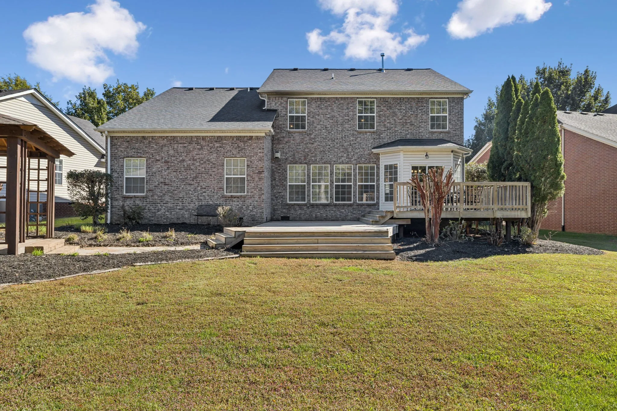Spacious 5 Bedroom Home backing to Green Space in a desirable neighborhood! Timeless brick design and incredibly livable- Main Floor offers a primary suite/bath, informal and formal dining areas, designated office space plus every room is wired with ethernet, open layout, fireplace with built-ins and a wall of windows, and generous laundry space! Kitchen offers a gas range and granite countertops. Upper level opens up to a sizable recreation area, and 4 additional bedrooms- one has an ensuite private bath! Sit on the back deck and enjoy views of the green space or relax in the gazebo area. Freshly painted to welcome you home. Neighborhood Pool! Williamson County schools.