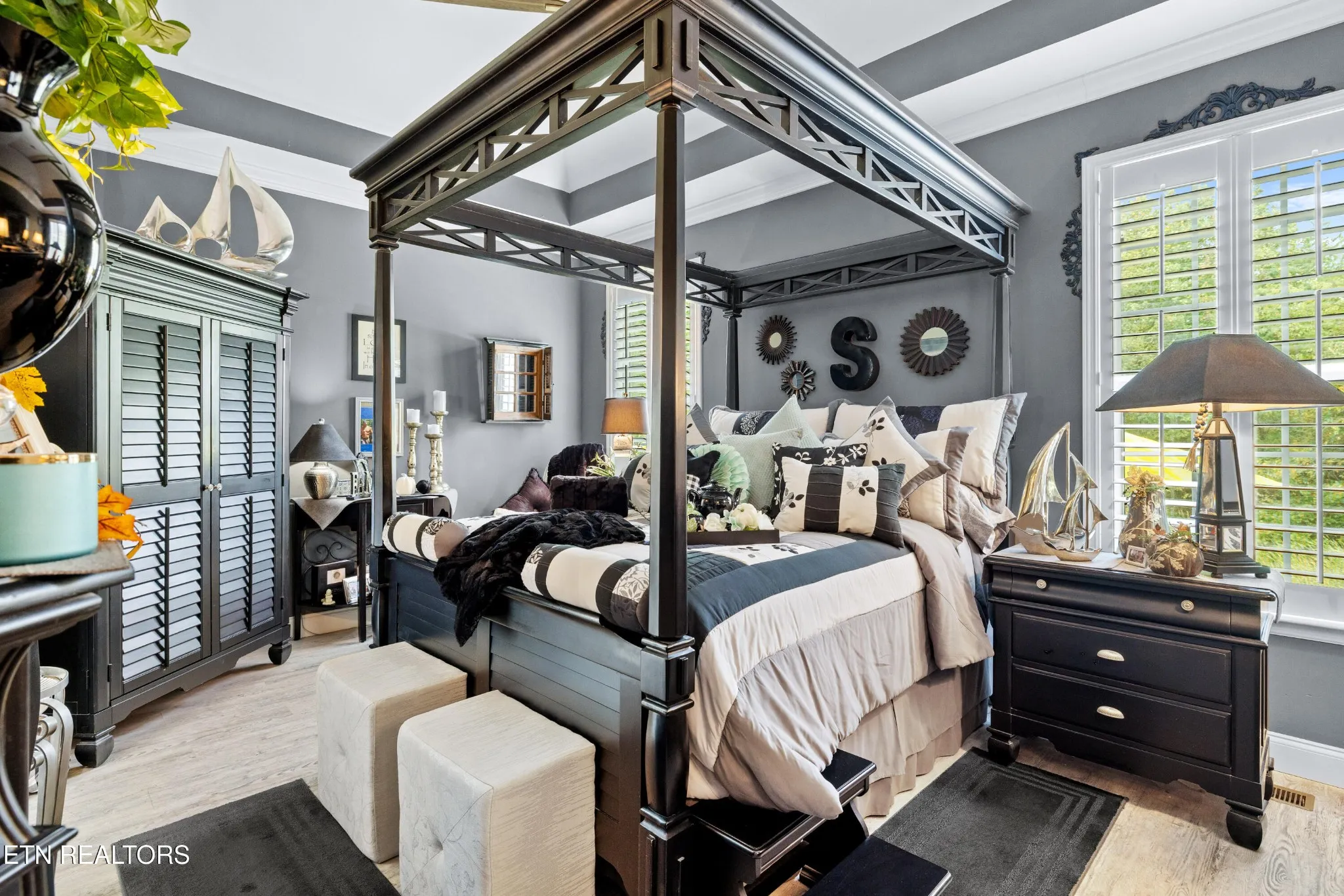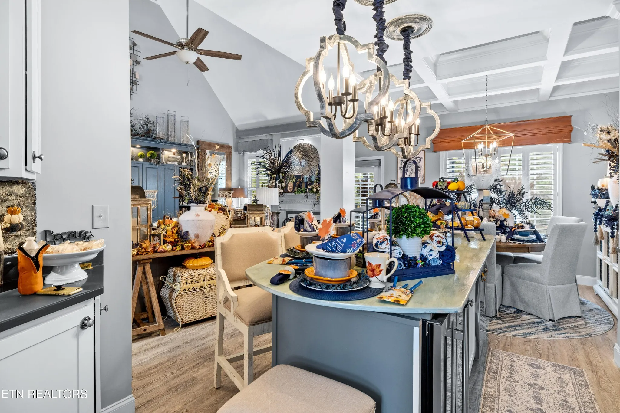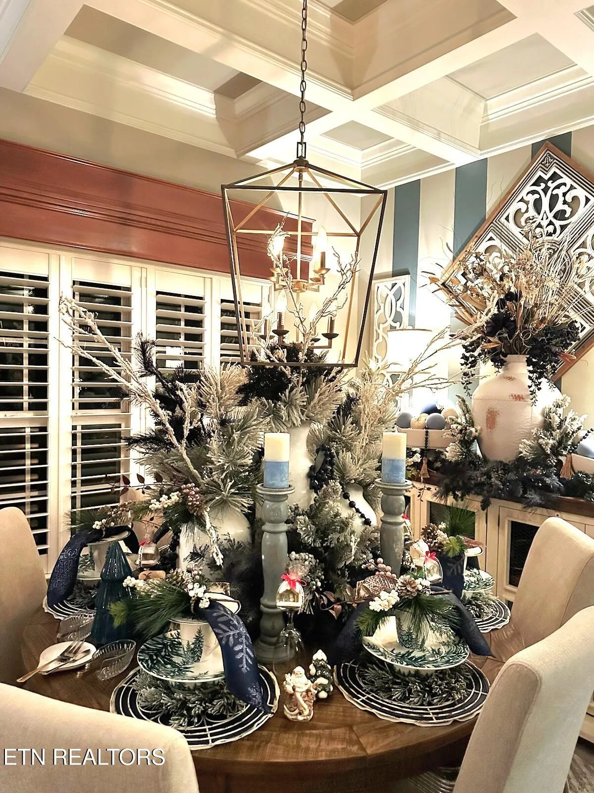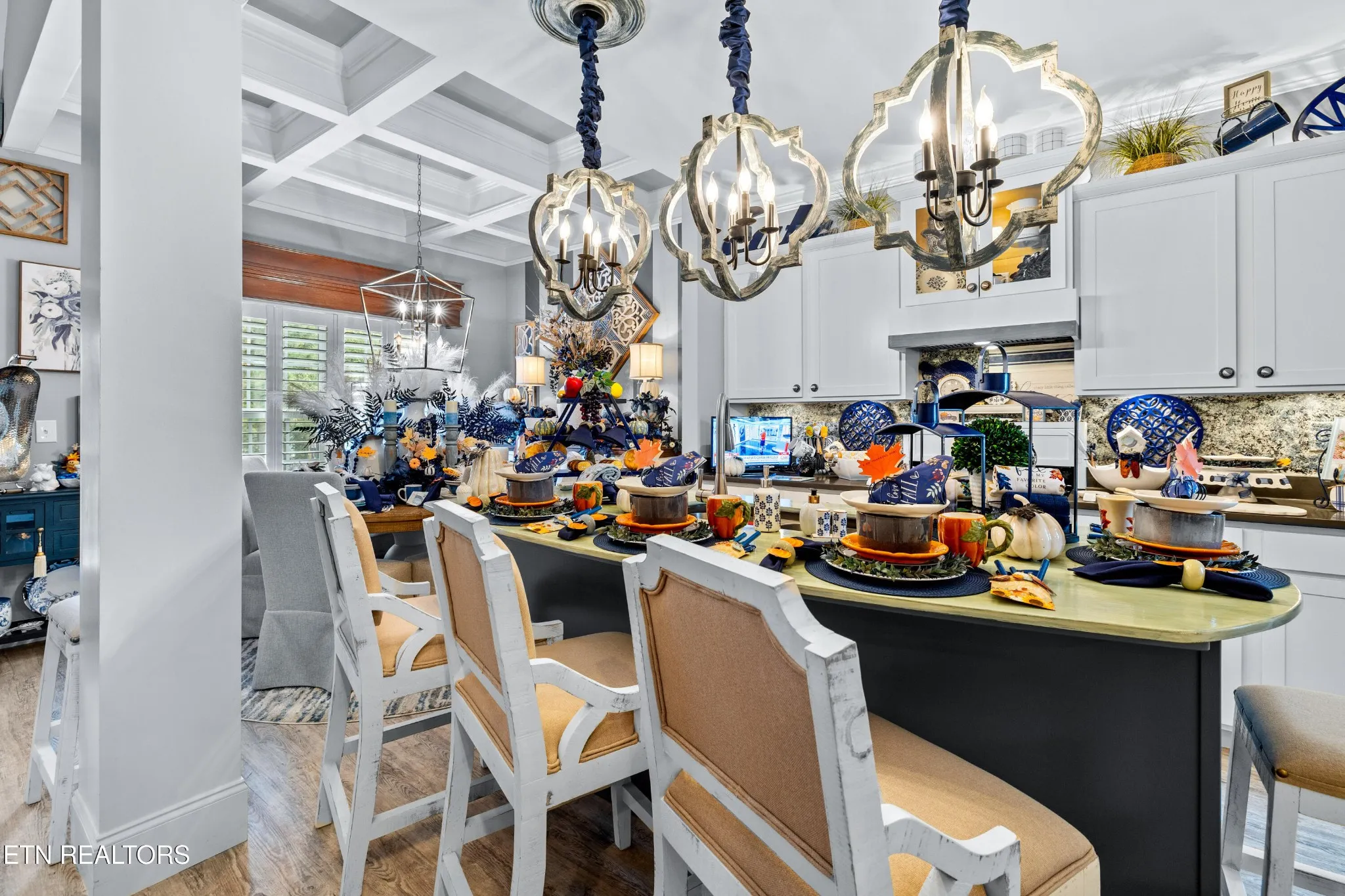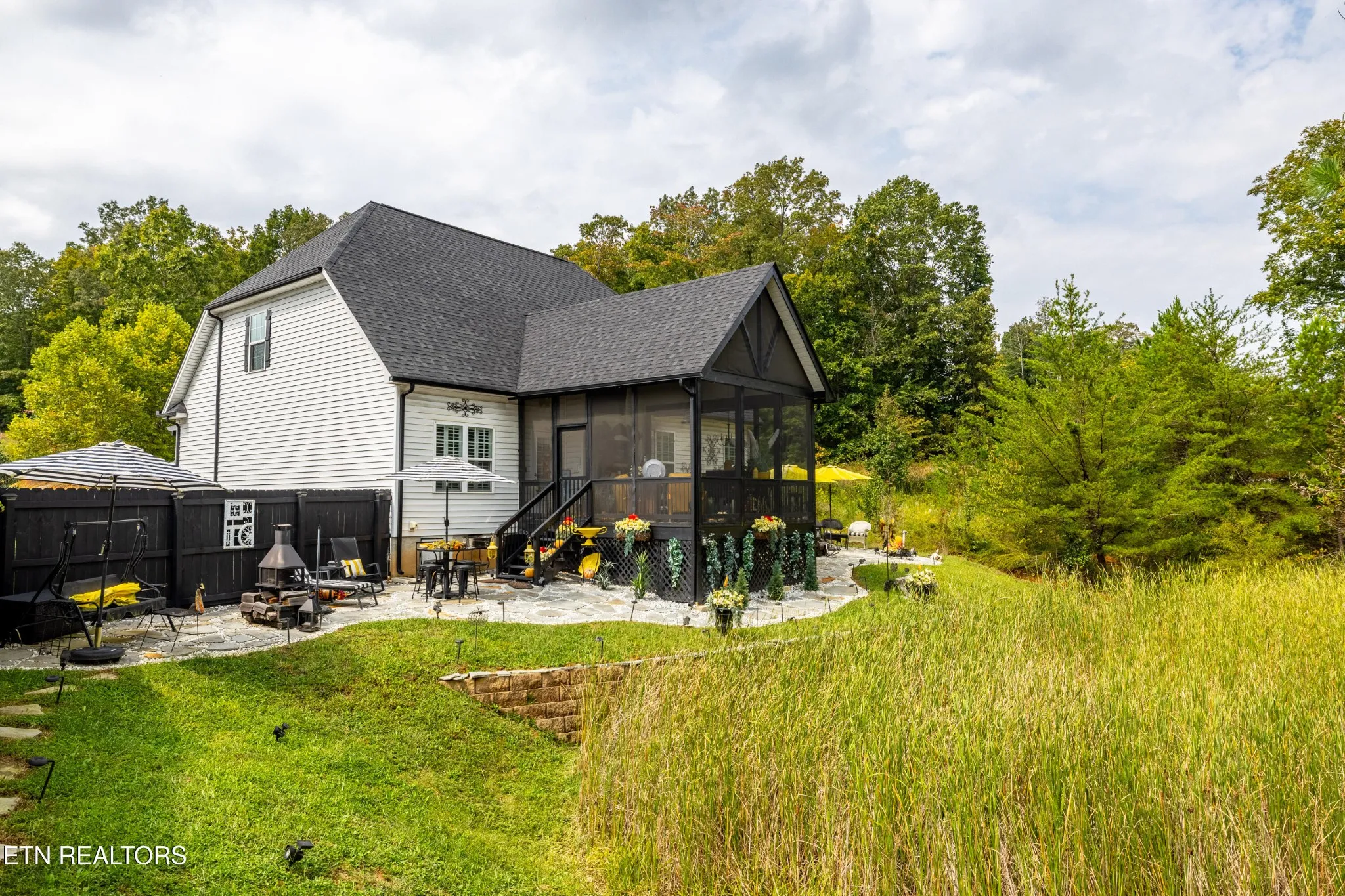 Welcome to this beautiful Lenoir City home, featuring thoughtfully designed finishes and plenty of living space. Inside you will find interior trim details that include crown molding, wainscoting, 5-panel molded doors, decorative beams in the living room and a coffered ceiling in the eat-in kitchen. The main-level primary suite features a grand trey ceiling with crown molding, a jetted tub, walk-in tile shower and walk-in closet. The kitchen is open to the living room with a large island, perfect for entertaining. Stainless steel appliances, including the refrigerator and wine fridge, complete the kitchen. Custom shutters and blinds accent every room including the garage. All bedrooms including the great room and bonus room have ceiling fans. Cable is hardwired in all rooms and the garage. The dining room can also serve as a sitting area or home office. Upstairs offers two additional bedrooms and one bath, plus a large bonus room with a walk-in closet, giving flexibility for guests or hobbies. Outdoor spaces include a screened deck overlooking the retention pond, where summer cattails create a beautiful natural backdrop. The screened deck features additional screening installed beneath the deck boards, plus a vaulted tongue-and-groove ceiling accented by a beam and ceiling fan. It is also pre-wired for cable, making it easy to enjoy TV outdoors. There are multiple flagstone patio areas in the backyard and around the retention pond which are perfect for relaxing and entertaining. Located at the end of the street and within city limits, this home combines comfort, style, and privacy. Buyer to verify all information including square footage.