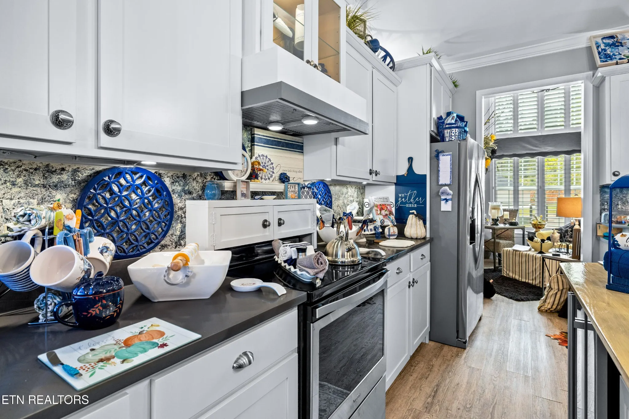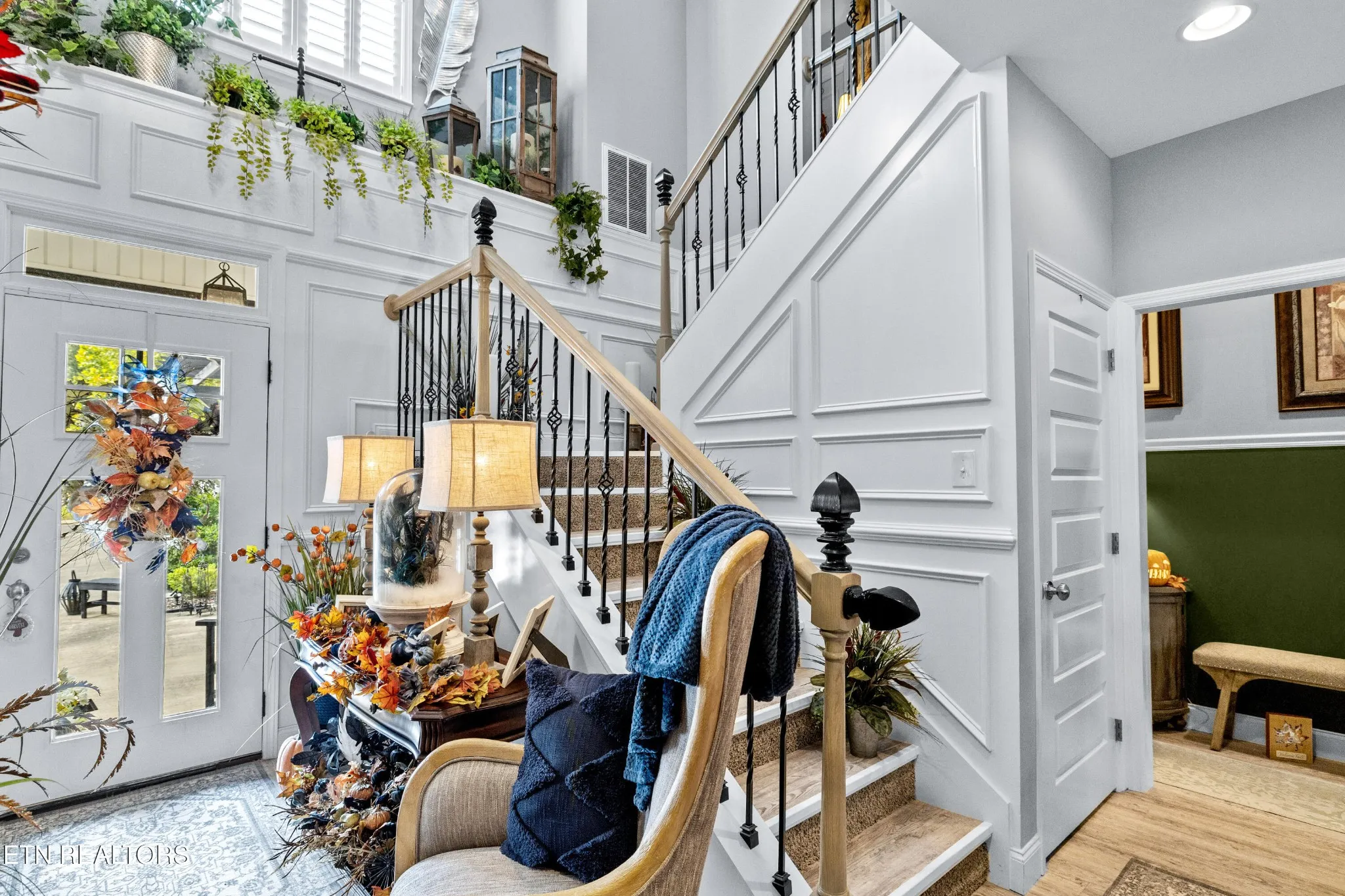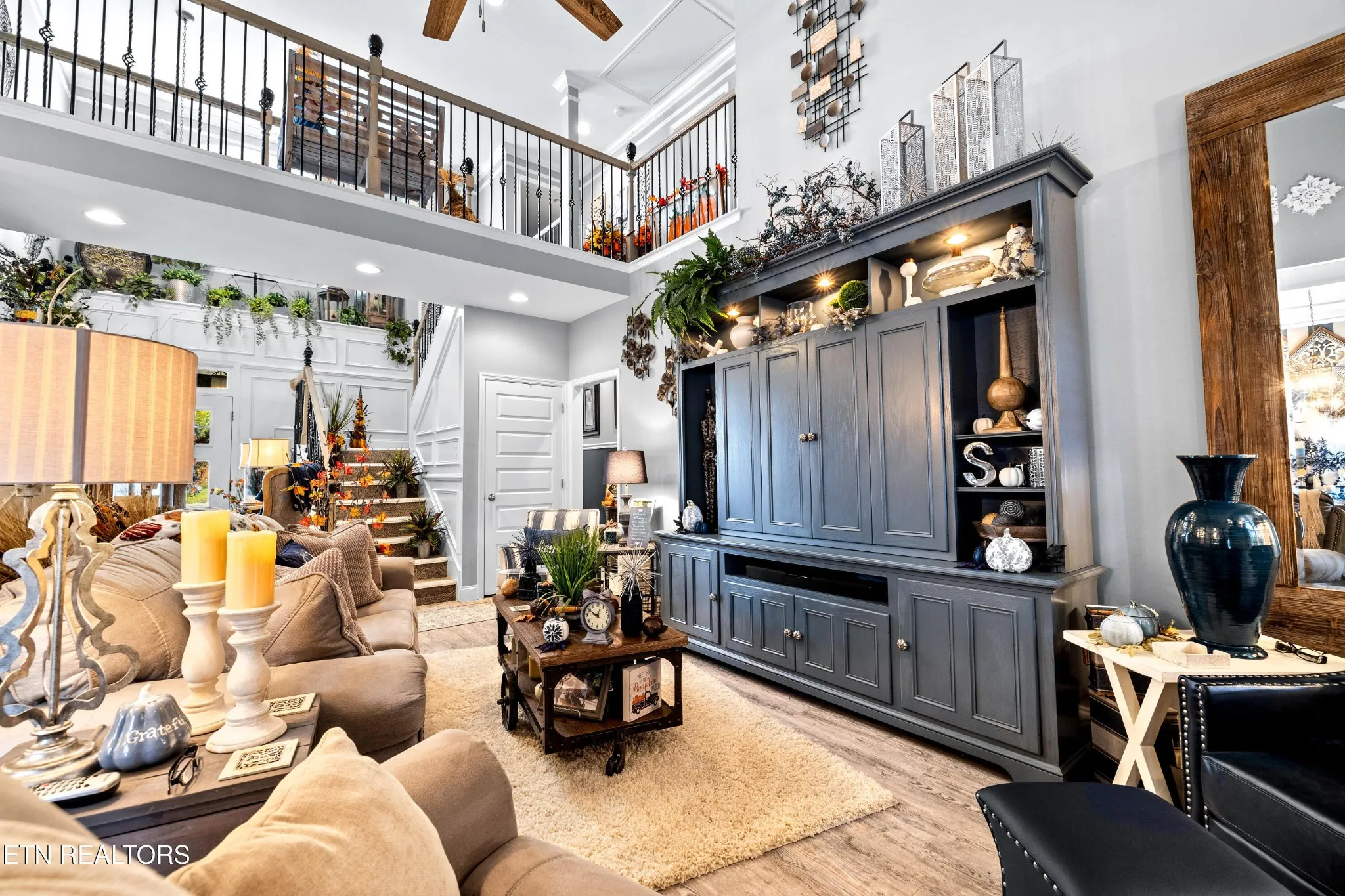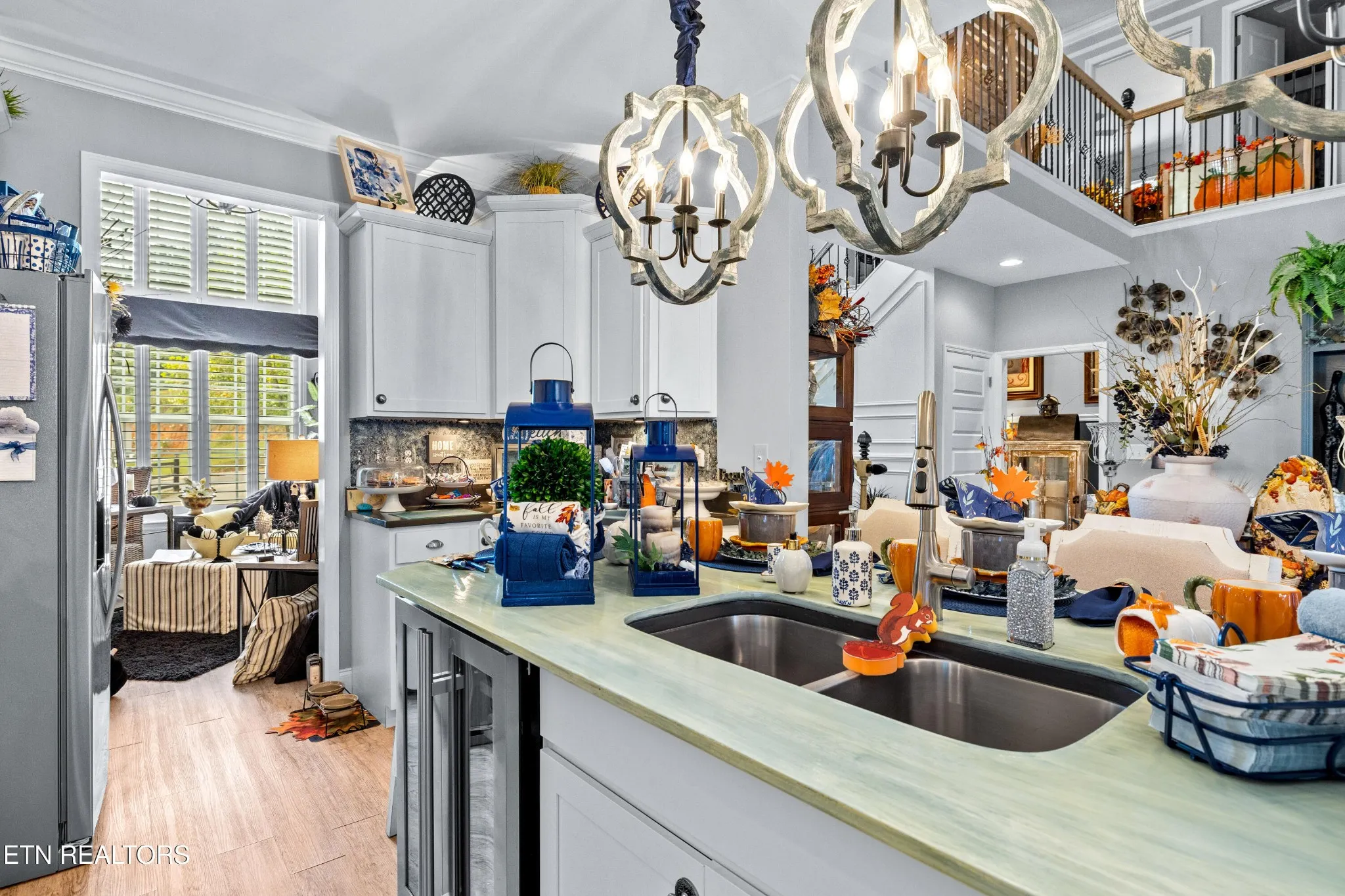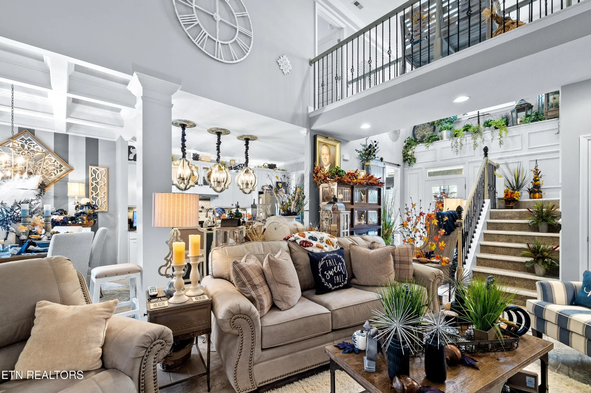 Welcome to this beautiful Lenoir City home, featuring thoughtfully designed finishes and plenty of living space. Inside you will find interior trim details that include crown molding, wainscoting, 5-panel molded doors, decorative beams in the living room and a coffered ceiling in the eat-in kitchen. The main-level primary suite features a grand trey ceiling with crown molding, a jetted tub, walk-in tile shower and walk-in closet. The kitchen is open to the living room with a large island, perfect for entertaining. Stainless steel appliances, including the refrigerator and wine fridge, complete the kitchen. Custom shutters and blinds accent every room including the garage. All bedrooms including the great room and bonus room have ceiling fans. Cable is hardwired in all rooms and the garage. The dining room can also serve as a sitting area or home office. Upstairs offers two additional bedrooms and one bath, plus a large bonus room with a walk-in closet, giving flexibility for guests or hobbies. Outdoor spaces include a screened deck overlooking the retention pond, where summer cattails create a beautiful natural backdrop. The screened deck features additional screening installed beneath the deck boards, plus a vaulted tongue-and-groove ceiling accented by a beam and ceiling fan. It is also pre-wired for cable, making it easy to enjoy TV outdoors. There are multiple flagstone patio areas in the backyard and around the retention pond which are perfect for relaxing and entertaining. Located at the end of the street and within city limits, this home combines comfort, style, and privacy. Buyer to verify all information including square footage.