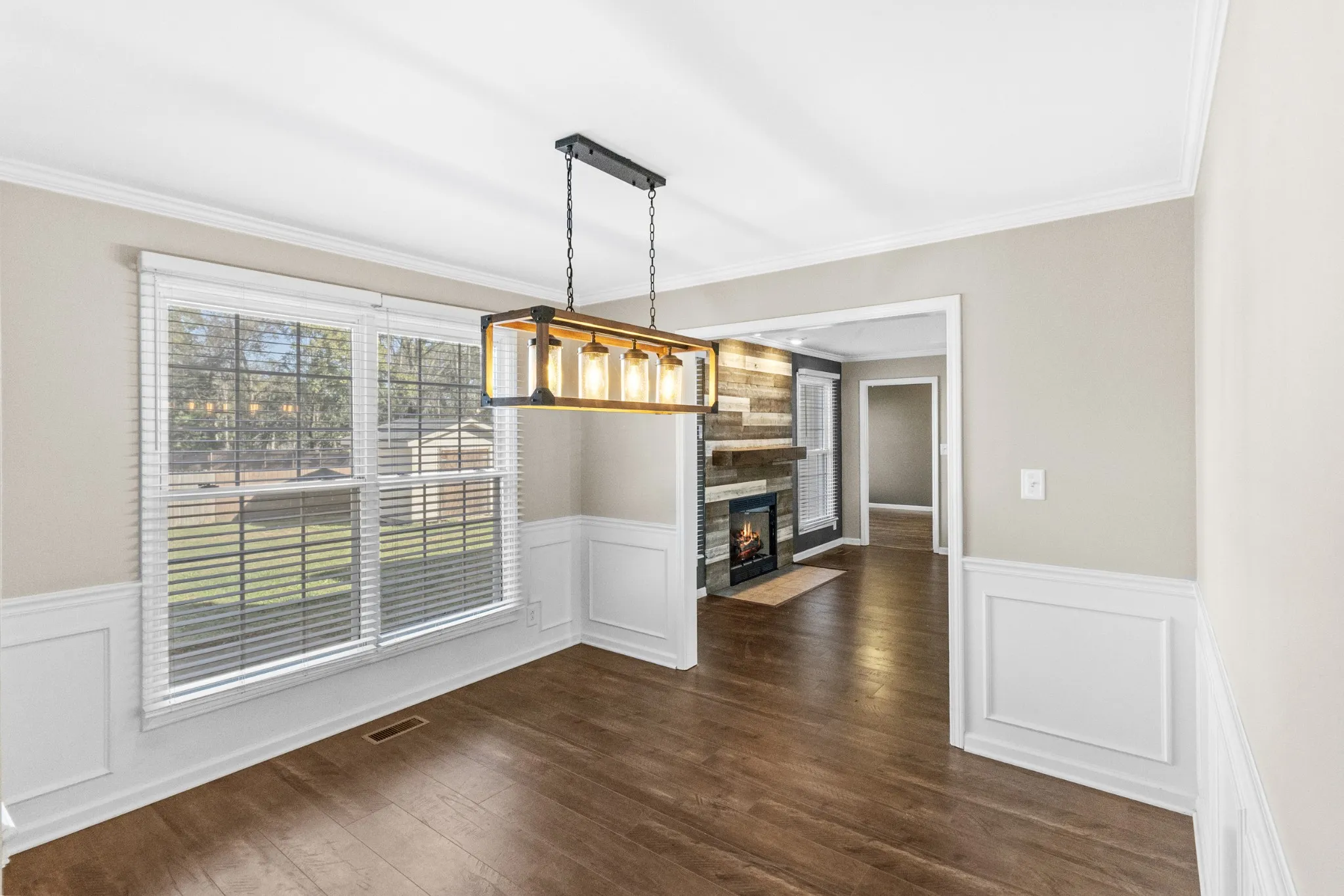 This charming single-level home features beautiful laminate hardwood flooring and a cozy fireplace in the living room, creating a warm and inviting atmosphere. The renovated kitchen offers modern updates and style, perfect for culinary enthusiasts. The dining room is enhanced with updated lighting and wainscoting, ideal for family meals and entertaining. The spacious primary bedroom includes a walk-in closet and an en-suite bathroom with a double vanity, a luxurious soaker tub, and a separate shower for added comfort and convenience. Enjoy outdoor living in the large, level fenced yard—perfect for gatherings, play, and gardening. Located conveniently close to shopping, dining, and a movie theater, this home combines comfort, style, and accessibility in a desirable neighborhood.