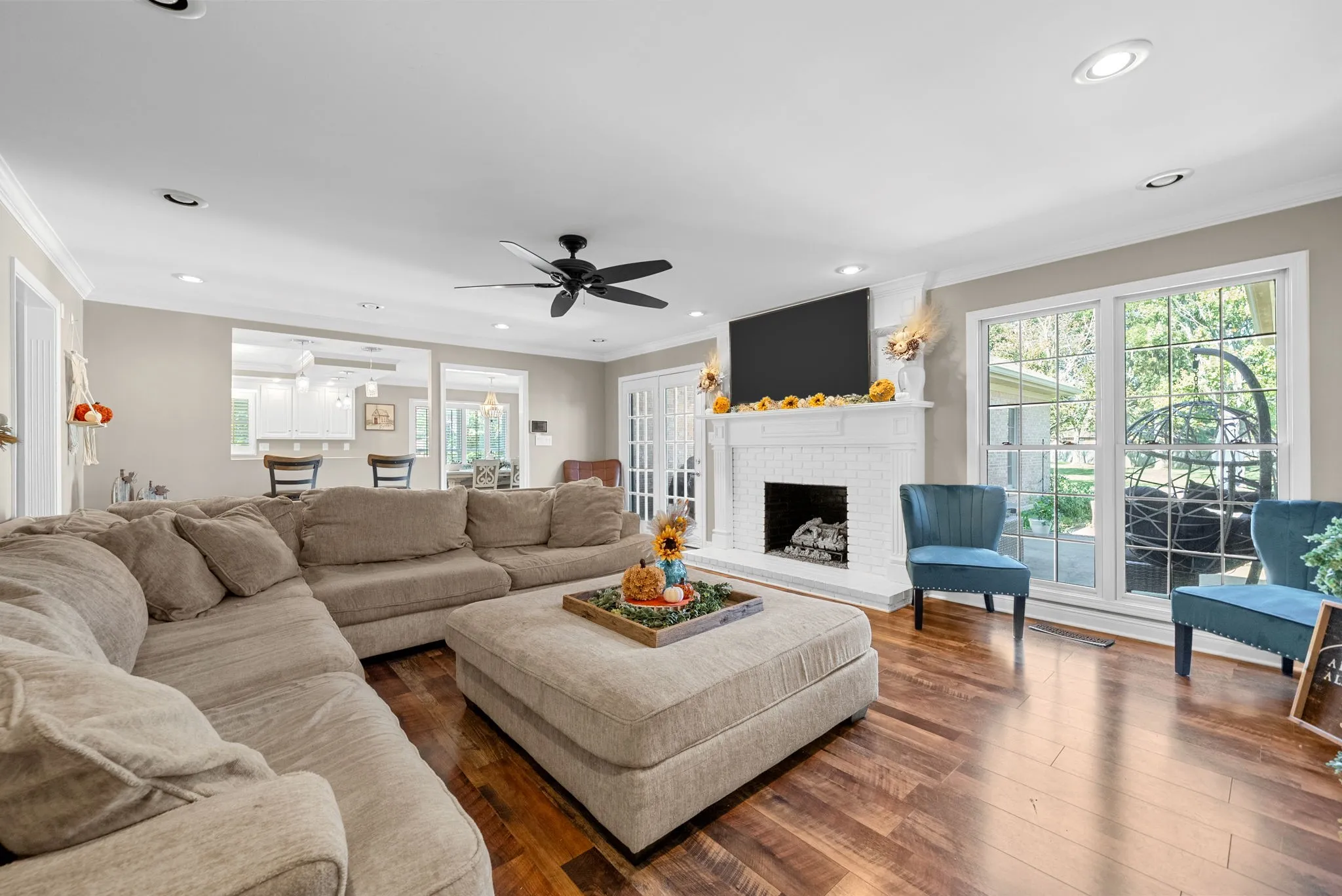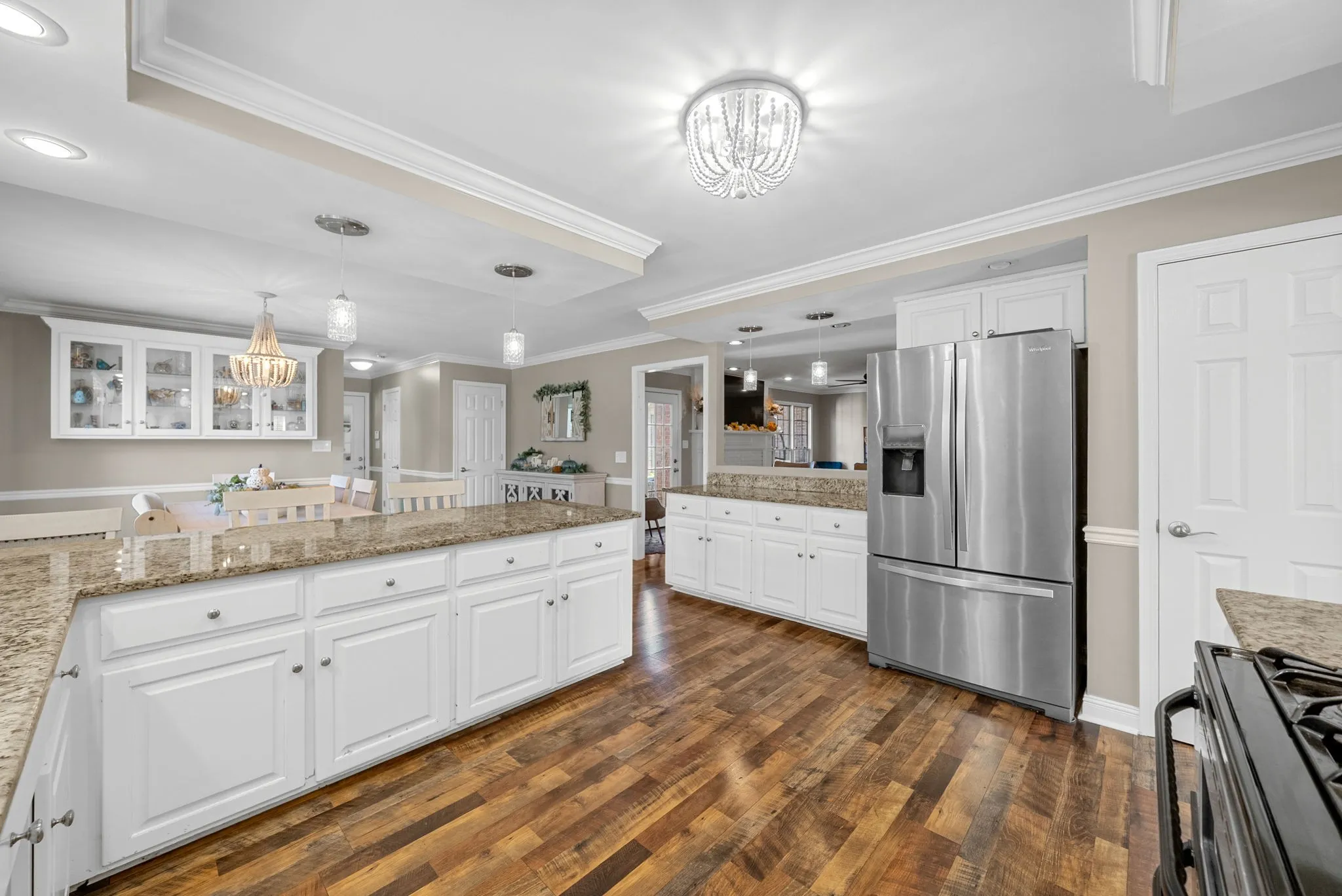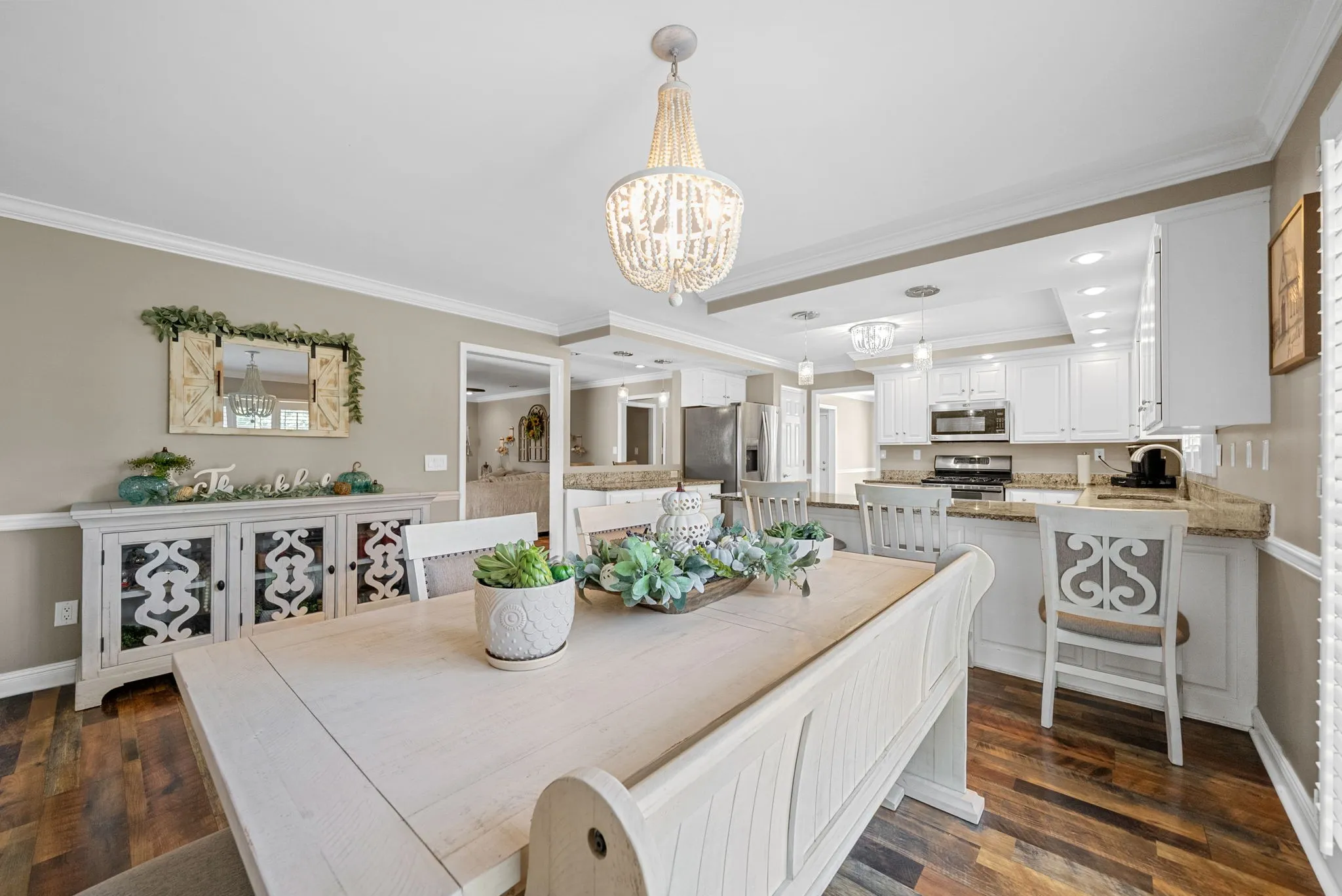 Step inside to find thoughtful details throughout, including plantation shutters, updated flooring, and fresh paint. The heart of the home is the updated kitchen, complete with granite countertops, professionally painted cabinetry, modern fixtures, and ample cabinetry, & two pantries, seamlessly flowing into a warm and inviting living area — perfect for gatherings or cozy nights in.\n