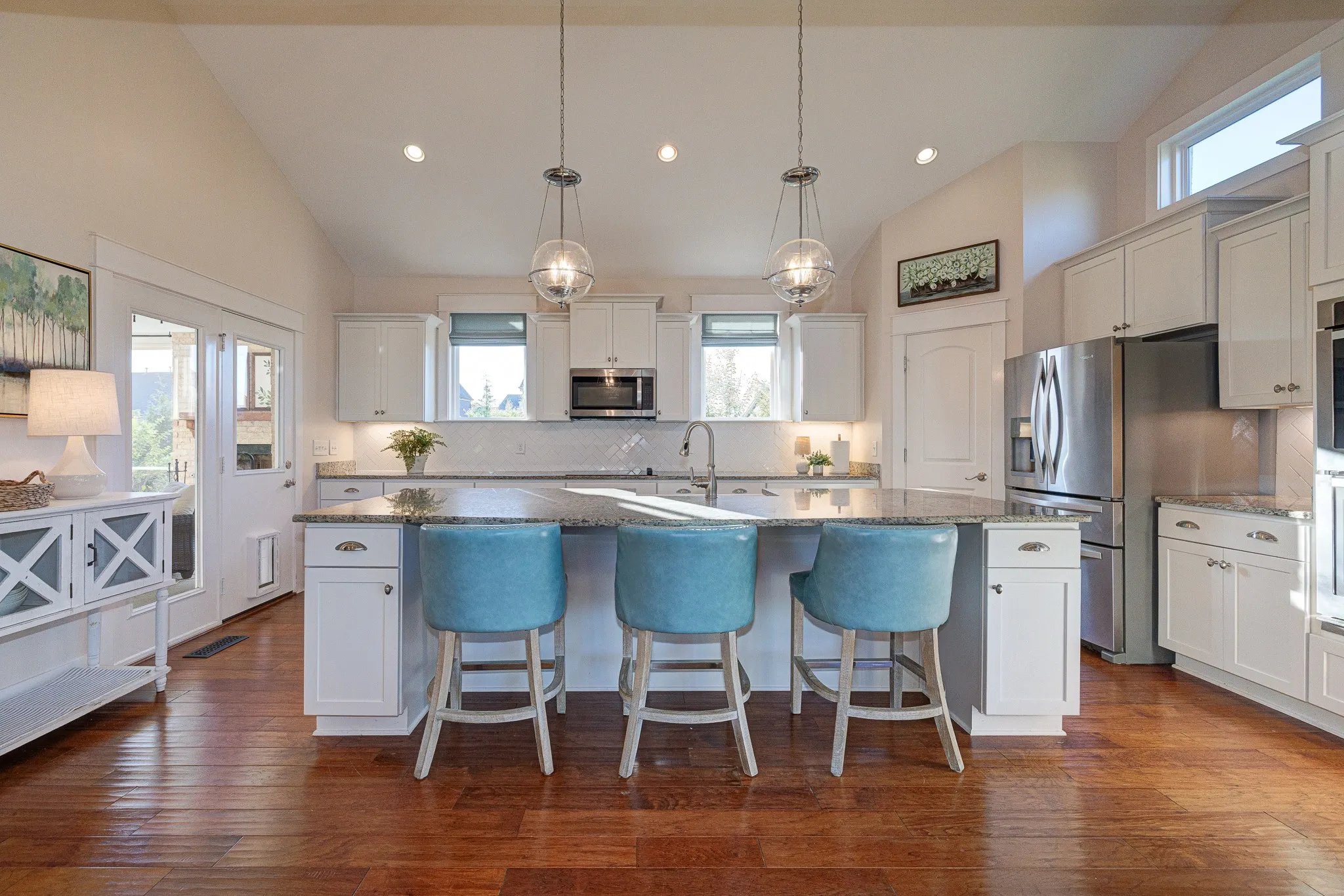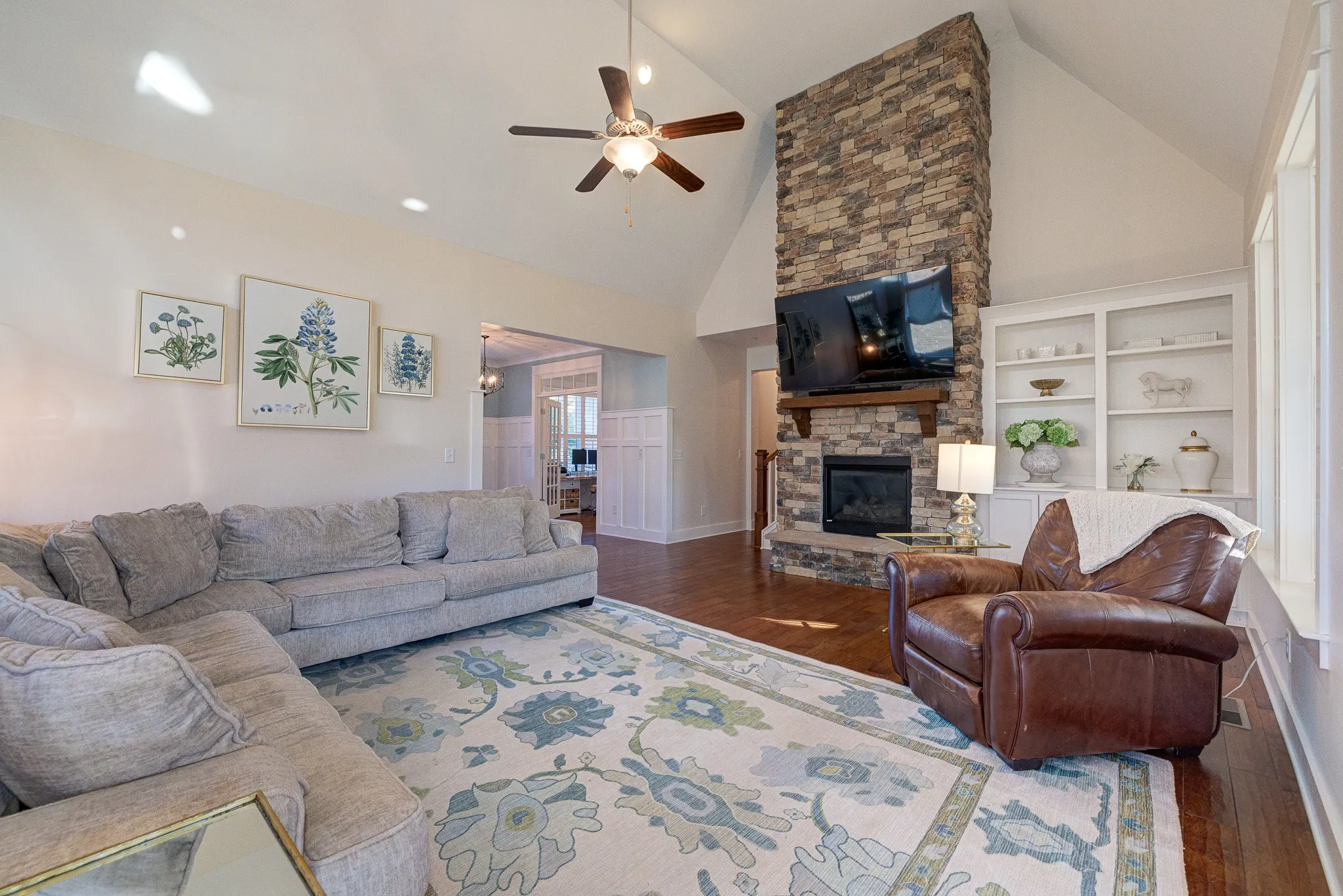 Inside, everyday living flows on the main level: a true primary suite plus a second bedroom, a private study with French doors, and a vaulted Great Room anchored by a stacked-stone gas fireplace and built-in bookshelf. The bright, airy kitchen is made for gathering—huge island, farmhouse sink, granite counters, and double ovens—so breakfast, homework, and dinner parties all have a home.\n