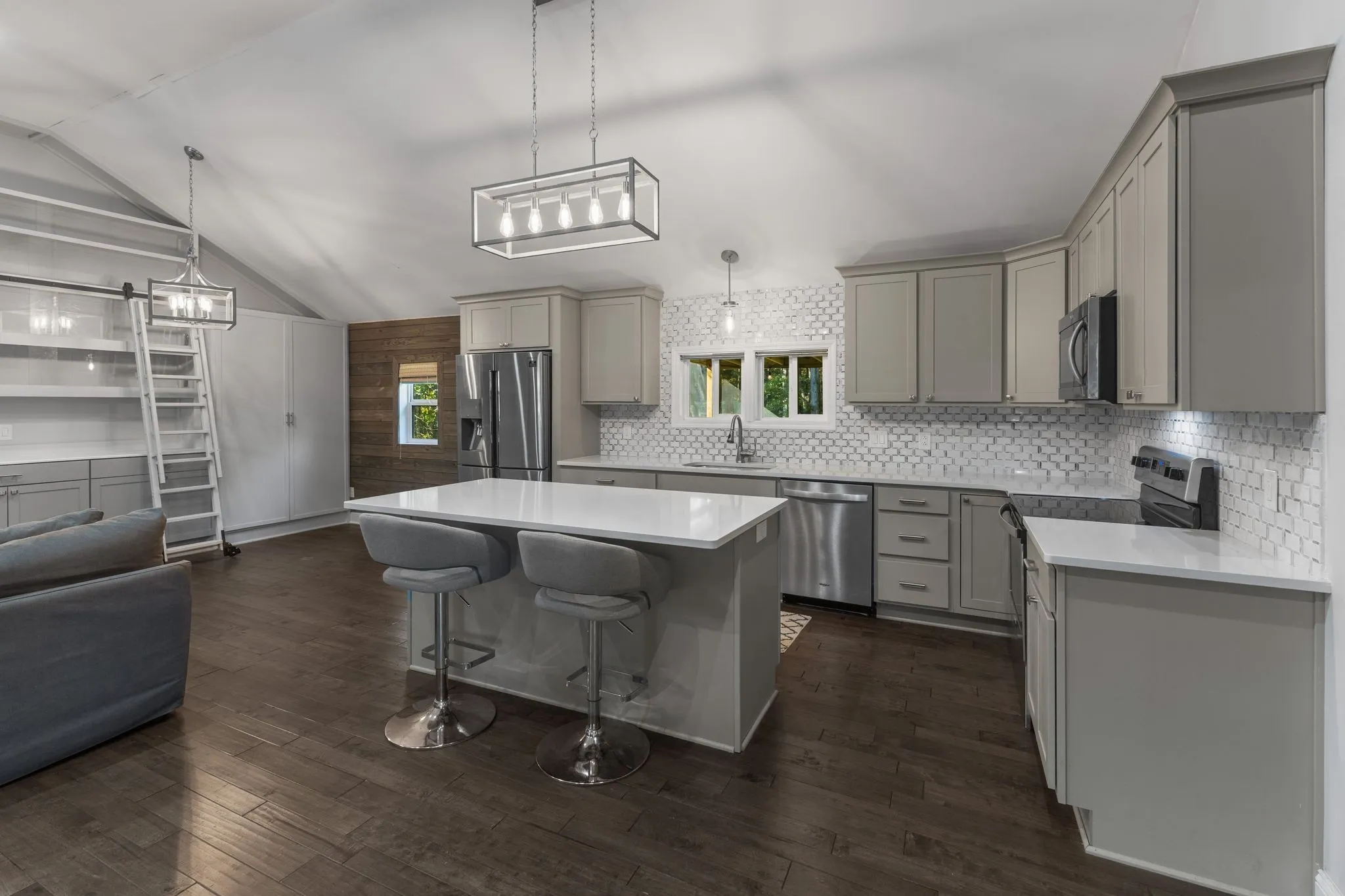 The stunning kitchen offers Quartz countertops, tile backsplash, stainless steel appliances, and a huge pantry with a rustic barn door. The spacious great room boasts custom built-in storage with a bookcase Murphy door and a rolling library ladder, a true showstopper!