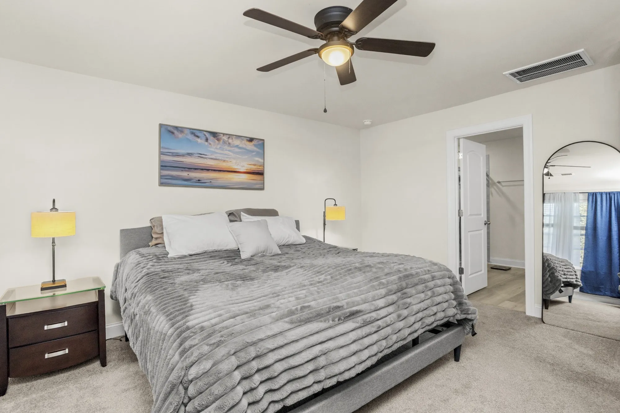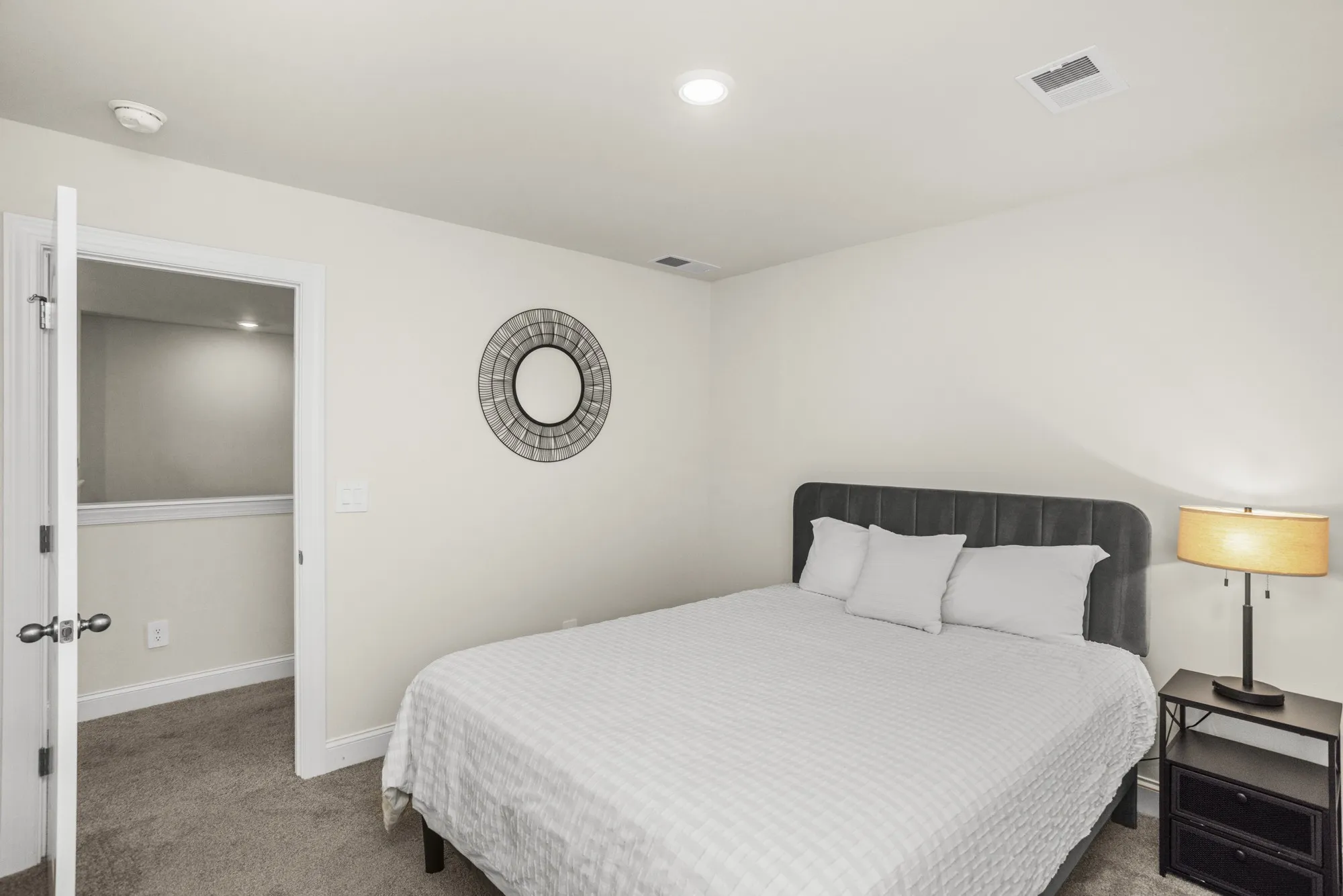 The kitchen features a large island that opens to the living area, with white cabinets, quartz countertops, oak EVP flooring, and tweed carpet.