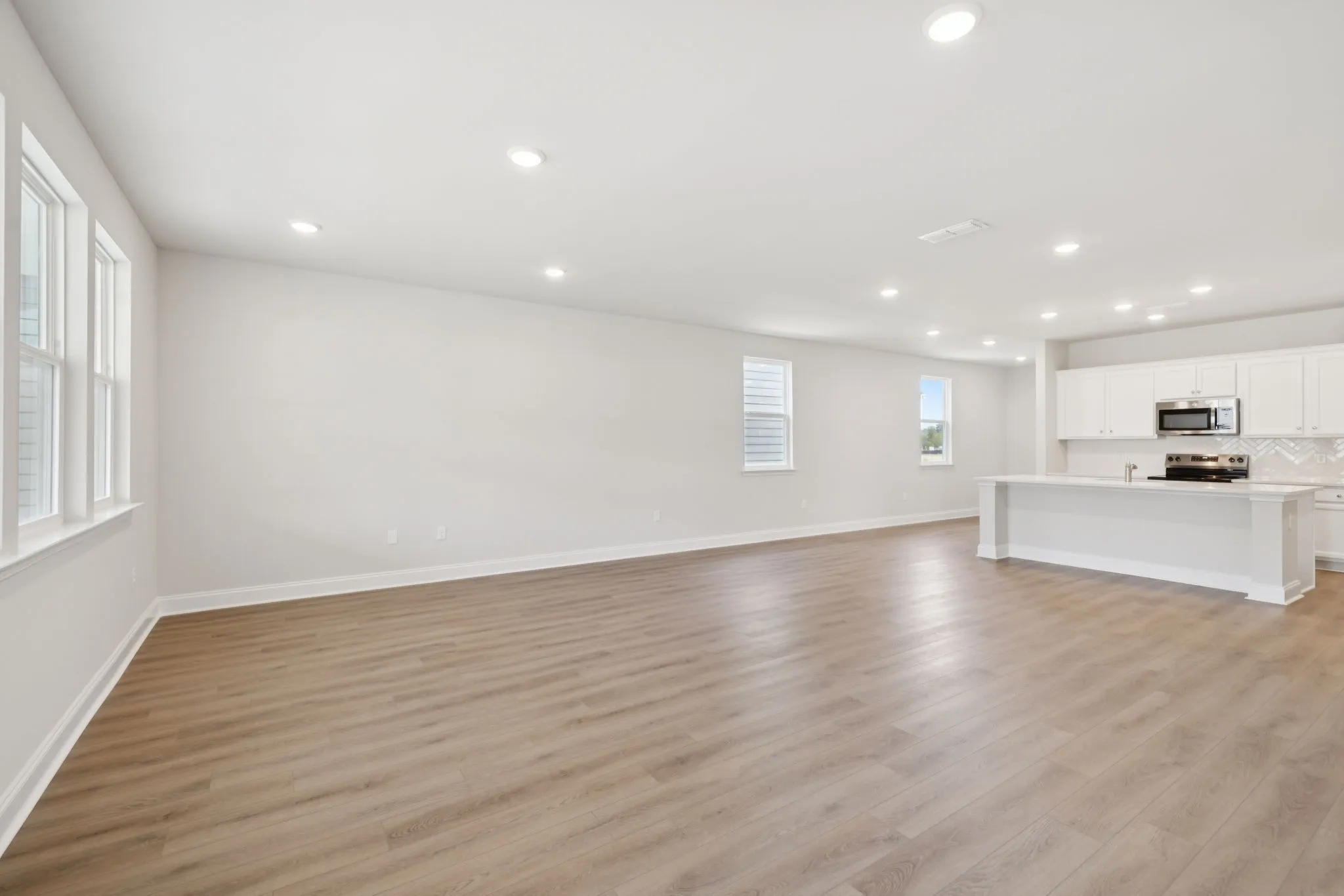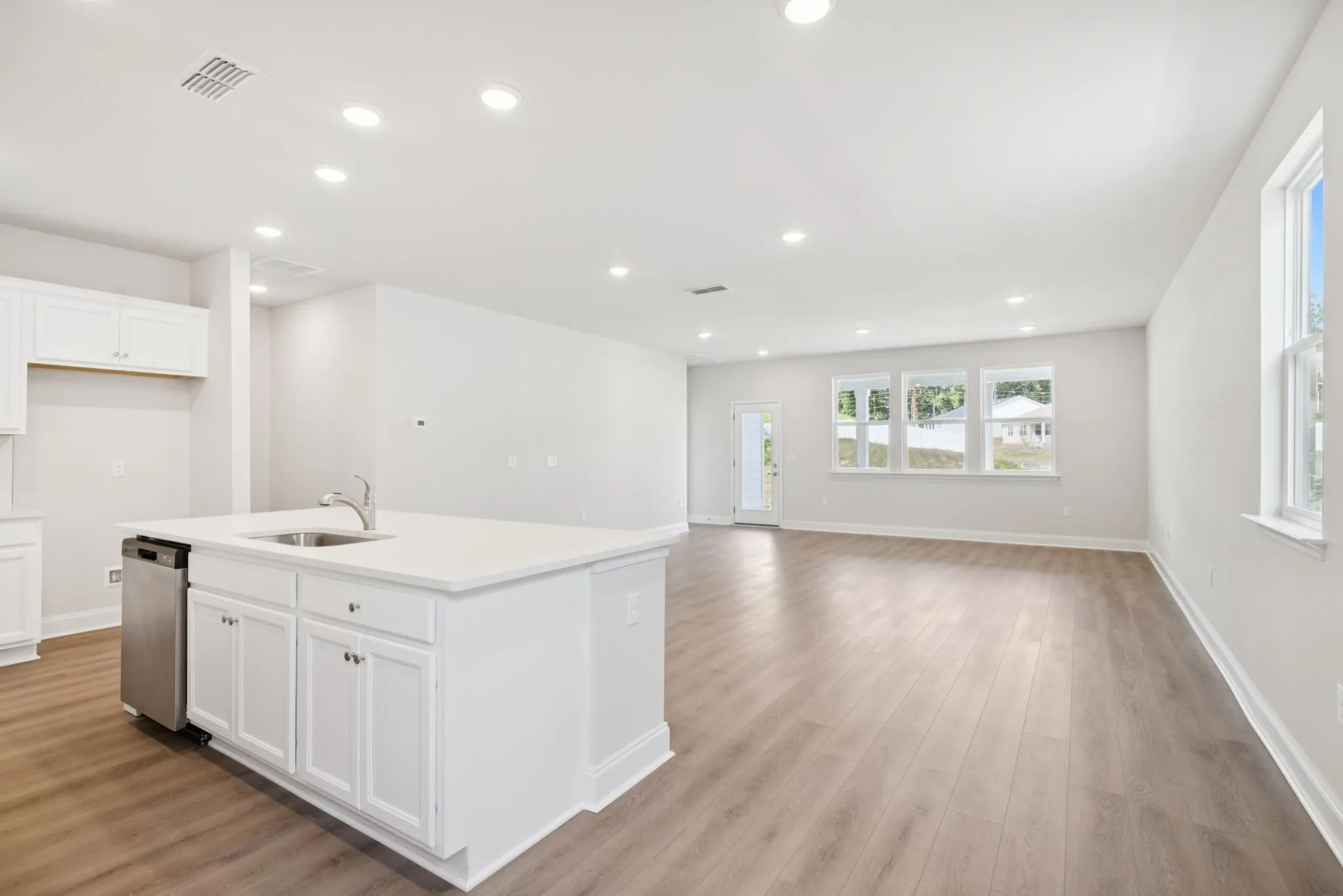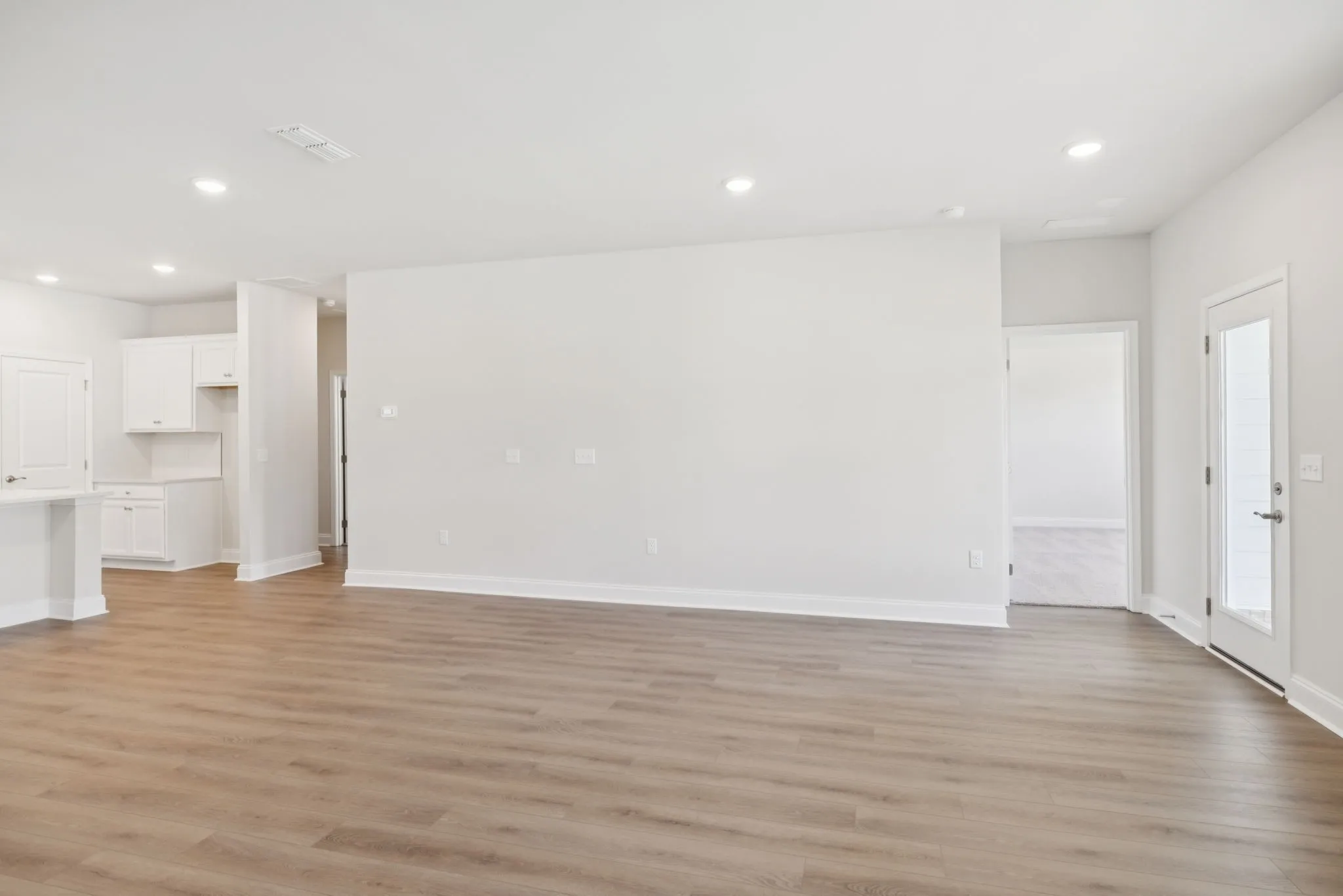 The Canvas Collection showcases quartz countertops, a herringbone tile backsplash, stainless steel appliances, and a spacious walk-in pantry. The kitchen flows into the dining area and family room, with seamless access to the rear covered patio—ideal for relaxed outdoor living.