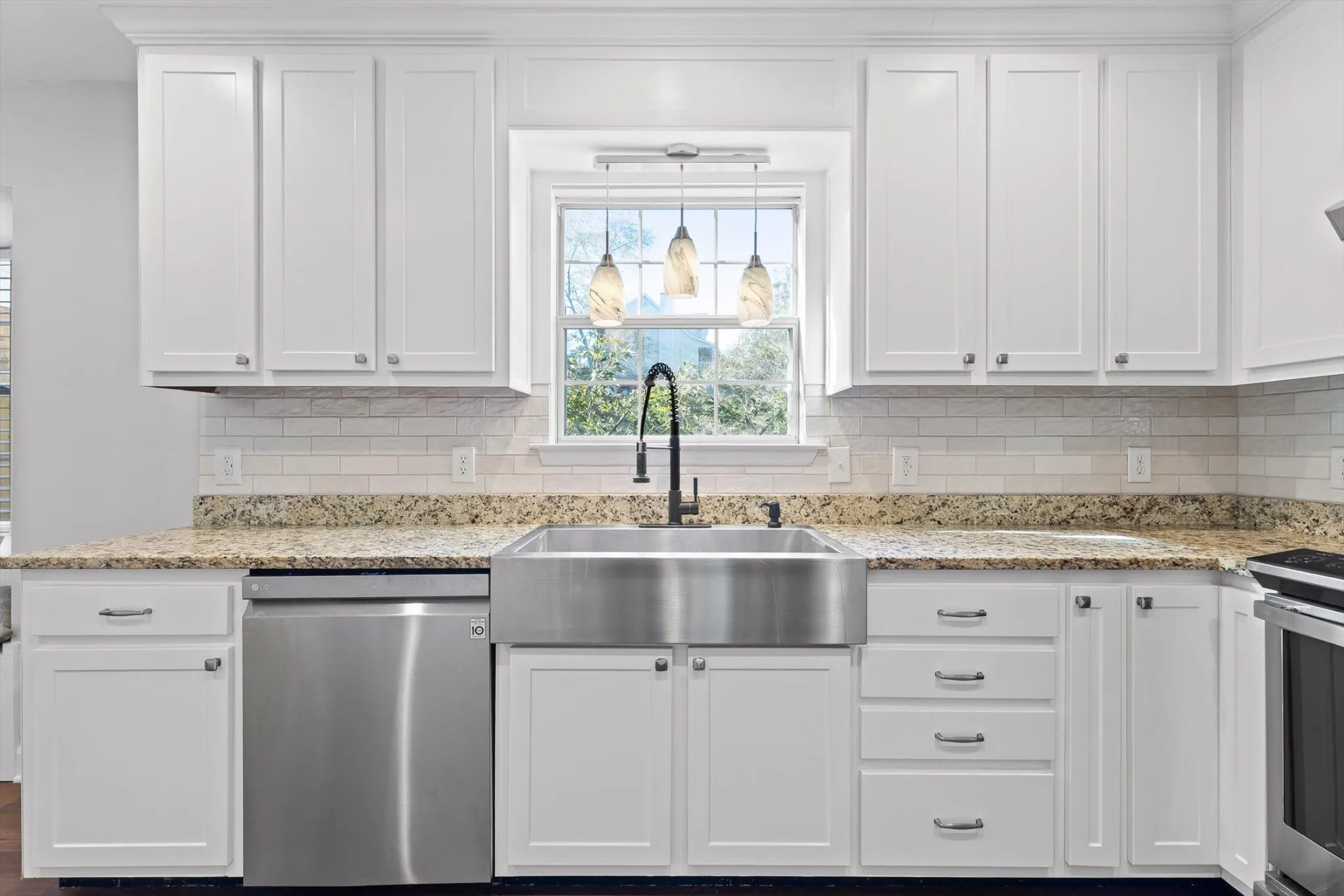 The main level offers a spacious living room with new hardwood flooring, cabinetry, and a cozy gas fireplace. The kitchen has been tastefully updated with new cabinets, backsplash, and reconfigured to create a functional pantry. The main level also offers a half bath for guests, as well as a bedroom located off the foyer.