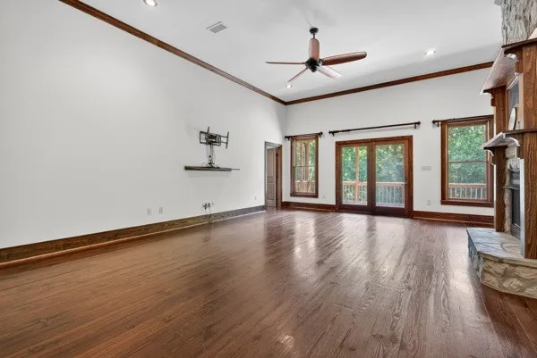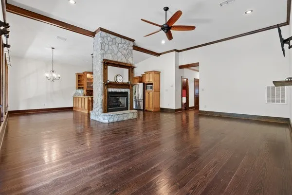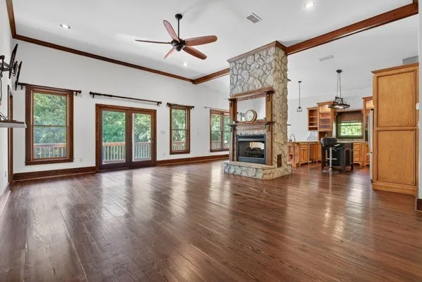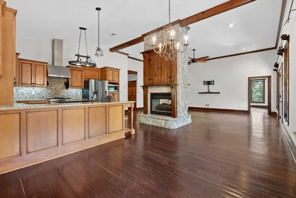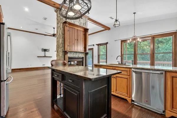 The inviting layout features a double-sided fireplace, walk-in closets, and a stunning kitchen equipped with stainless steel appliances, granite countertops, and ample cabinet space. Step outside to enjoy a large party deck—perfect for entertaining—and take advantage of the neighborhood pool located just behind the property.
