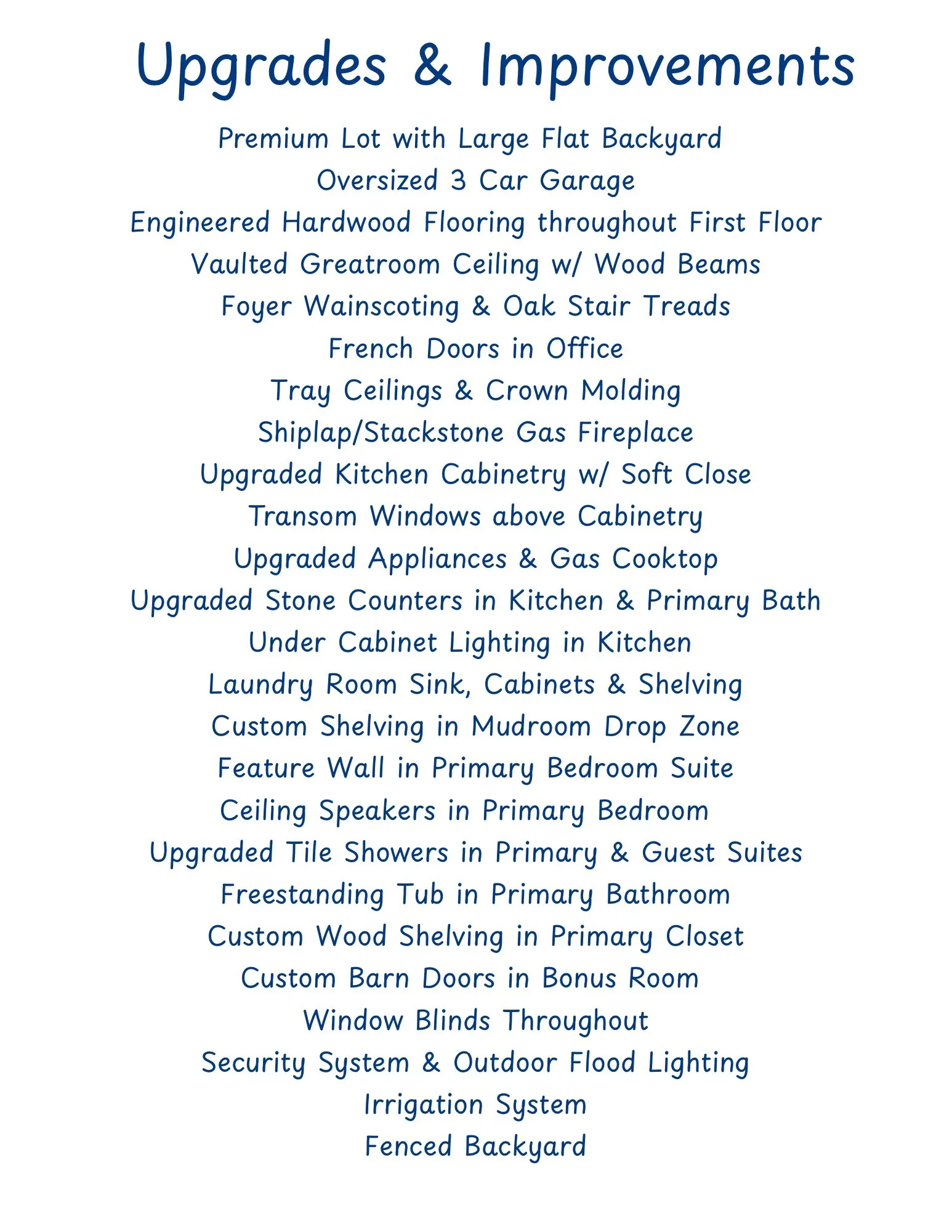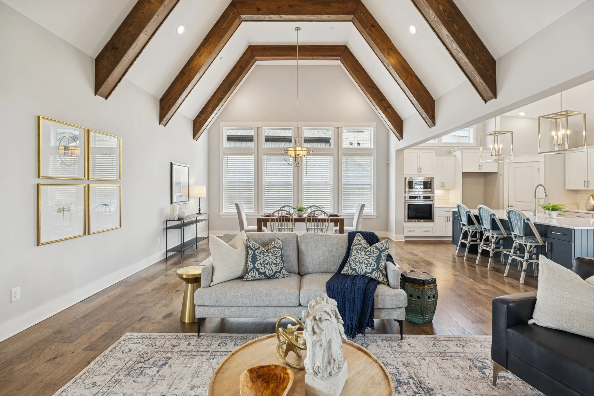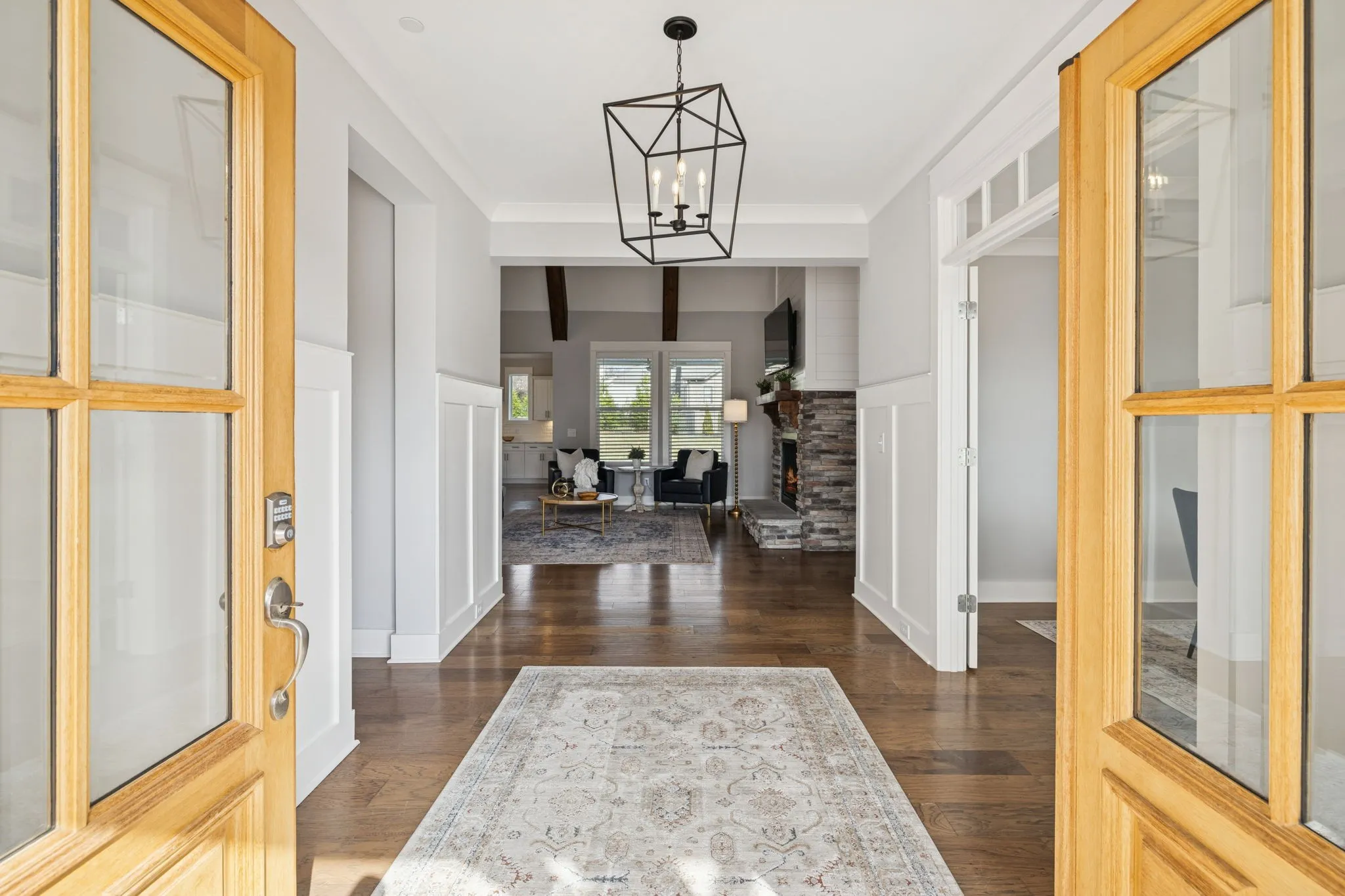 Step inside and you’ll immediately notice the gleaming hardwood floors, wainscoting, and an abundance of natural light. The chef’s kitchen is the heart of this home, featuring upgraded cabinetry, premium appliances, stunning light fixtures, under cabinet lighting and a large island perfect for entertaining or gathering with family. Open to the great room with soaring ceilings, custom beams and a welcoming fireplace. The large main-level owner’s suite with a tray ceiling, accent wall & in-ceiling speakers offers a quiet retreat with luxurious upgrades including a freestanding tub, and beautiful tile & glass shower. The guest suite, also on the main level, provides ideal accommodations for visitors or extended family with its own ensuite bath. \n