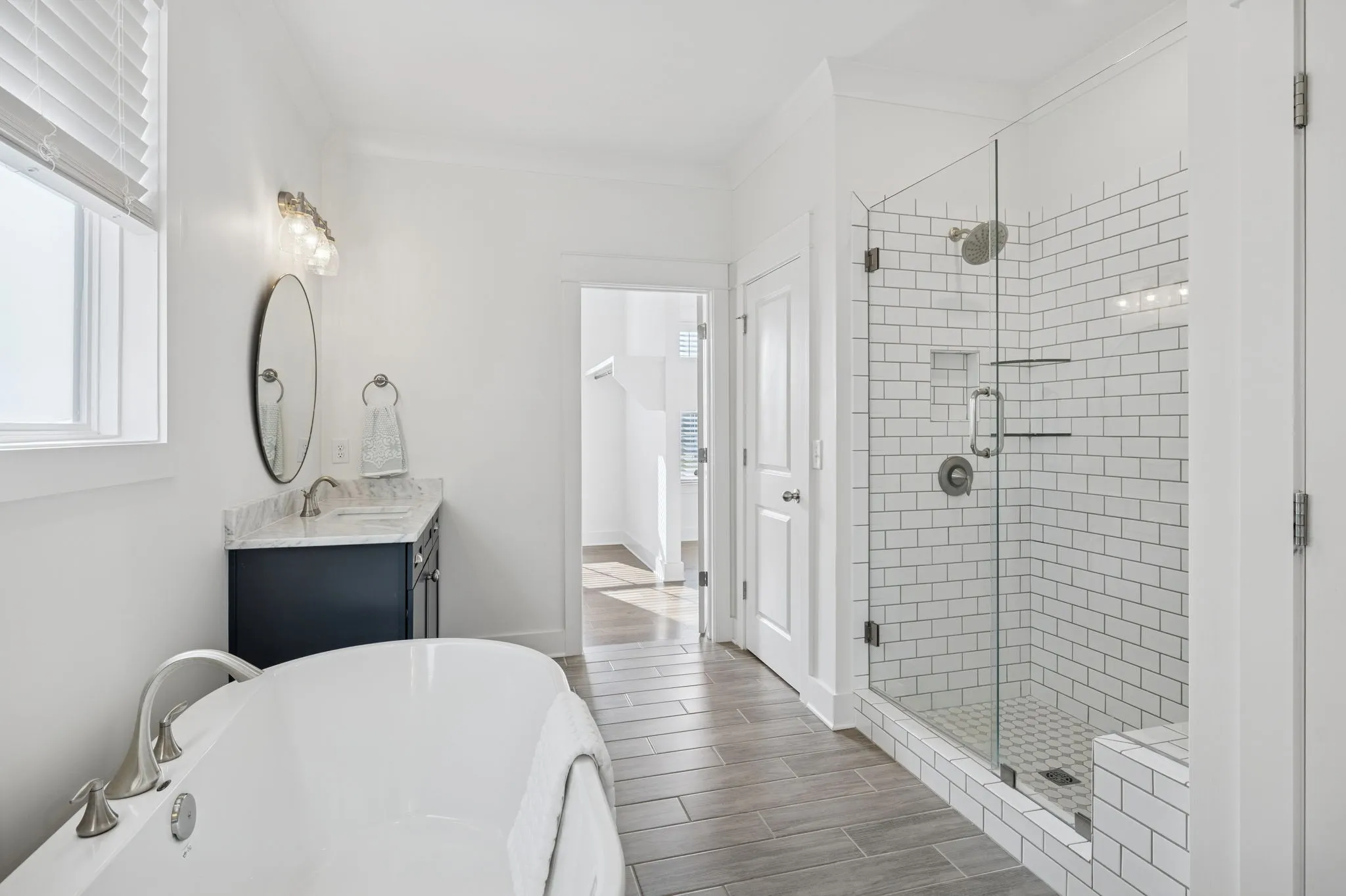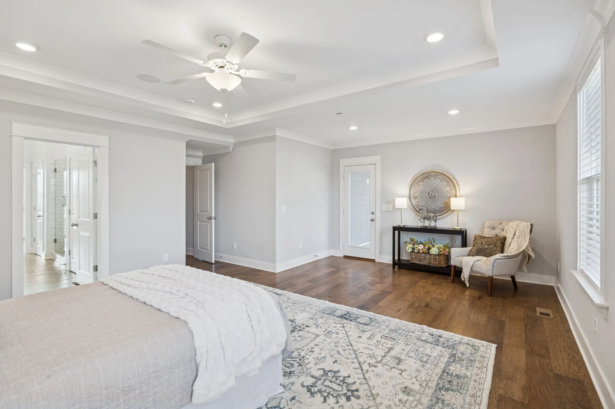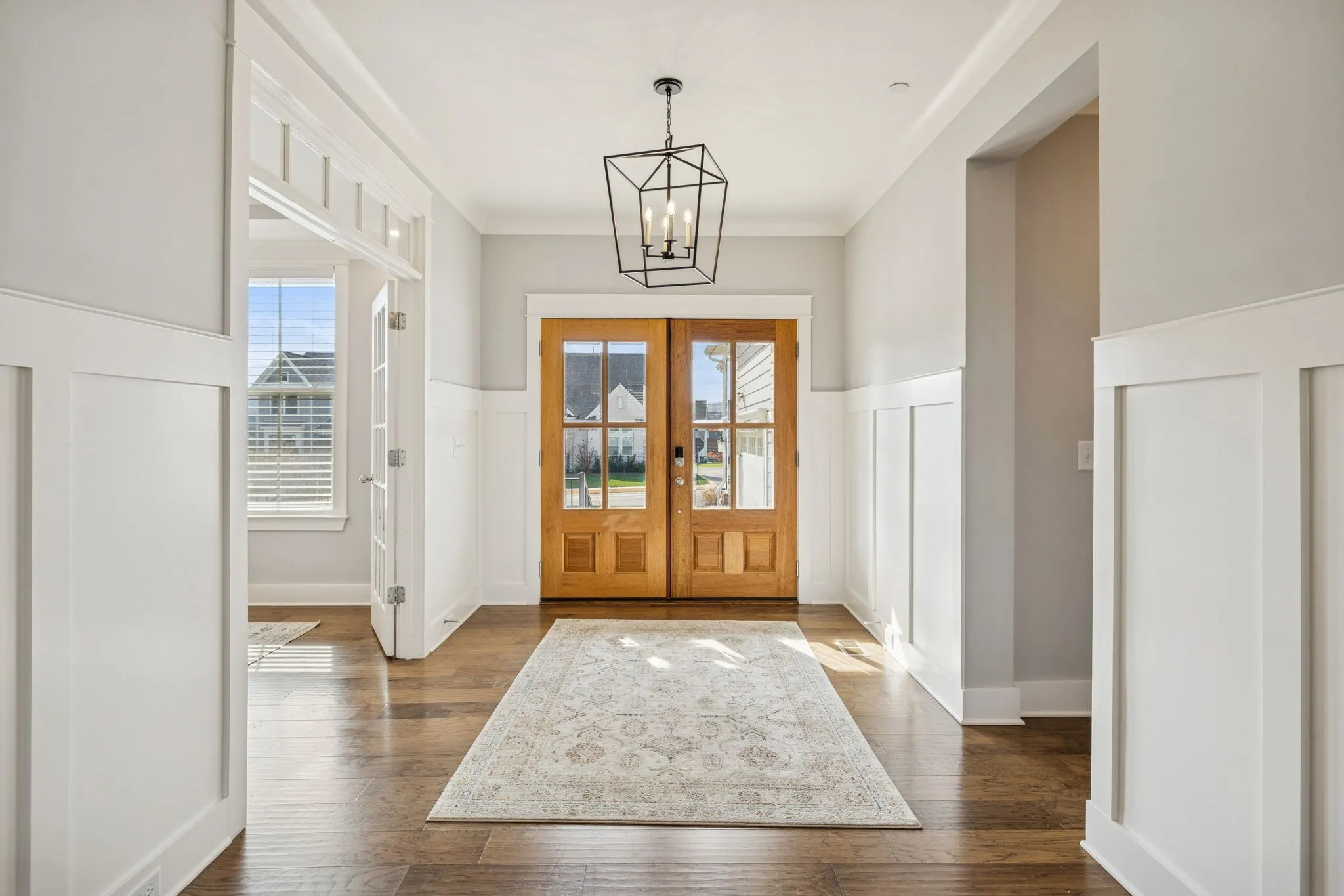 Step inside and you’ll immediately notice the gleaming hardwood floors, wainscoting, and an abundance of natural light. The chef’s kitchen is the heart of this home, featuring upgraded cabinetry, premium appliances, stunning light fixtures, under cabinet lighting and a large island perfect for entertaining or gathering with family. Open to the great room with soaring ceilings, custom beams and a welcoming fireplace. The large main-level owner’s suite with a tray ceiling, accent wall & in-ceiling speakers offers a quiet retreat with luxurious upgrades including a freestanding tub, and beautiful tile & glass shower. The guest suite, also on the main level, provides ideal accommodations for visitors or extended family with its own ensuite bath. \n