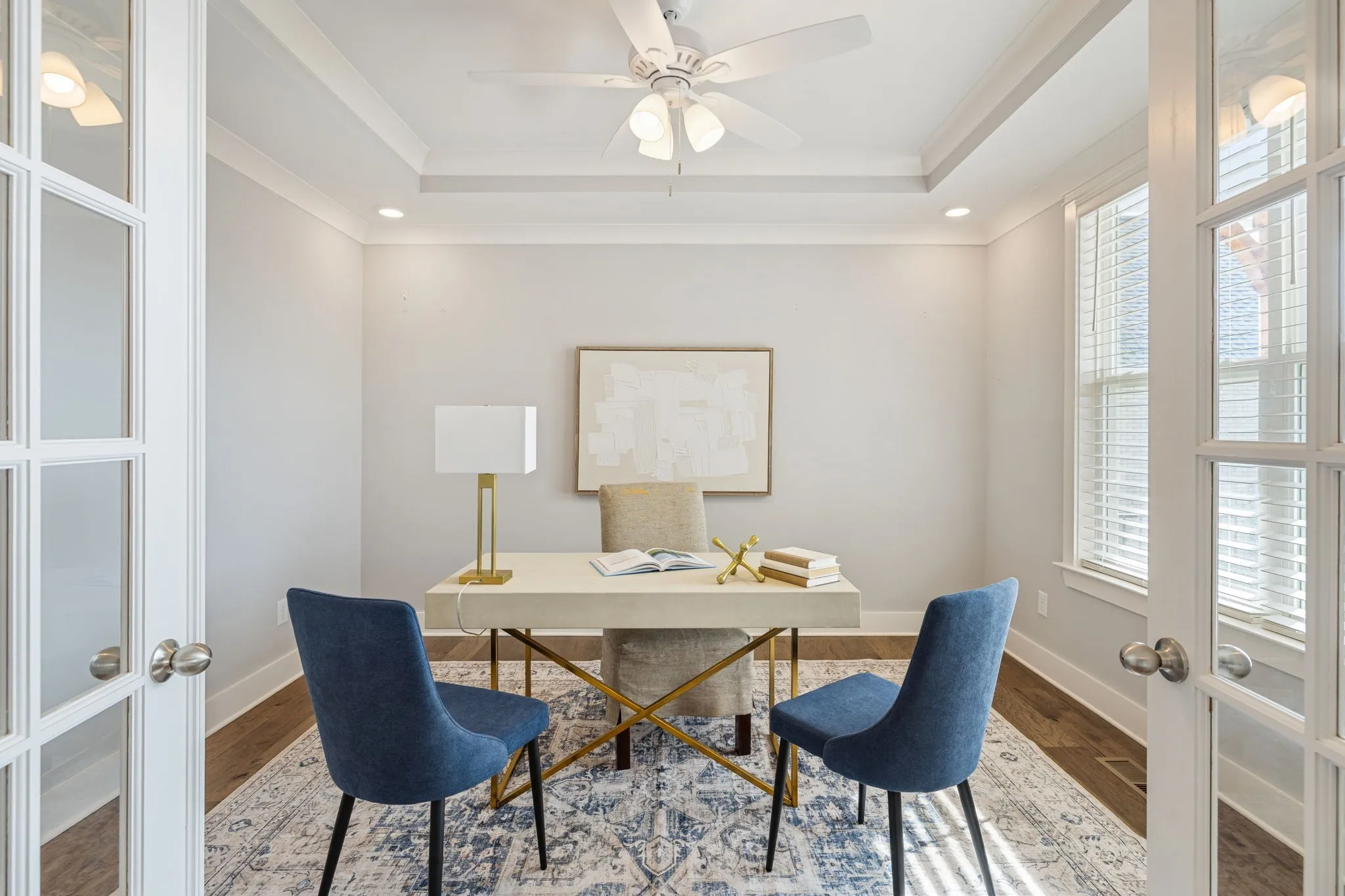 A private office with French doors provides a quiet space for working from home or creative pursuits.\n