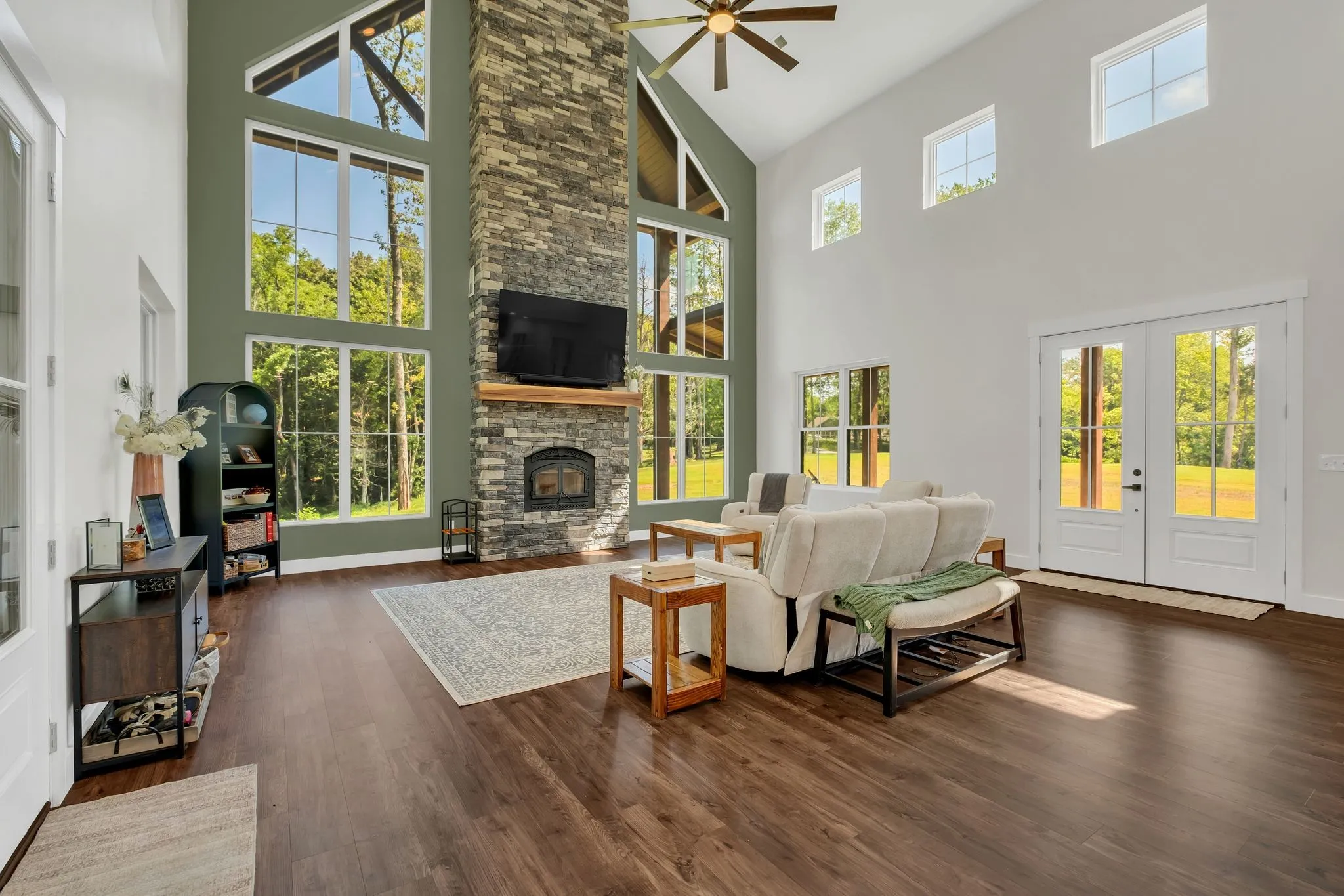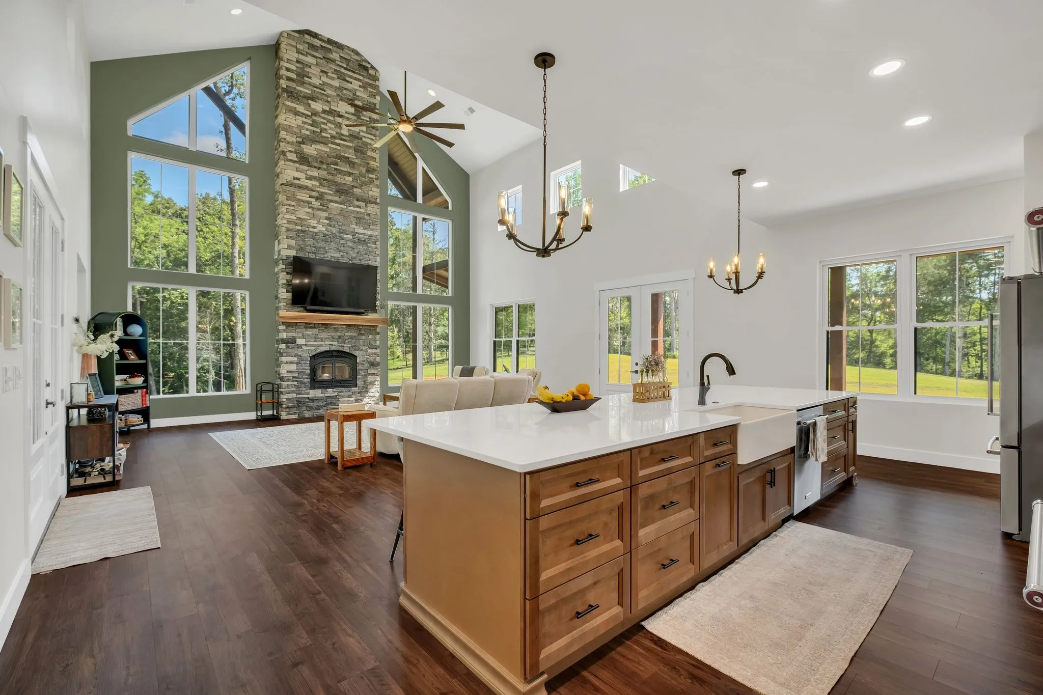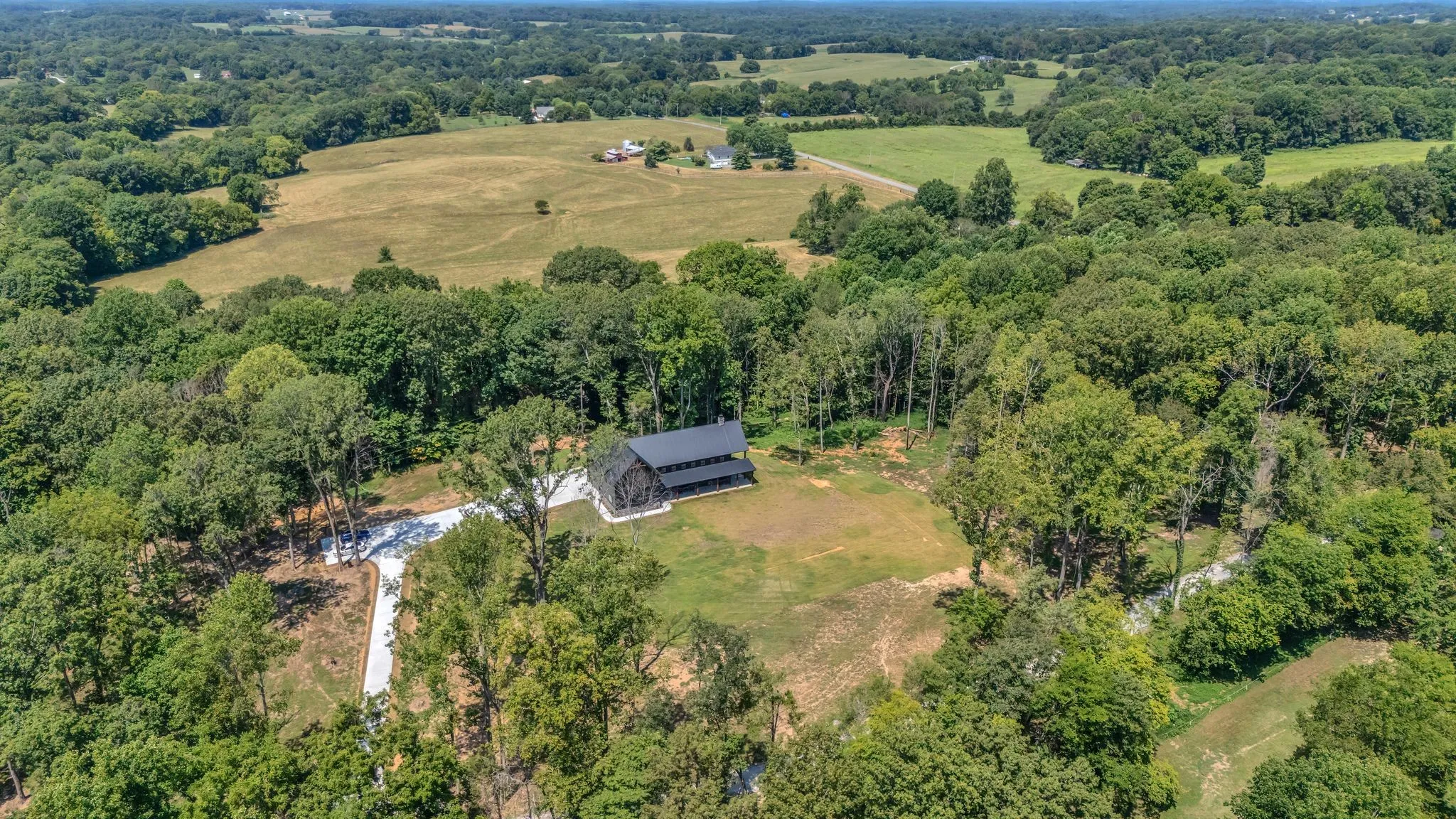 A private driveway leads to a striking modern barndominium-style home perfectly nestled in the heart of the property. This beautiful residence offers 4 bedrooms and 3.5 bathrooms, an open kitchen and living space with soaring 26-foot ceilings, and walls of windows that fill the home with natural light. The wrap-around covered porch provides panoramic views, while a two-car garage adds convenience.
