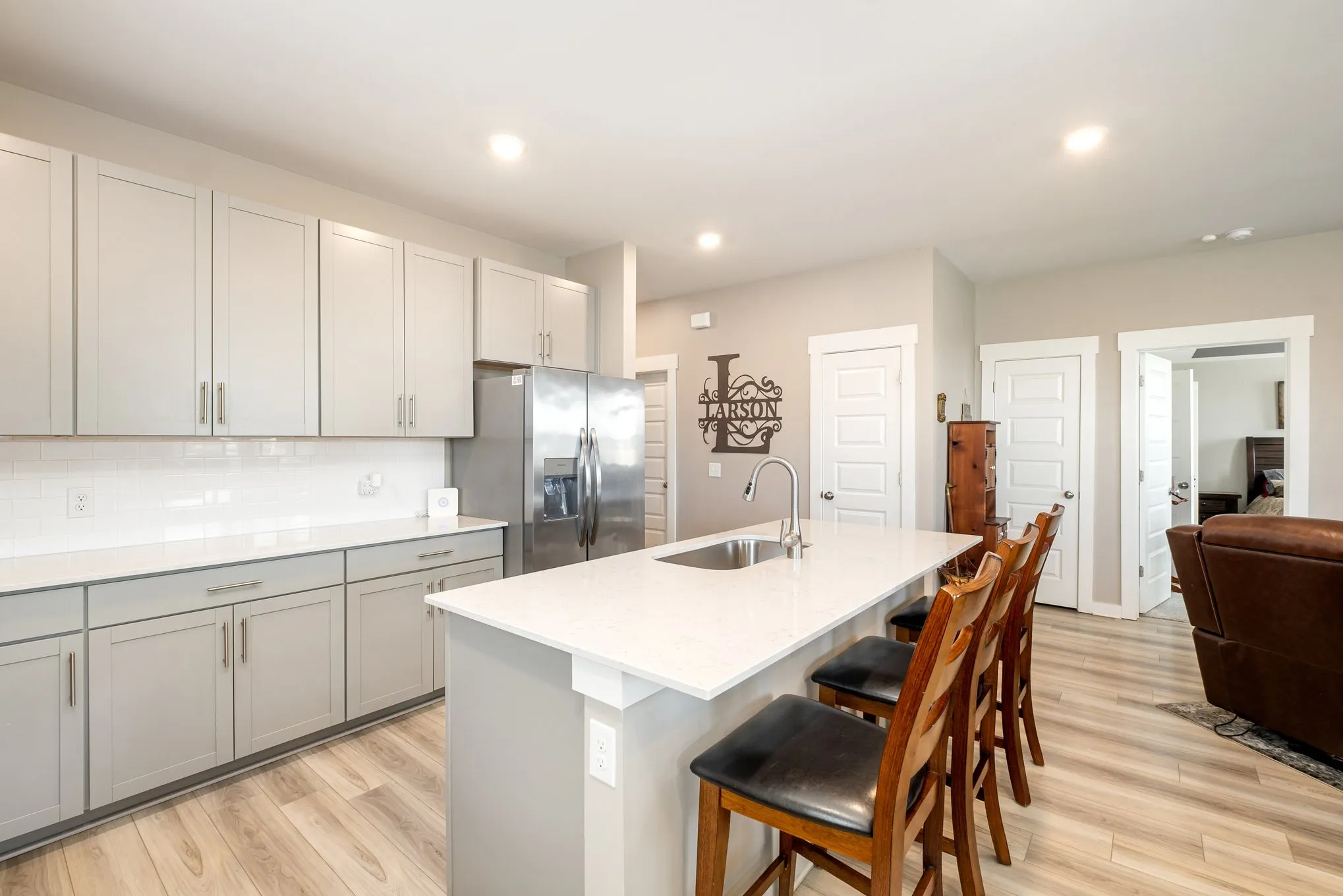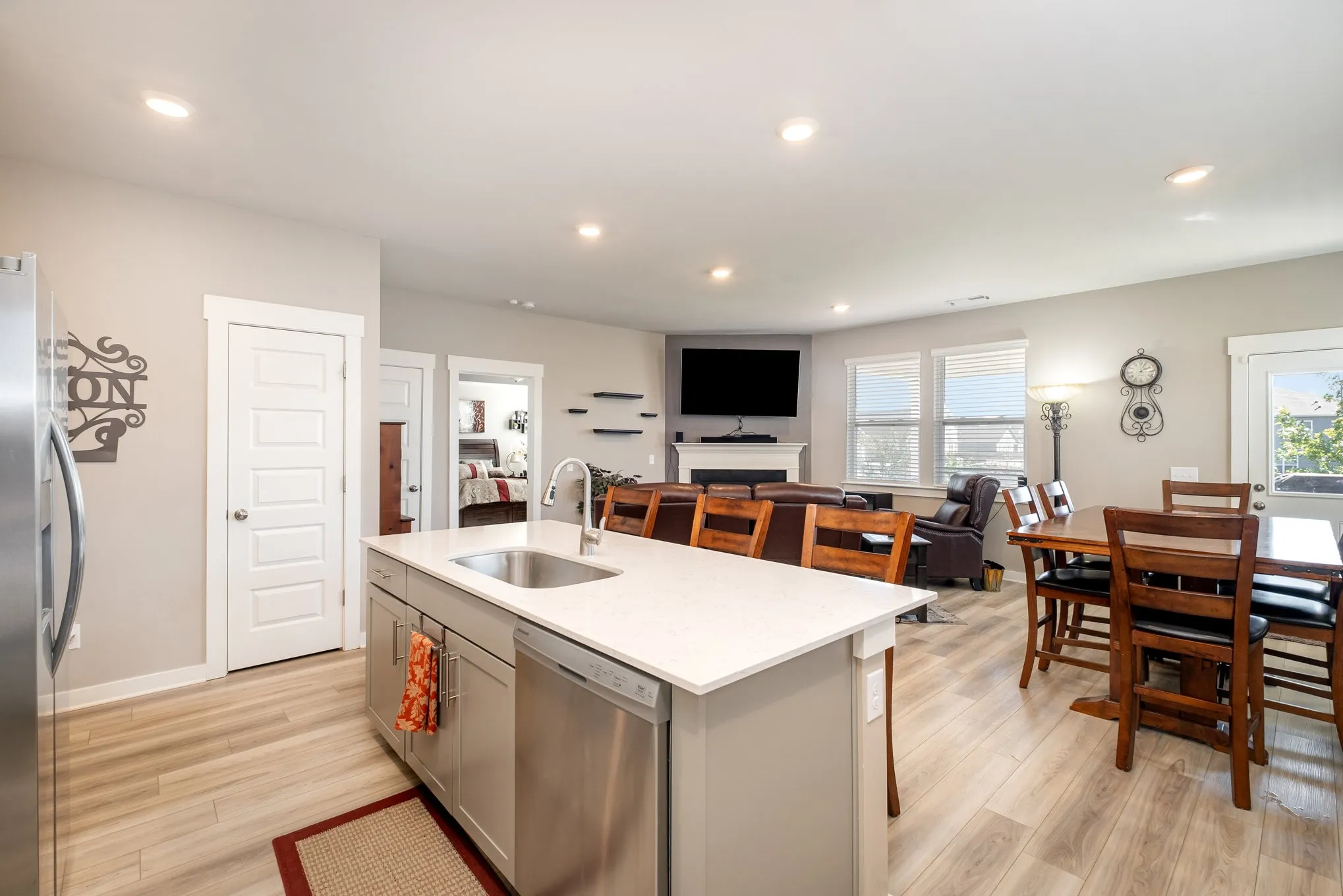 The chef’s kitchen offers quartz countertops, abundant cabinetry, and plenty of workspace — perfect for cooking, entertaining, or family gatherings.