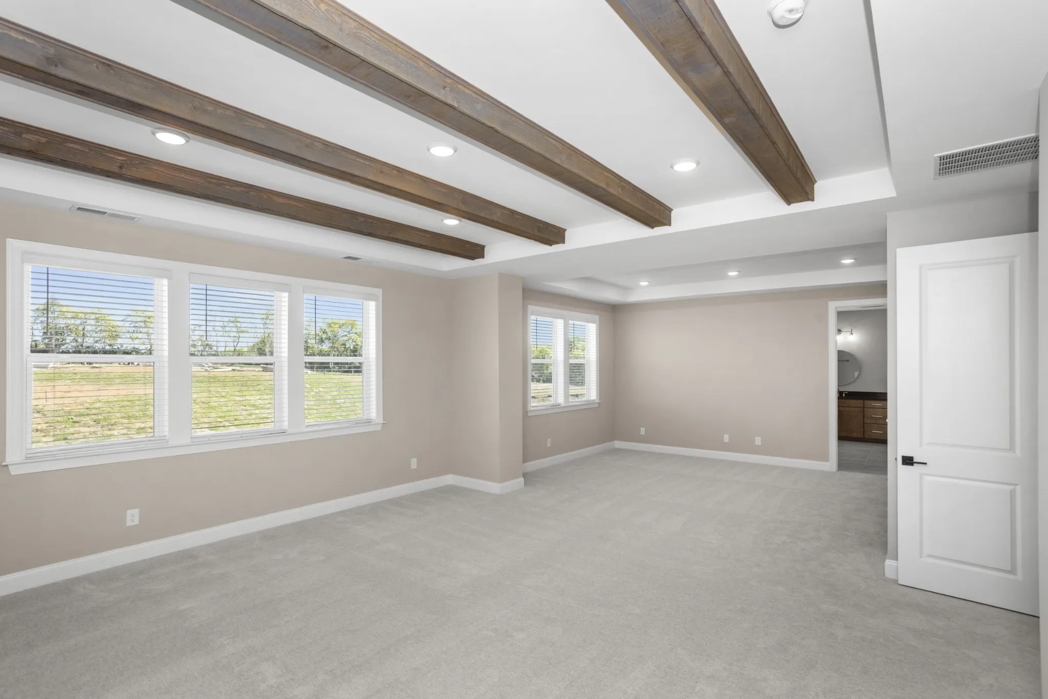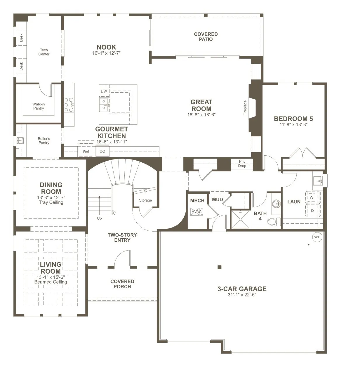 A grand two-story entry leads to an open layout with tray and beamed ceilings—perfect for festive gatherings. The gourmet kitchen, with large island and walk-in pantry, flows into a cozy breakfast nook and covered patio for holiday entertaining.