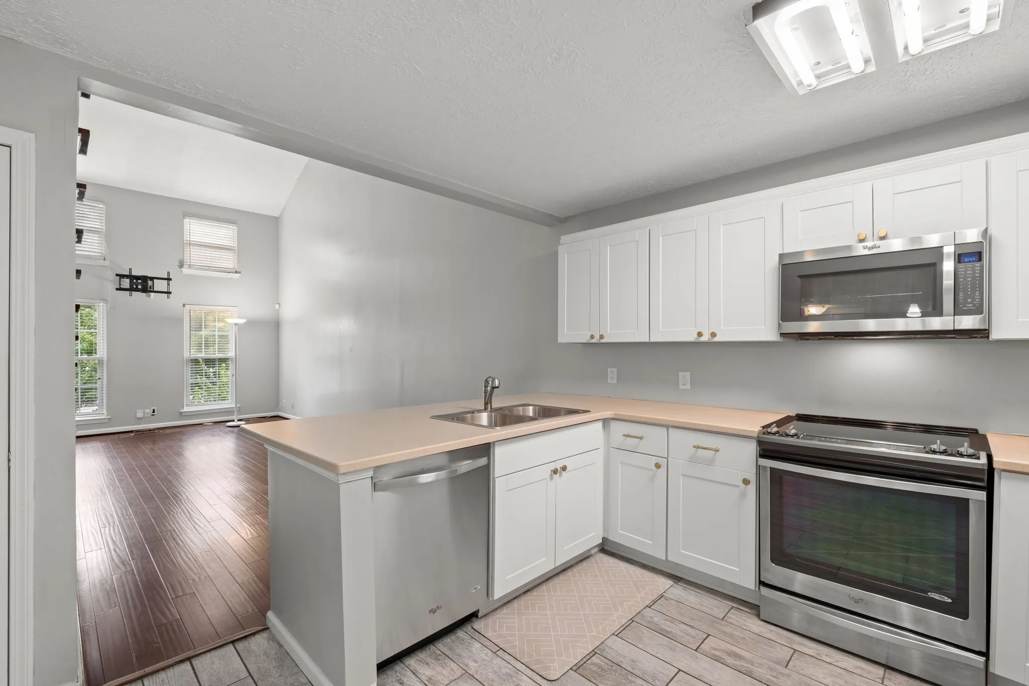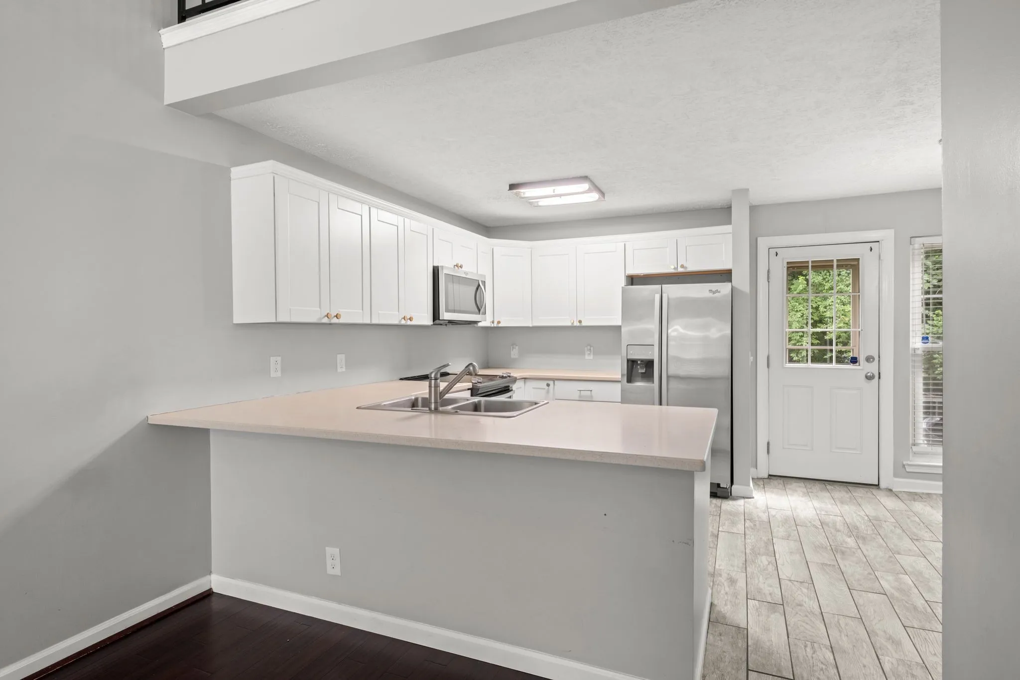 Beautiful 2 bed/2 bath townhome in a convenient location close to shopping and restaurants. Completely renovated with sand colored countertops and new cabinets with gold accents. Hardwood floors on main floor make a statement when you walk in the door! Two story living space with loft and tons of natural light. High vaulted ceilings in the living area add ambiance and a much larger feel for the area. Imagine using this loft as your home office or maybe bonus space! Has decidated driveway with ample parking. Stainless steel appliances provided as well as a washer and dryer. Wood blinds on every window remain. Backs up to wooded area for privacy. Lawn maintainence and trash pickup are included!