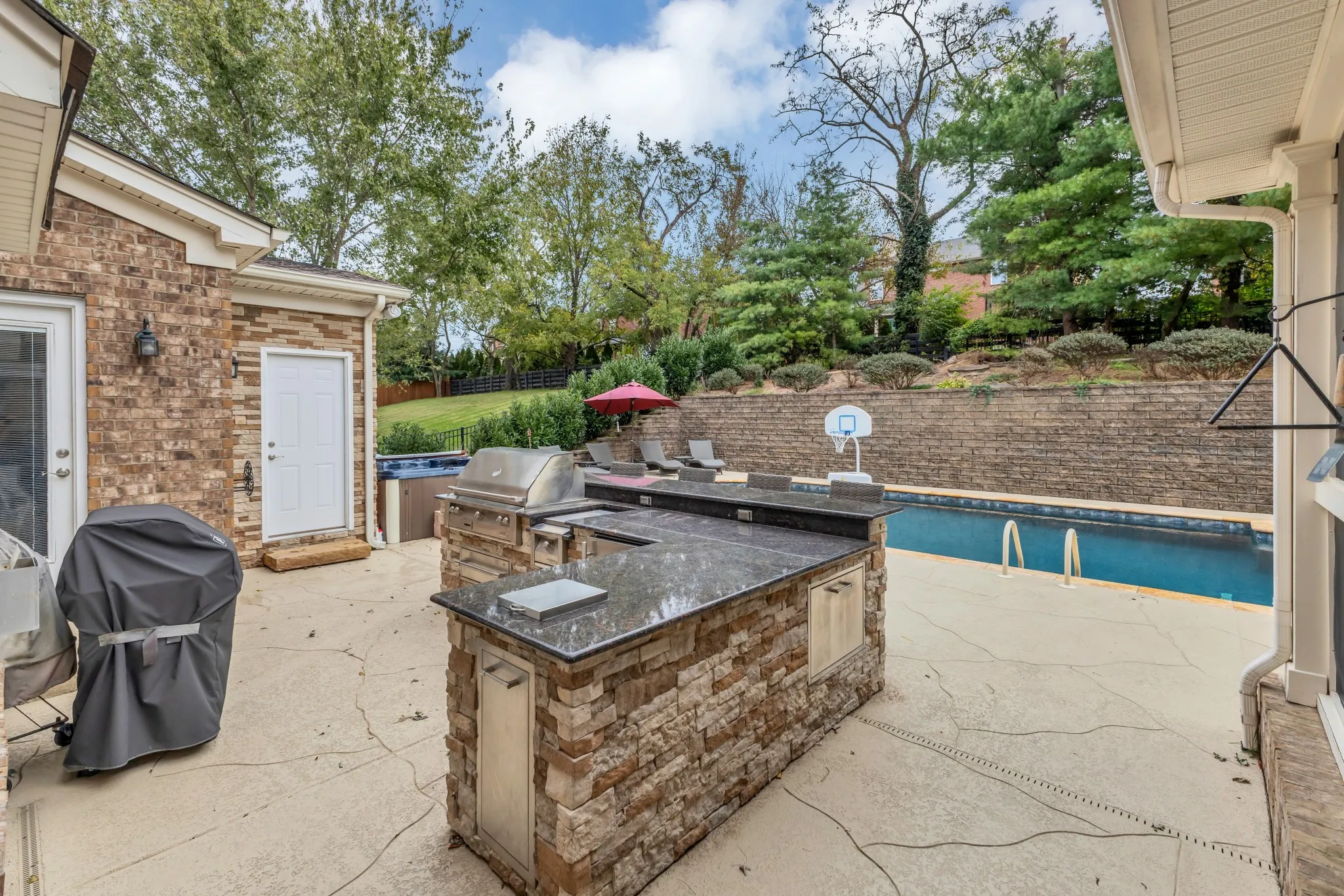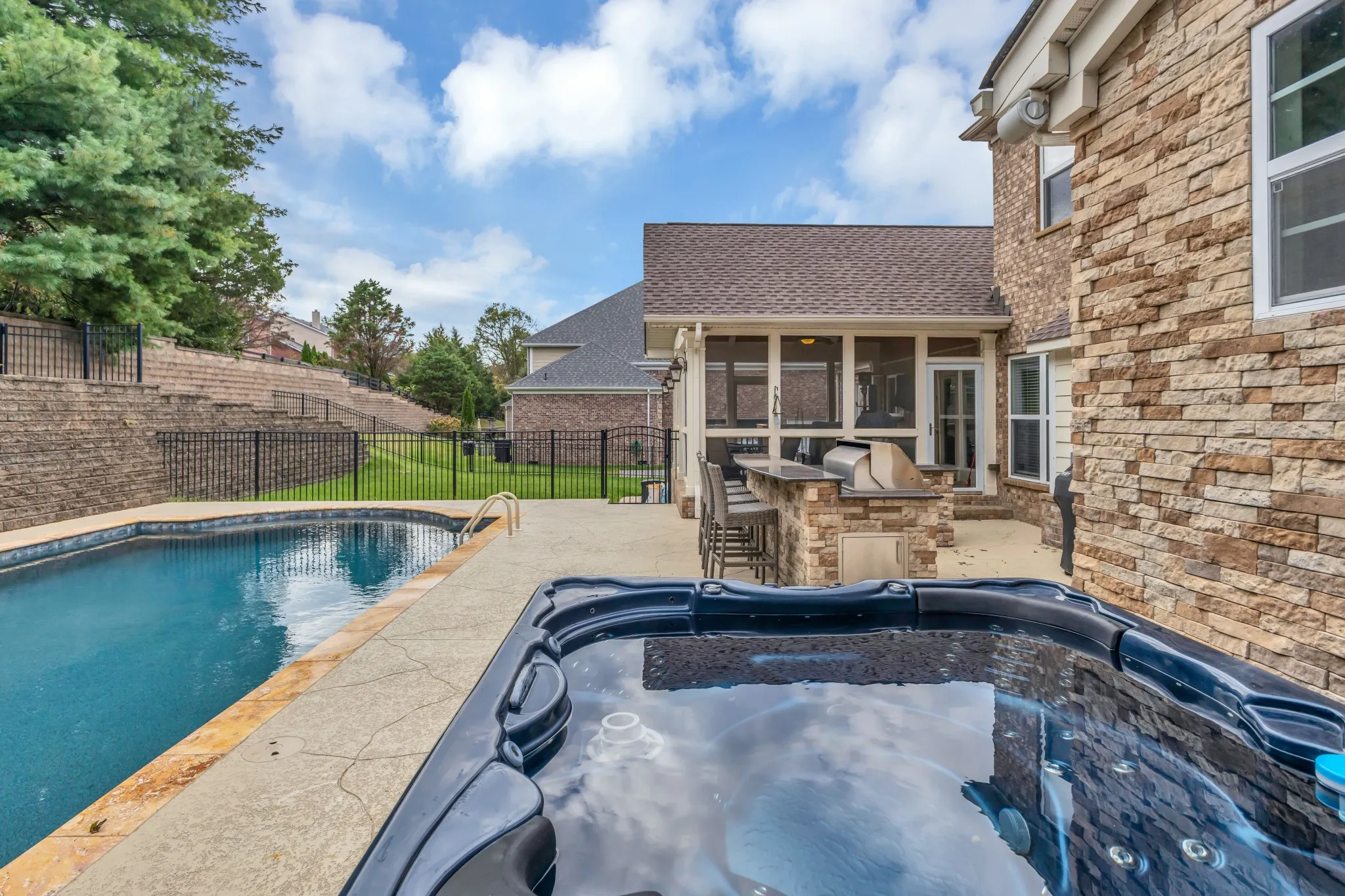 Welcome to a home that truly has it all- space, comfort and an outdoor setup made for Tennessee evenings. This home sits in one of Williamson County’s most desirable neighborhoods, offering everyday convenience with a touch of luxury. The primary suite on the main level is a private retreat with a custom walk in closet and a renovated bath featuring dual vanities, ceramic tile floor and a stunning tiled walk in shower. The updated kitchen includes Stainless Steel appliances, induction cooktop, Viking hood, built in wine fridge and 240V Advantium microwave. The spacious kitchen island brings everyone together for family dinners and weekend gatherings. Real hardwoods run throughout the main level and a built in office nook adjacent to the kitchen provides an ideal spot for work or study. Upstairs, you’ll find a large bonus room and three generous bedrooms with spacious closets. Main level features a private study. The back yard is where this home really shines– a gunite/PebbleTec pool, outdoor kitchen with grill, fridge, storage and bar area and beautiful hardscaping designed for effortless entertaining. Whether it’s a backyard BBQ, or a quiet night by the pool, this space delivers year round enjoyment. 2 year old Architectural shingle roof. Home has Central Vac throughout. The neighborhood features walking trails, tennis and pickeball courts and a community pool all within walking distance of shopping and dining. With easy access to I-65, you’re minutes to Cool Springs, Brentwood and Nashville.