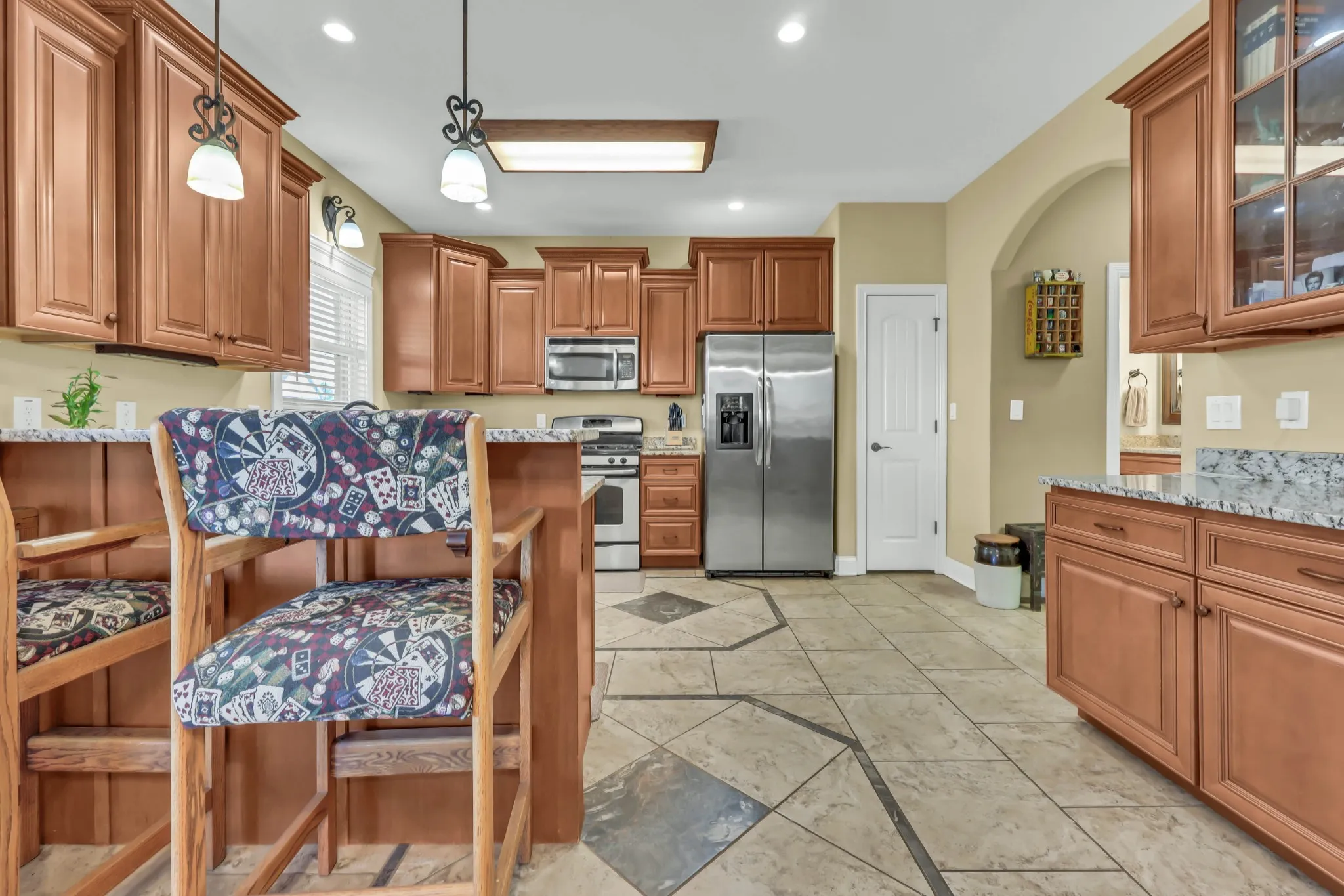 Inside, you will find elegant tile and hardwood floors throughout with no carpet, grand eight foot doors, and an open layout filled with natural light. The kitchen features granite countertops, under cabinet lighting, a gas stove, and seamless flow to the dining and living areas. Granite continues in the bathrooms and laundry room, which also includes a convenient wash sink. Each bedroom is equipped with recessed lighting and ceiling fans for year-round comfort.
