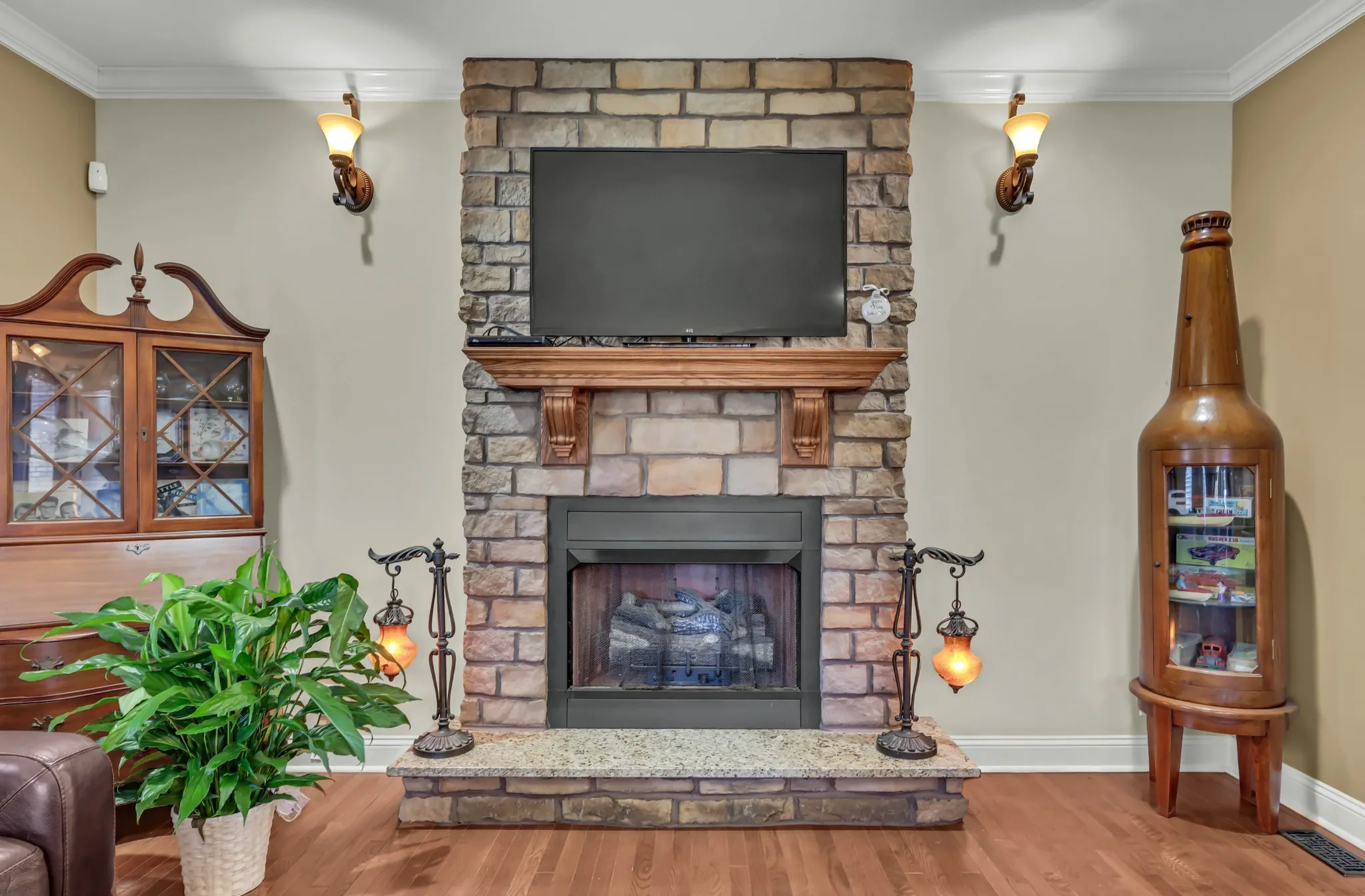 The home is wired for a music and intercom system, a First Alert alarm system, and includes emergency lighting for added peace of mind. The primary suite offers a jacuzzi hot tub, and the spacious bonus room features a wet bar ideal for entertaining or relaxing. With full brick and stone construction and no vinyl, every detail reflects quality and timeless design.