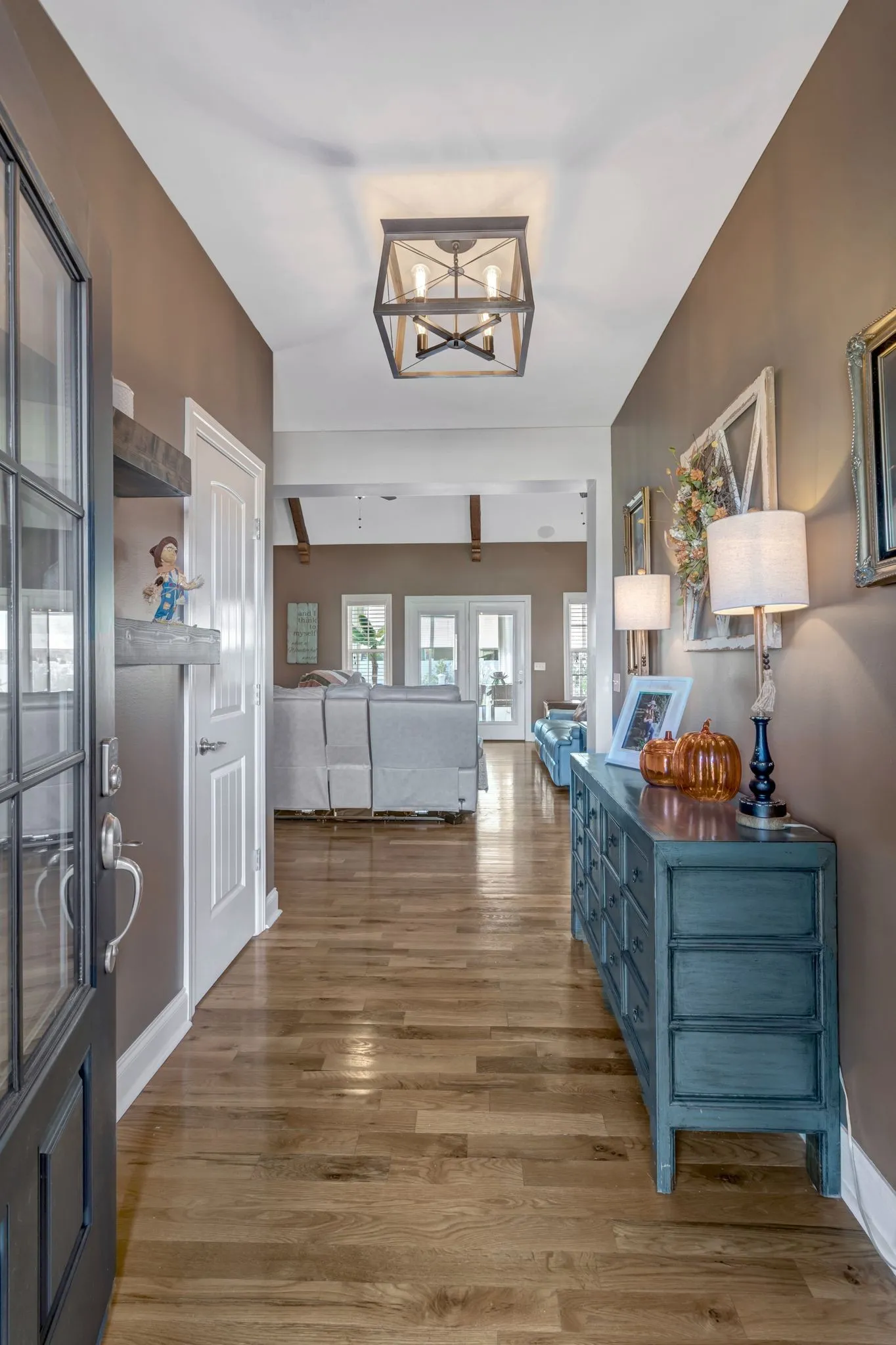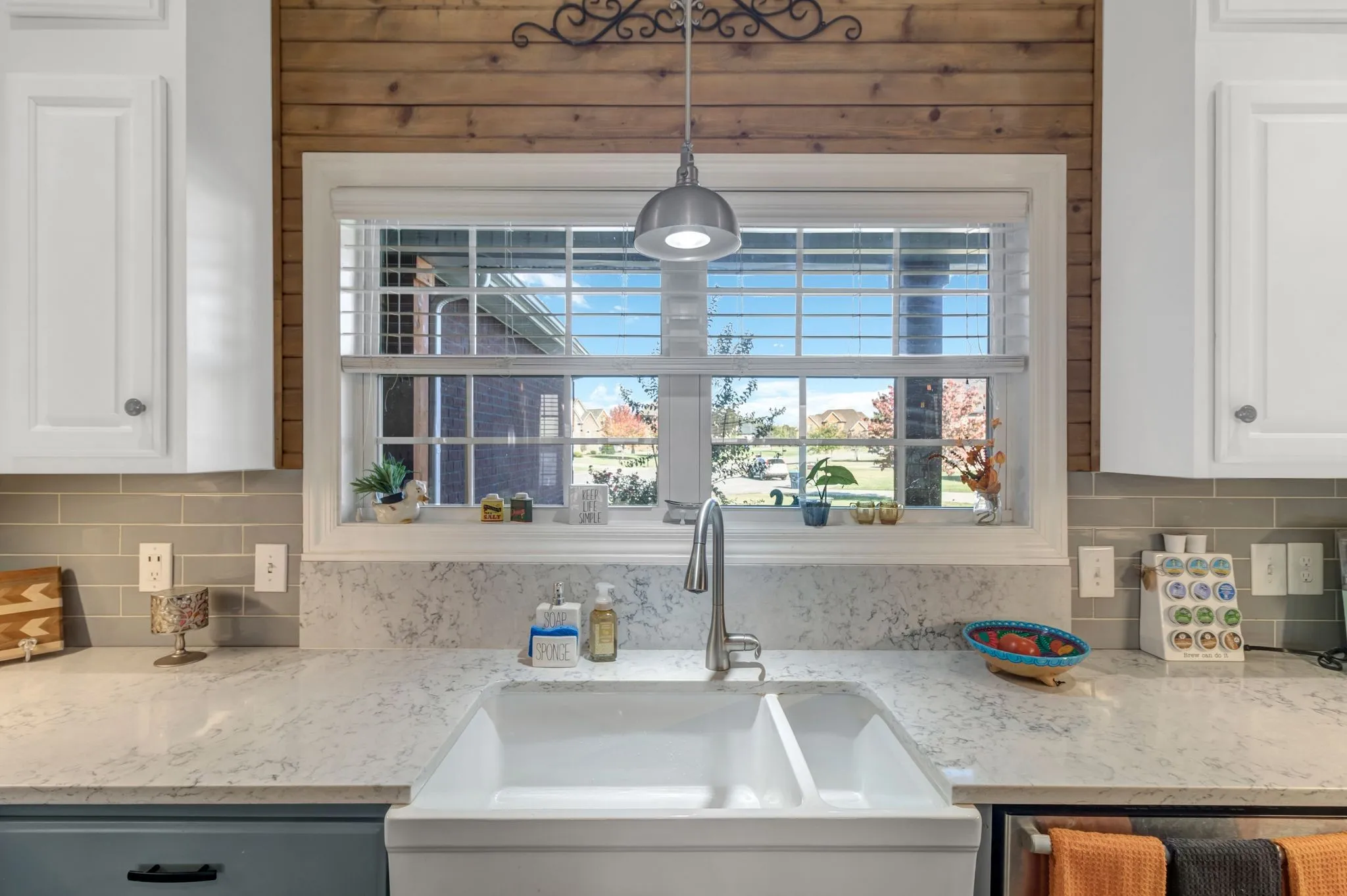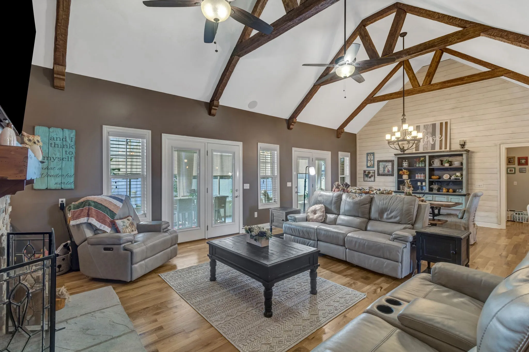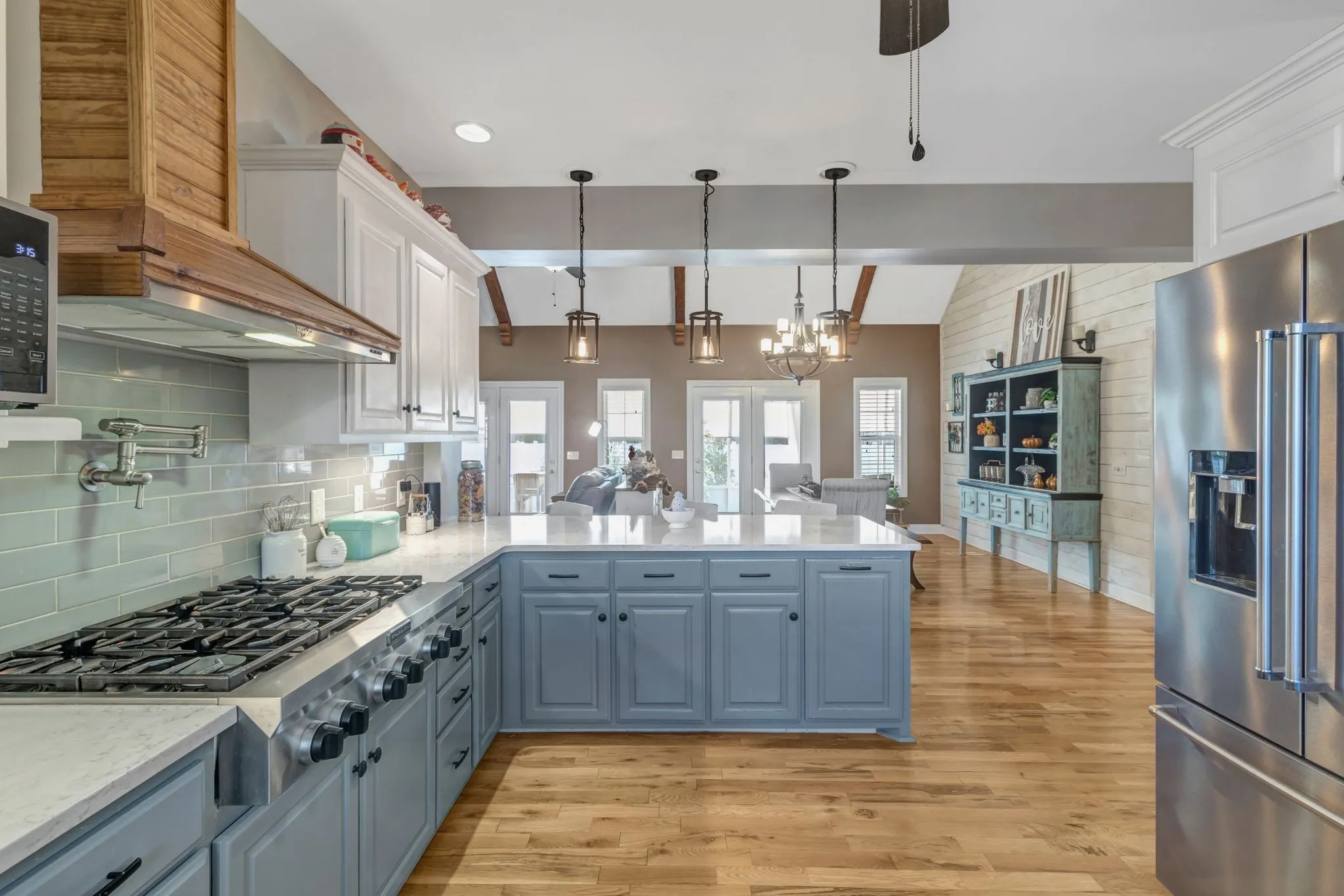 Beautifully renovated with designer finishes throughout. The kitchen features quartz countertops, double ovens, gas cooktop, pot filler, and upgraded appliances. Open living area with exposed beams, shiplap accents, and built-ins flanking a stacked stone wood-burning fireplace.